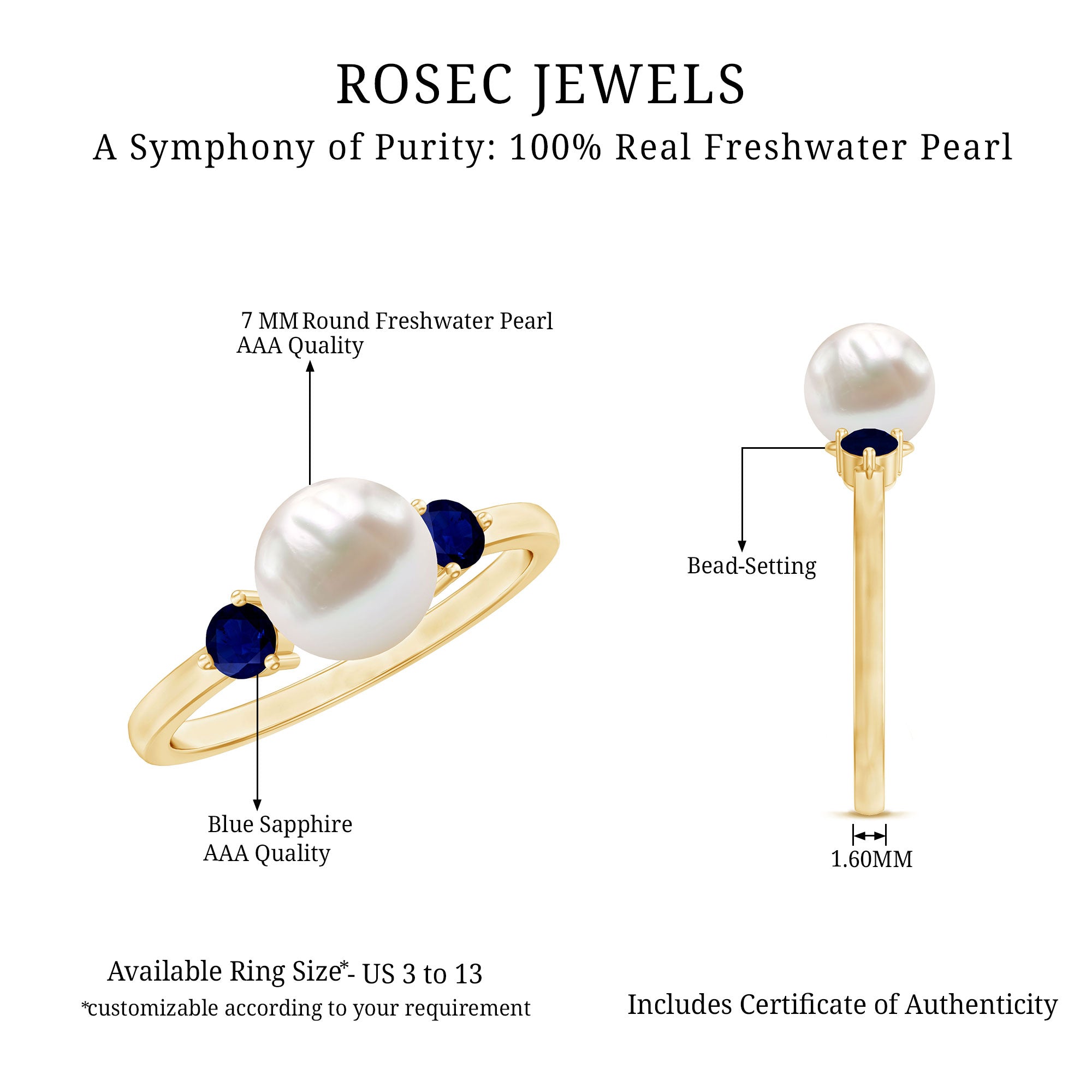 A Forever One Round Cut Freshwater Pearl gem glamorously updates this Solitaire Engagement Ring. Set in gleaming Gold, round cut blue sapphire on both side of the center stone make it a perfect Engagement Ring, brilliantly paving the way to everlasting love. Make her eyes glitter with our new Freshwater Pearl Engagement Ring.