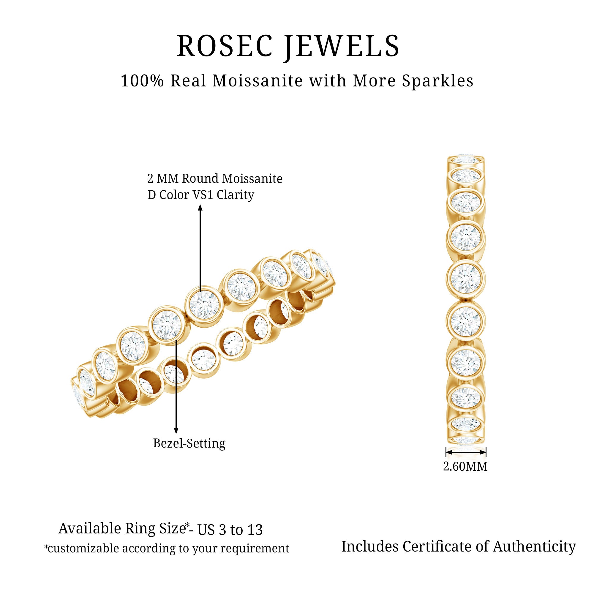 Never-ending sparkle meets timeless meaning in this beautifully crafted Moissanite Eternity Ring. Designed with a continuous circle of round brilliant cut moissanite stones set in bezel setting, the Full Eternity Ring symbolizes forever love, unity, and unbreakable bonds. Each moissanite shines with D Color and VS1 clarity, giving the band a glowing, eye-catching look from every angle. The bezel setting not only enhances the shine but also adds a secure and modern touch to the design. Whether worn alone for a minimalist feel or stacked with other rings, this Moissanite Stackable Ring offers a refined and elegant look. Perfect for someone who enjoys classic beauty with a sleek twist, it brings together simplicity, style, and symbolism in one thoughtful piece. Ideal for weddings, anniversaries, birthdays, or just because, it marks life’s special moments with elegance and love. Crafted with care and built for comfort, this Moissanite Wedding Band is available in US ring sizes 3 to 13 to ensure a perfect fit. Delivered in a luxury jewelry box, ready to be gifted or kept as a personal treasure.