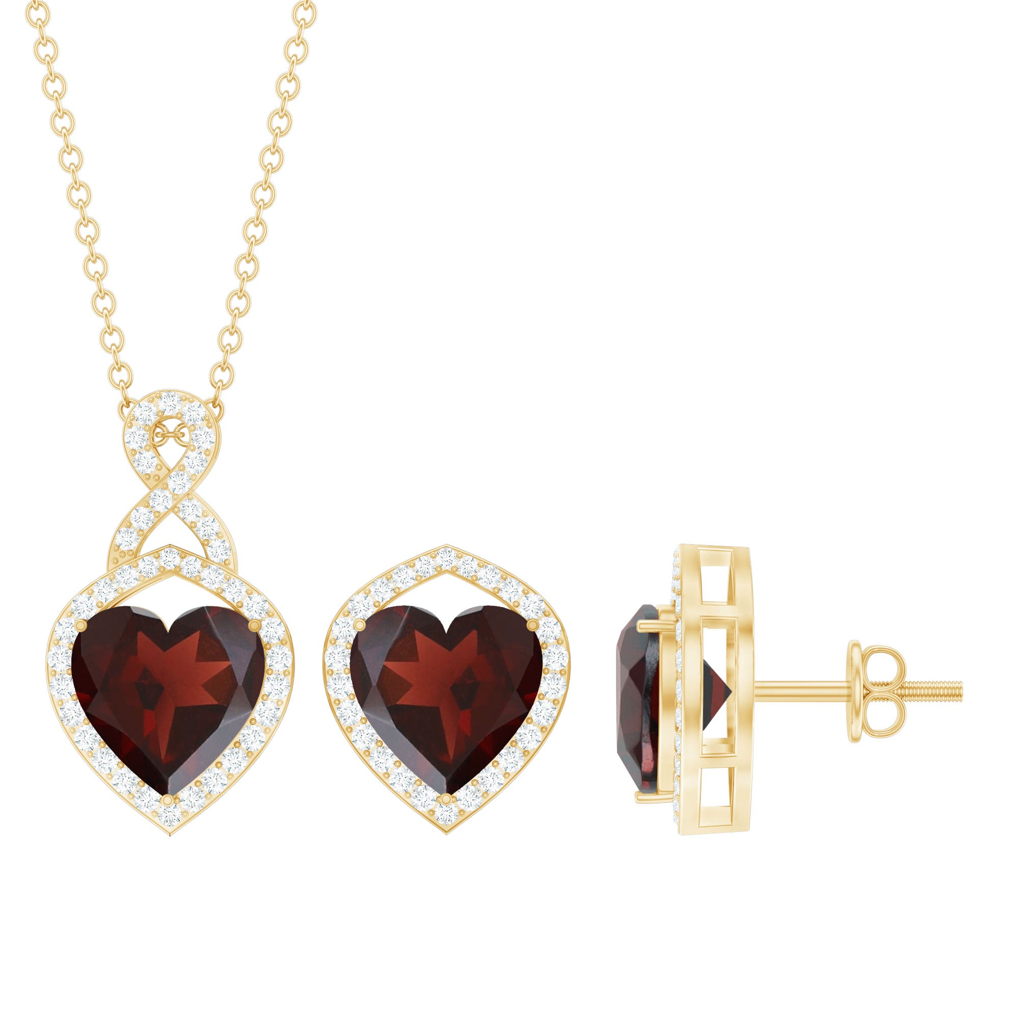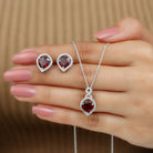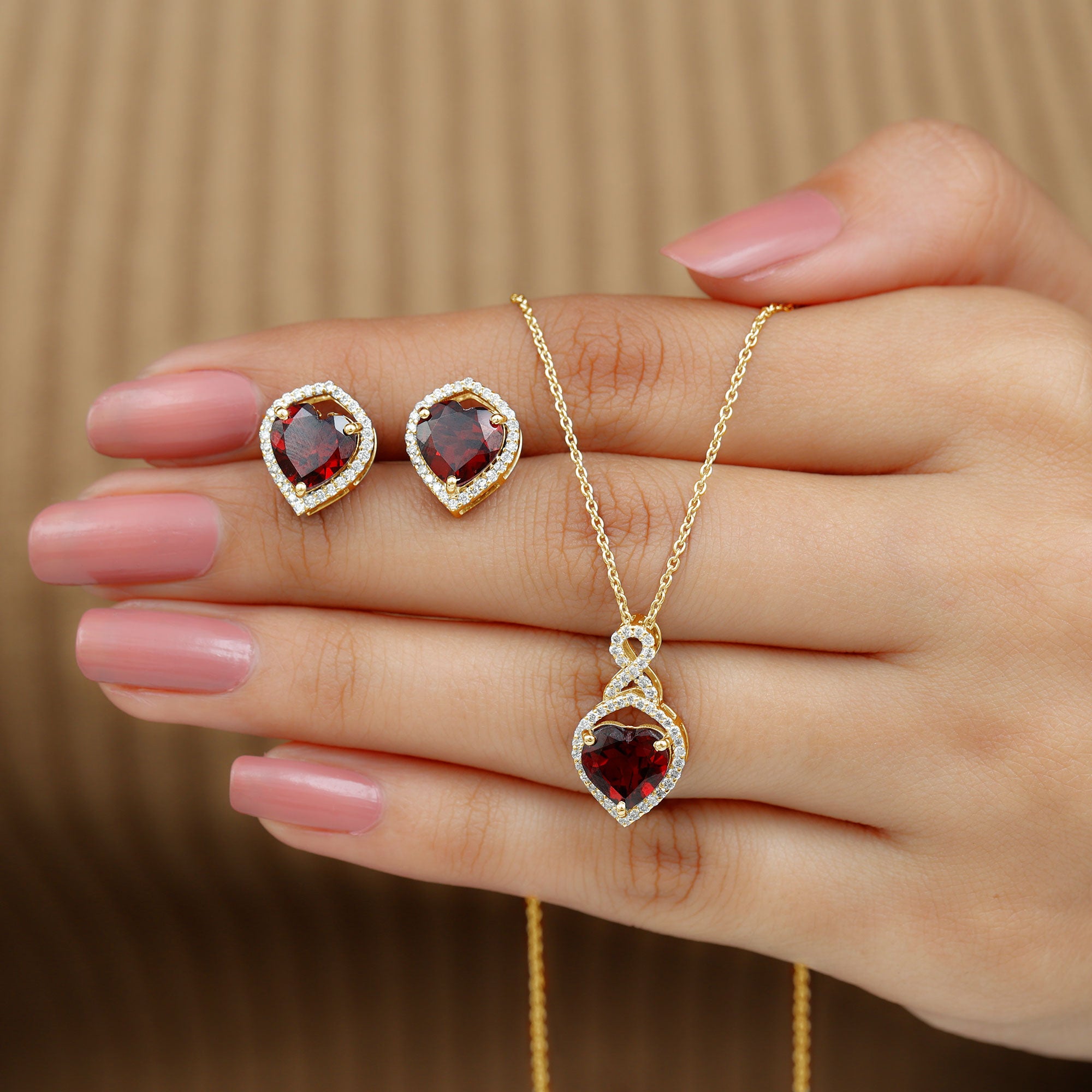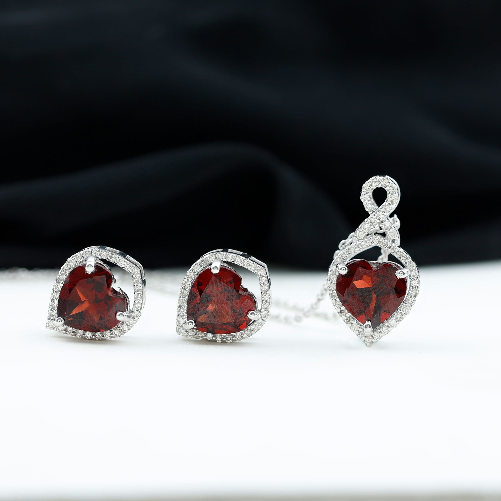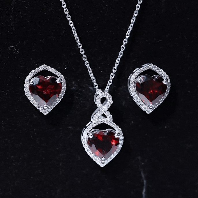 This exquisite Garnet and Diamond Infinity Heart Jewelry Set is the perfect way to express your everlasting love. The set features an 8x8 mm heart-shaped garnet pendant and matching stud earrings, each adorned with sparkling diamonds. The infinity symbol is a timeless representation of eternal love, and this jewelry set is sure to become a cherished heirloom.