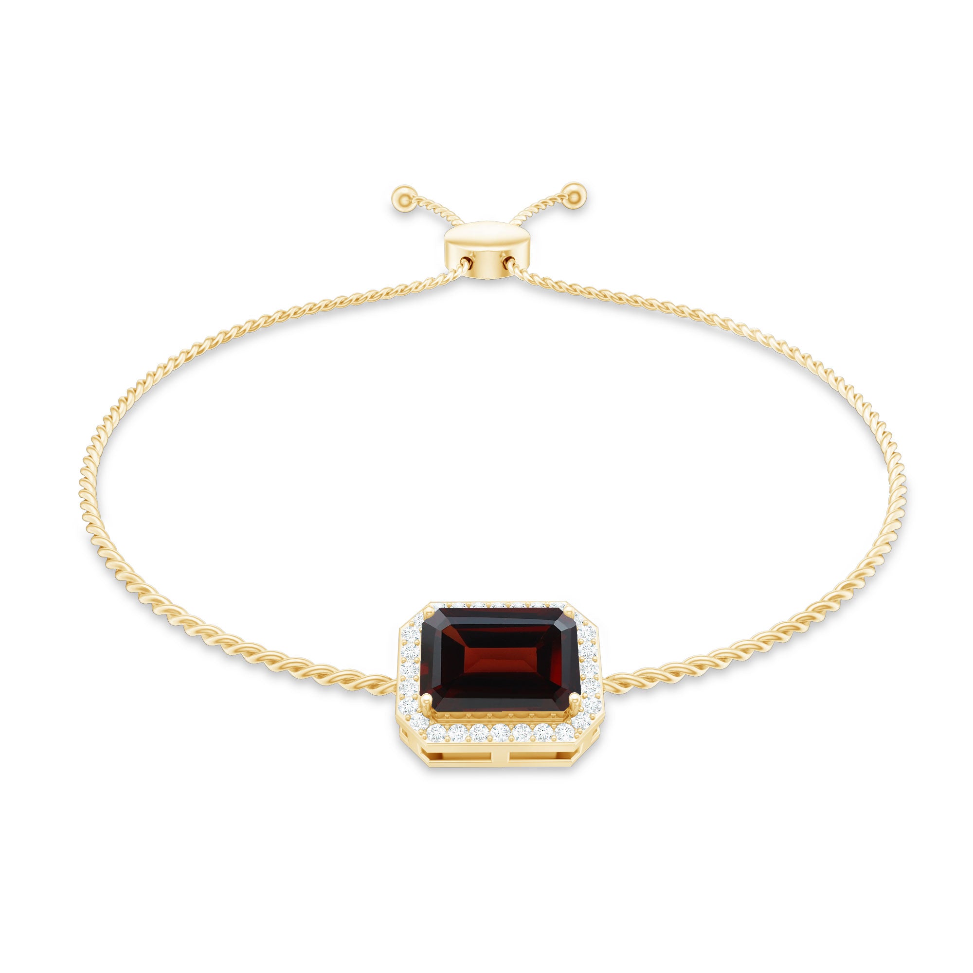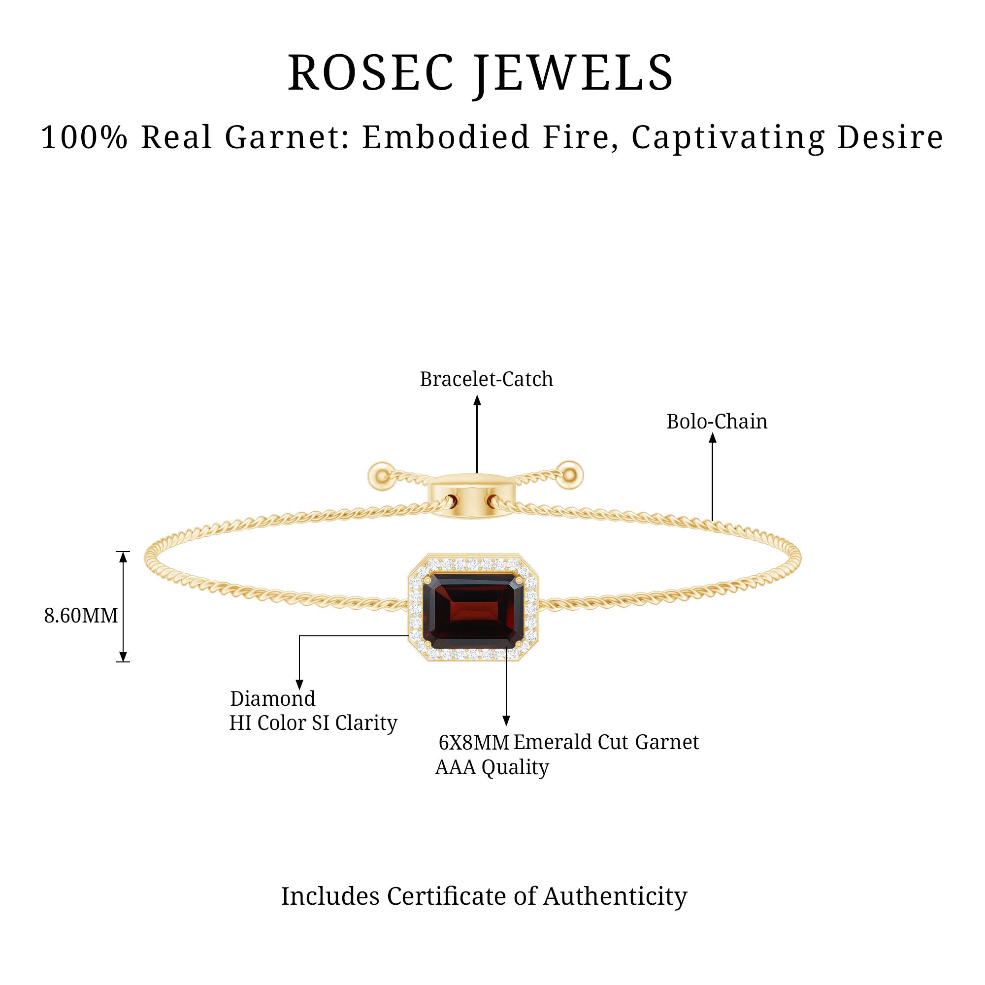 Enhance your personal style with our Halo Chain Bracelet, which features a striking contrast. The emerald-cut Garnet is elegantly secured in a prong setting, encircled by delicate round diamonds that form a captivating halo. The secure closures at both ends provide safety and allow for easy adjustments. The enchanting dark reddish hue and timeless brilliance of the diamonds are guaranteed to draw everyones attention and place you in the limelight. Indulge yourself or present it as a gift to a loved one, as it serves as a charming birthday or anniversary present. This Garnet Bracelet, with its exceptional design, embodies a fusion of understated elegance and breathtaking beauty. Emphasizing exquisite luxury, this Bolo Chain Bracelet could be the ideal gift for weddings, anniversaries, or any special occasion for someone dear to you. Additionally, Garnet is linked to the January birthstone, making it a thoughtful gift for her.