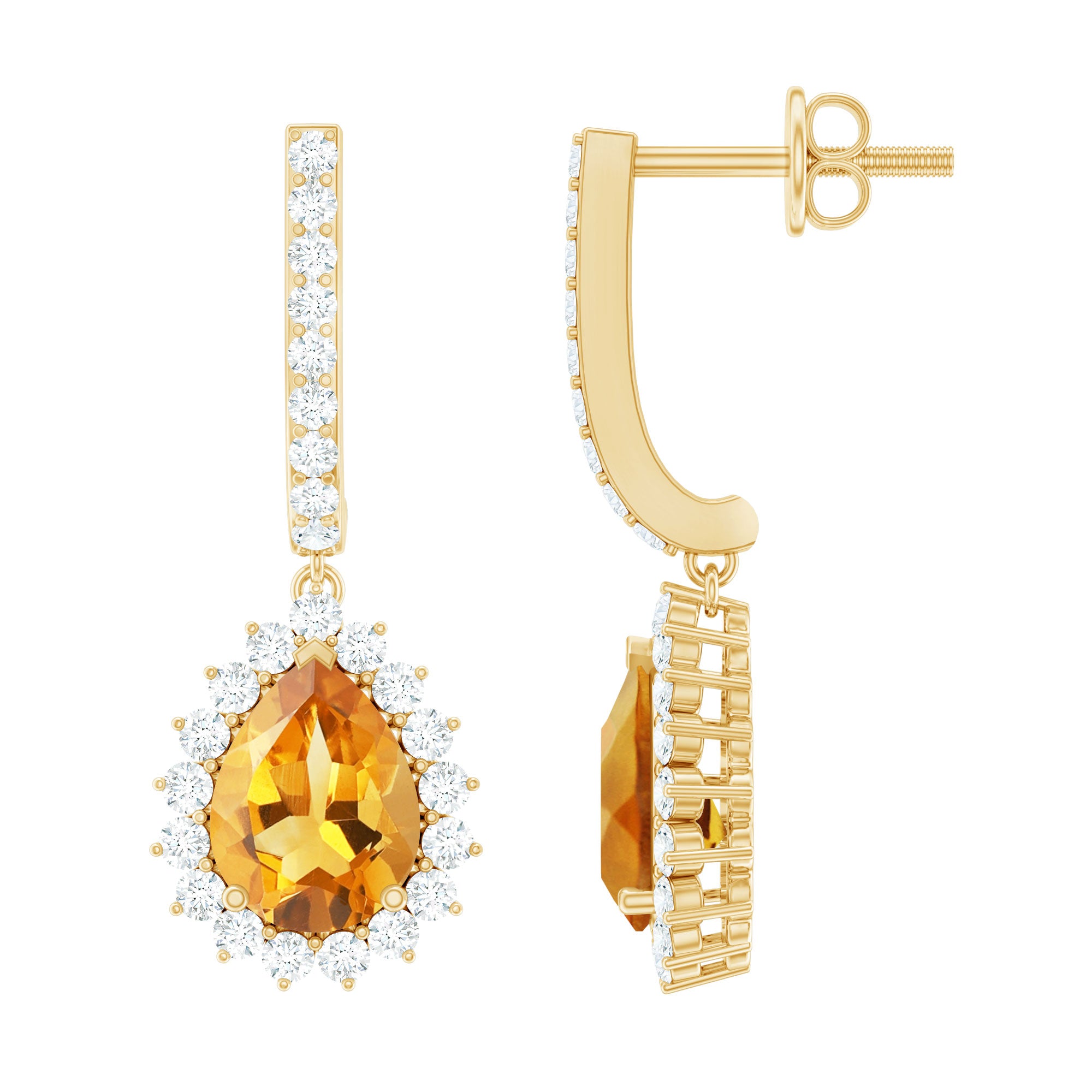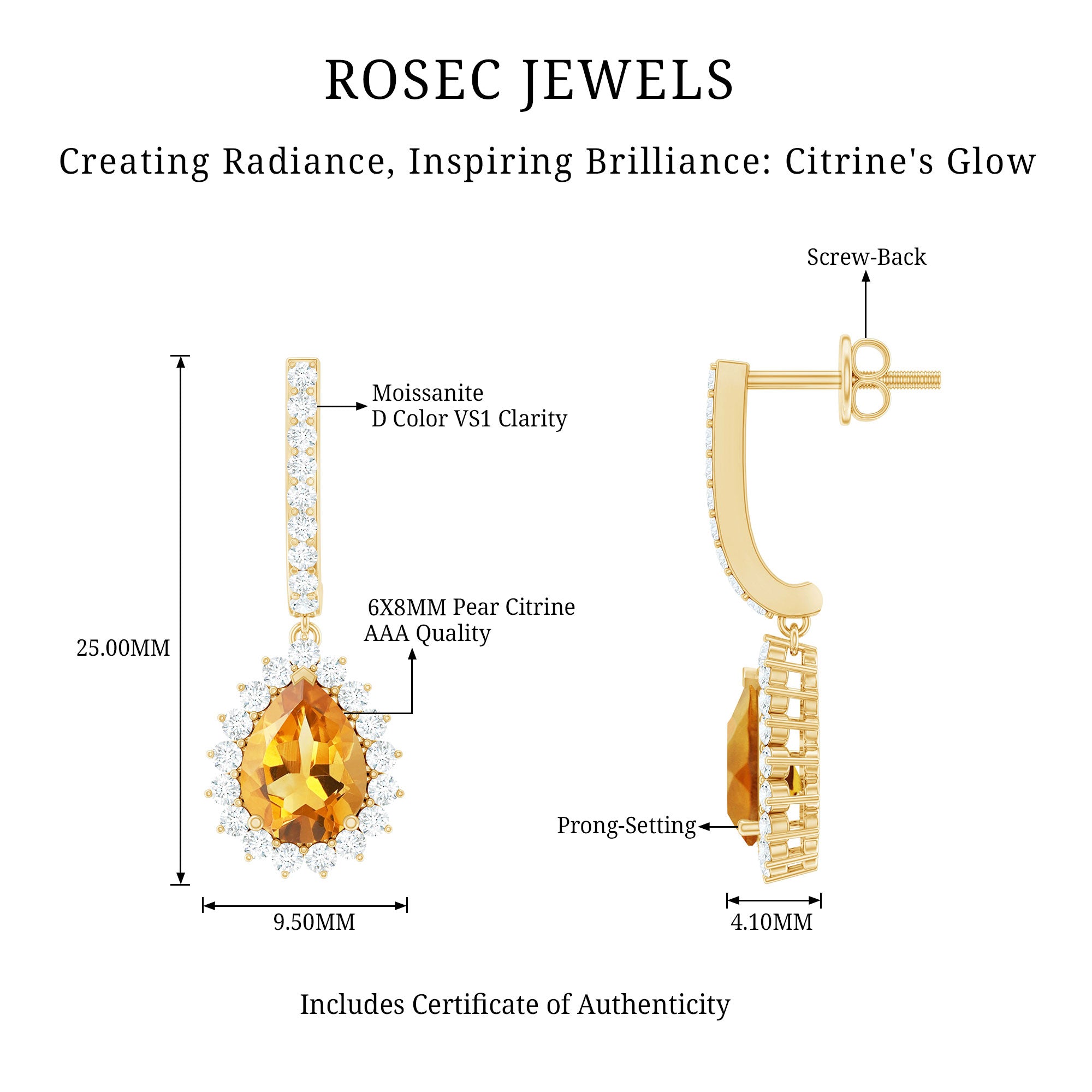 A breathtaking combination of elegance and sparkle, these Citrine Drop Earrings are a showstopper. Surrounded by a Halo of dazzling Moissanite stones, the 6X8 mm Pear Shape Citrine at the center glows with a warm, golden hue that adds a touch of sunshine to any outfit. The earrings feature a J hoop adorned with dainty Moissanite stones that adds extra brilliance and modern flair, making them as eye-catching as they are luxurious. With secure Screw Back Closure, these Teardrop Earrings are designed for comfort and peace of mind, ensuring they stay perfectly in place while you shine all day or night. Whether you are dressing up for a special event or adding a touch of glamour to your everyday look, these Hoop Drop Earrings are the perfect accessory to elevate any outfit. Presented in a beautiful jewelry box, these Citrine Earrings are ready to gift. These earrings are a stunning expression of love and beauty.