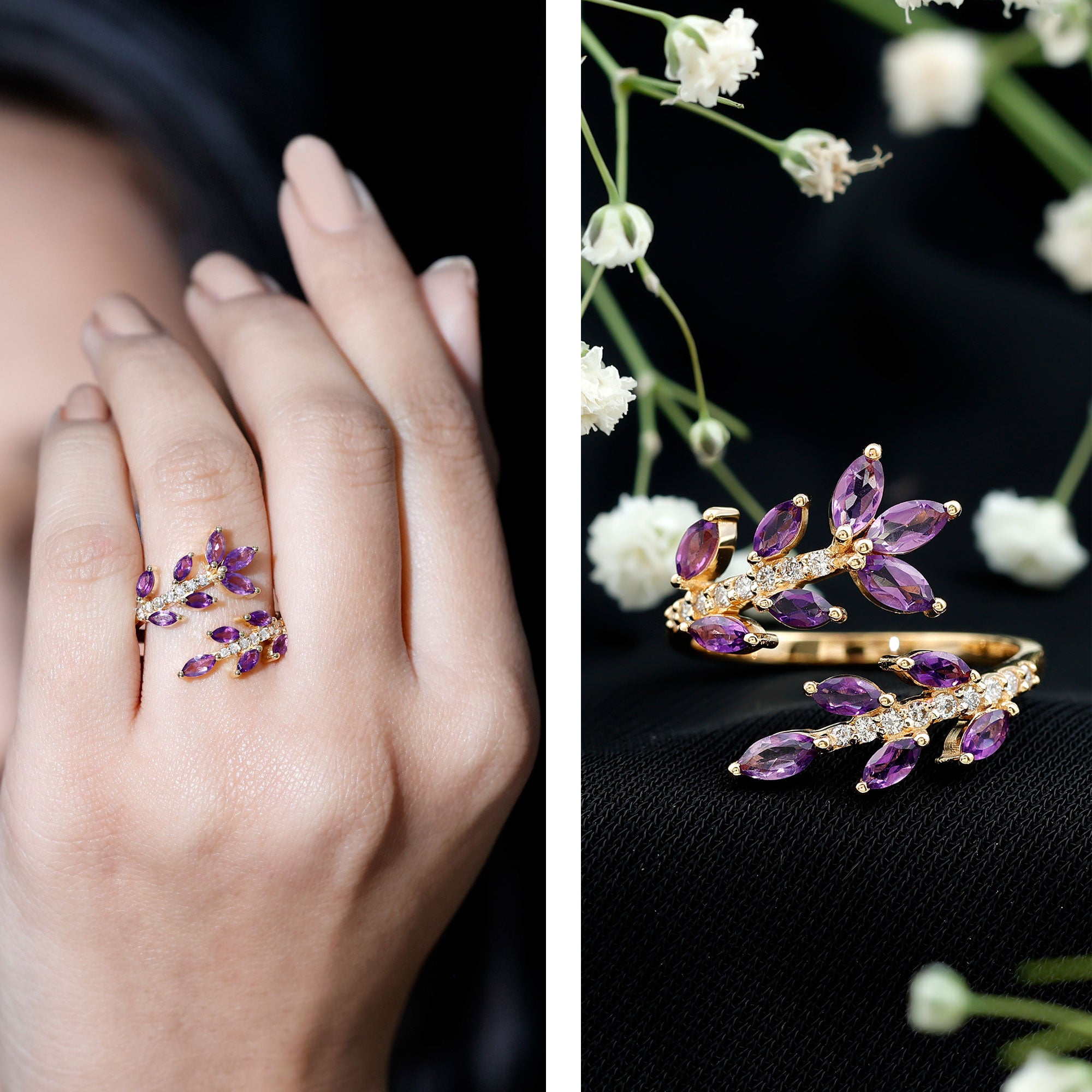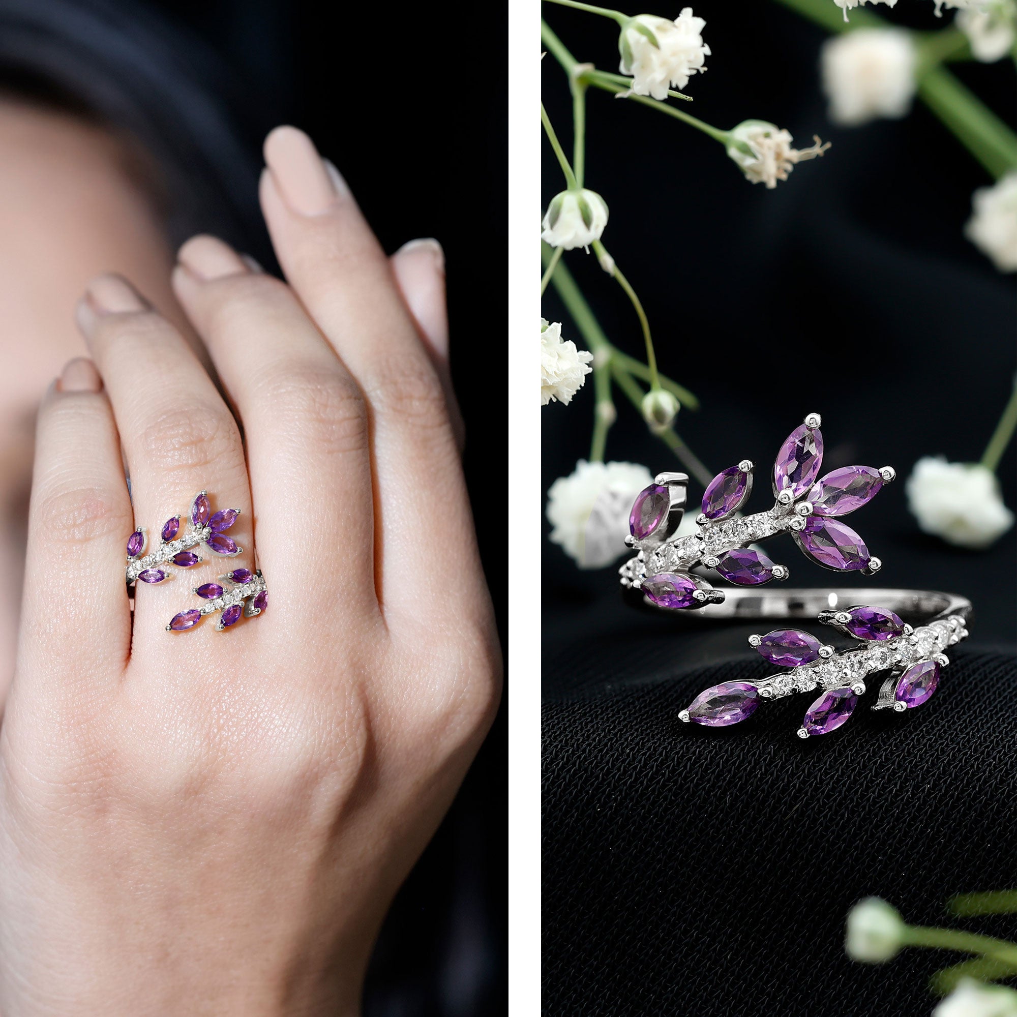 The beautiful purple gemstone ring styles range from solitaire rings to more intricate vintage-inspired rings. Natural Amethyst is popular and an extraordinary choice for wedding bands, and engagement rings. This exquisite gemstone embodies the essence of love, enduring unity, and long-term commitment.