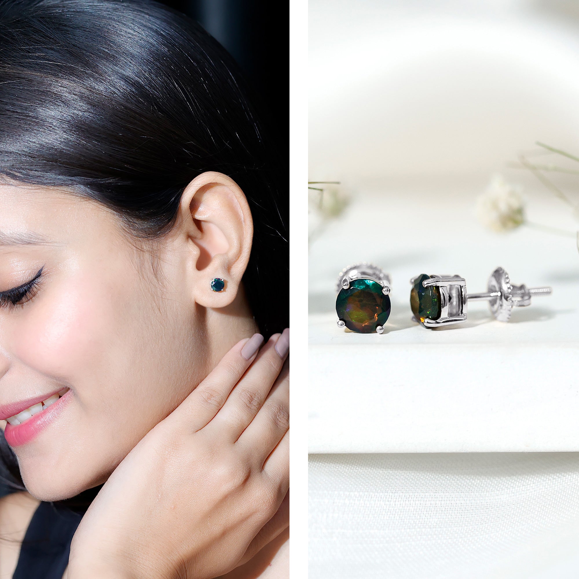 Add a touch of elegance and mystery to your style with these Black Opal Stud Earrings. Each earring features a 6 MM round cut black opal, carefully set in a secure 4-prong setting. The Solitaire Earrings have screw back closures, ensuring they stay in place comfortably throughout the day. They are lightweight and easy to wear, making them perfect for both everyday use and special occasions. The smooth design keeps them comfortable, so you can wear them for hours without any discomfort. Black opal is a stone full of meaning. It is often associated with strength, creativity, and protection, making these October Birthstone Earrings not just a beautiful accessory but also a thoughtful symbol. They make a wonderful gift for birthdays, anniversaries, or just to show someone you care. These Round Stud Earrings combine classic elegance with a modern feel. They add a touch of color and sophistication to any outfit, whether casual or formal.