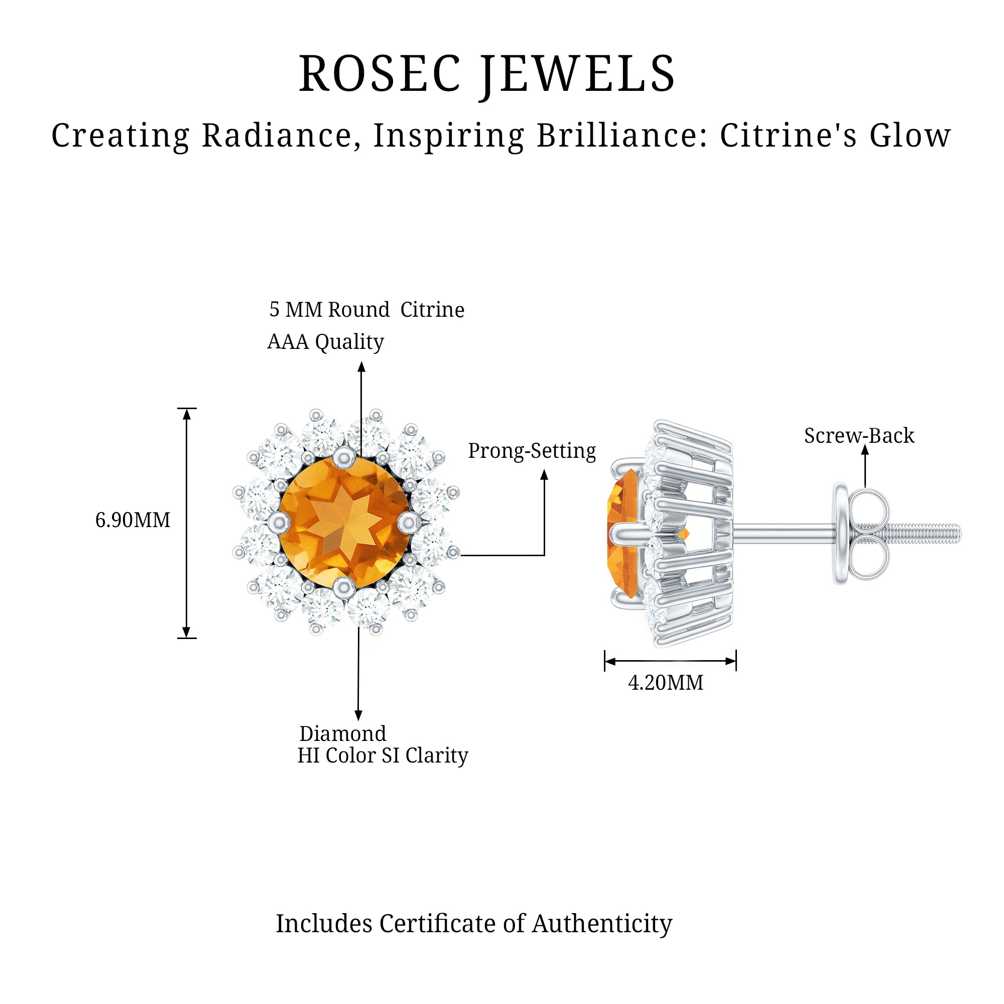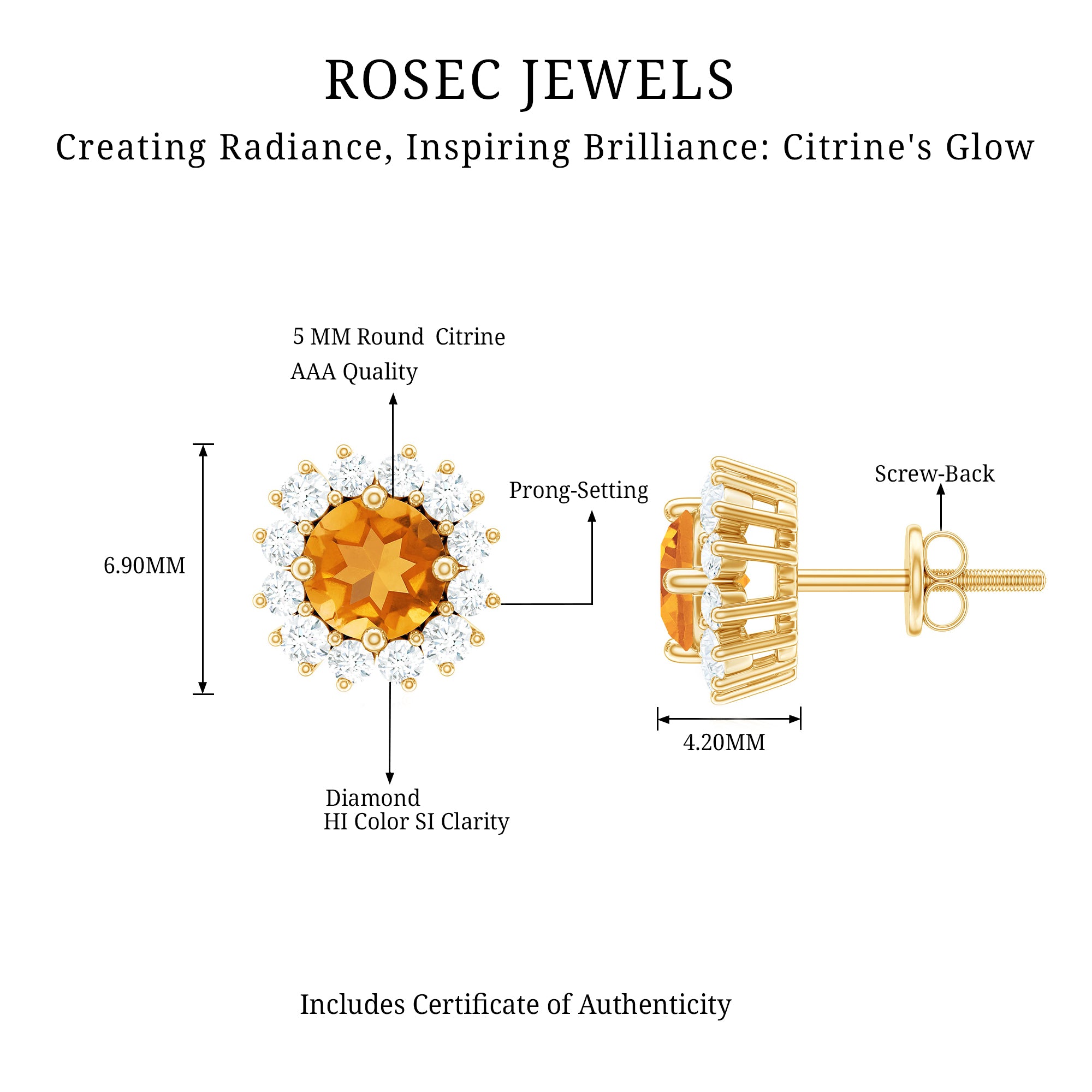 A timeless addition to any jewelry collection, these Citrine Stud Earrings are the perfect way to add a pop of vibrant color and sparkle to your look. The rich, golden hue of the Prong Set 5 mm Round Shape Citrine is beautifully framed by a Halo of sparkling Diamond stones, creating a stunning contrast that makes the center stone truly shine. Whether you are dressing up for a special event or adding a touch of elegance to your everyday style, these Citrine Diamond Earrings are versatile enough to complement any outfit. The Screw Back Closure ensures a secure and comfortable fit, so you can wear them with confidence all day or night. Ready to gift, these Halo Stud Earrings come in a signature jewelry box, making them an ideal present for birthdays, anniversaries or just to show someone you care. A beautiful symbol of love and light, these Citrine Ear Studs are a thoughtful gift that will be cherished for years to come.