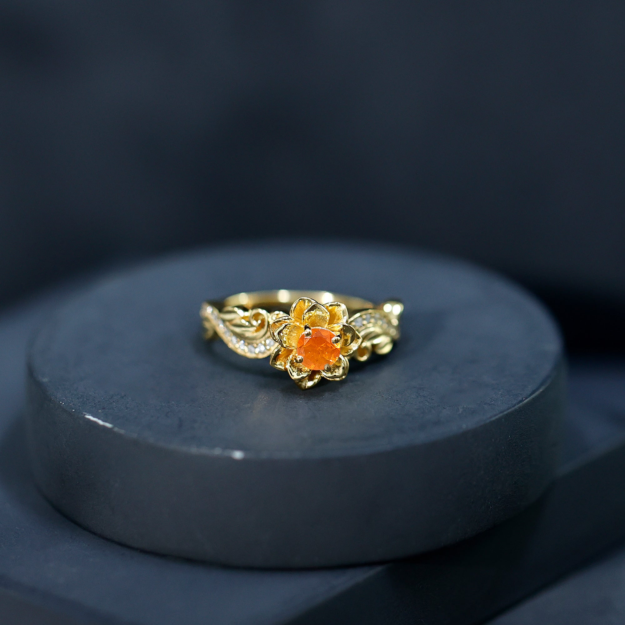 There is something so joyful about this Rose Flower Engagement Ring, like a golden sunrise captured in a piece of jewelry. Perfect for the romantic at heart, this Citrine Engagement Ring brings the beauty of nature to life with a design inspired by blooming flowers and sunshine-filled days. Crafted in sterling silver, this Floral Engagement Ring features a glowing 4 MM round cut Citrine, set right at the heart of a detailed rose flower design. The AAA quality Citrine shines in a radiant golden hue, symbolizing happiness, clarity, and new beginnings. Surrounding the floral center are delicate leaf motifs on the band and a sparkling wave of EF-VS quality lab grown diamonds, adding soft brilliance to the overall design. This Nature Inspired Engagement Ring is not just jewelry, it is a little garden you can wear. Available in a variety of sizes and thoughtfully packaged in a premium box with a Certificate of Authenticity, this Citrine and Diamond Ring is the kind of piece she will cherish forever.