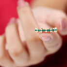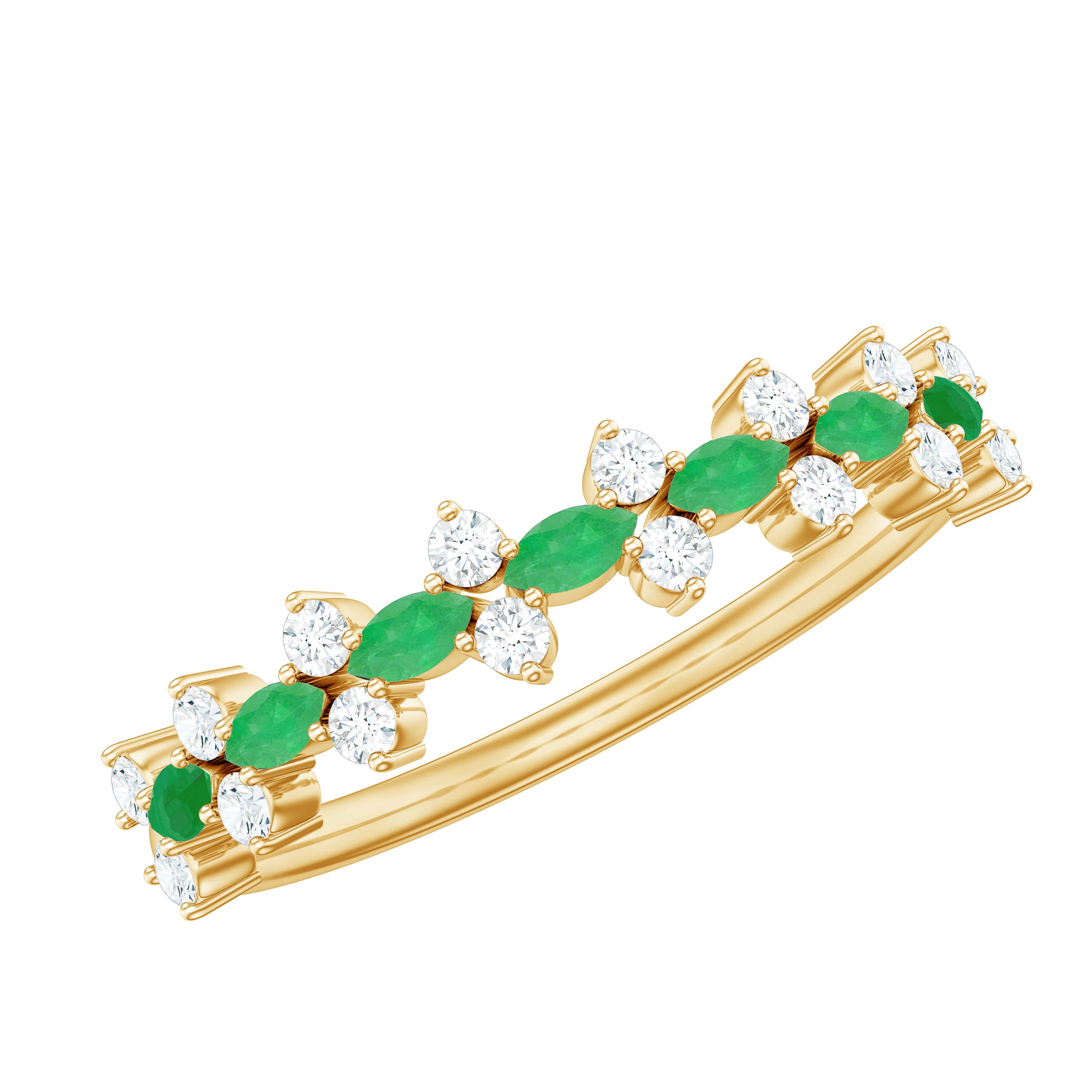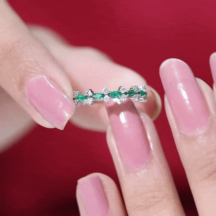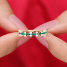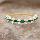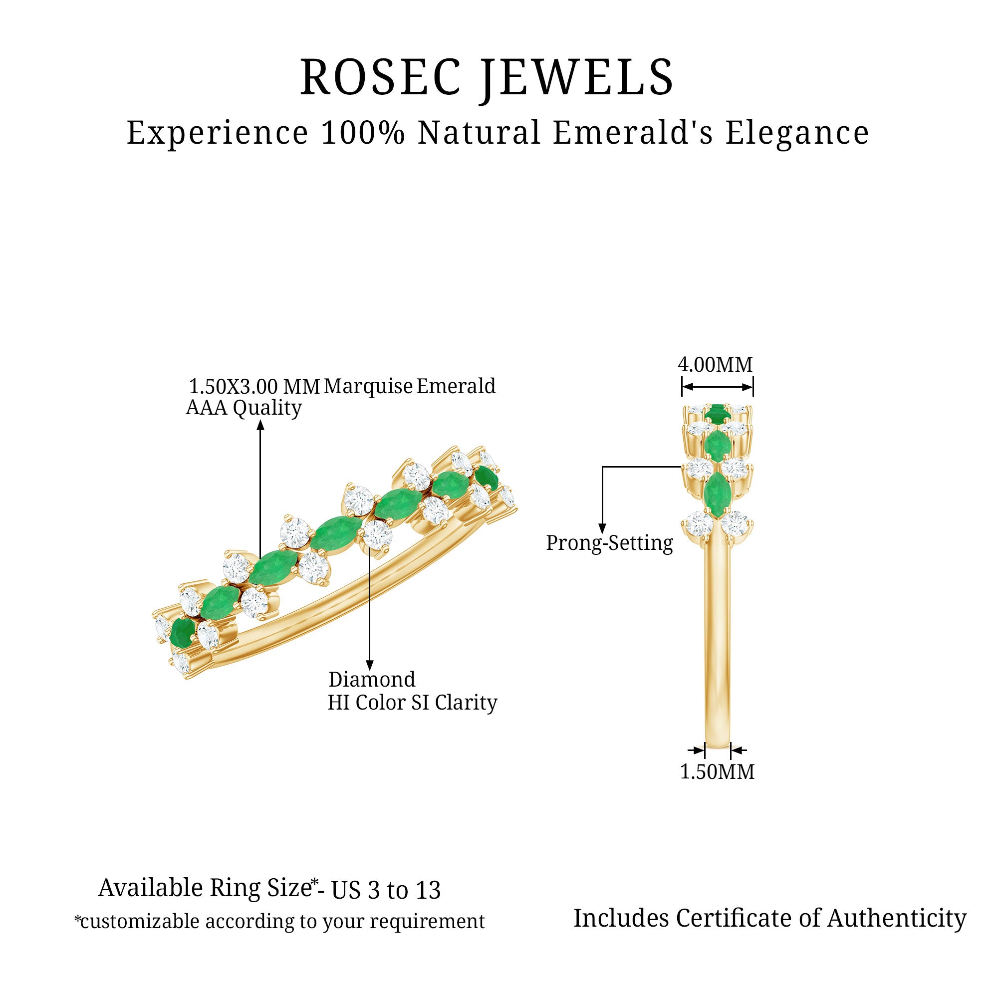 Graceful and full of charm, this Emerald and Diamond Eternity Ring captures the perfect balance between timeless beauty and modern elegance. The Half Eternity Band is adorned with a stunning arrangement of natural marquise cut emeralds and round cut diamonds, each set in prong setting with care to create a seamless flow of sparkle and color. Each AAA quality emerald glows with depth and character, perfectly complemented by the radiant sparkle of the HI-SI quality diamonds. Together, they form a band that feels both classic and captivating. Crafted with precision, this Emerald Wedding Band is designed for lasting comfort and shine. Its half-eternity style offers just the right amount of luxury for everyday wear, yet it remains elegant enough for formal occasions. Whether you choose to wear it alone or stack it with other rings, its graceful design ensures it will always draw admiration. Presented in an elegant jewelry box, this Emerald Eternity Band serves as a reminder of enduring beauty and cherished memories, an exquisite treasure meant to be worn and loved for a lifetime.