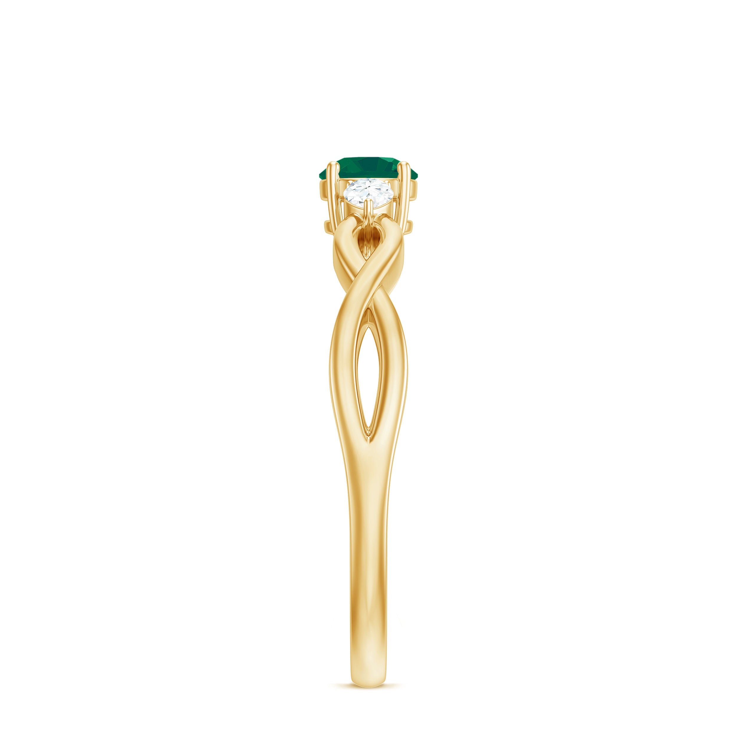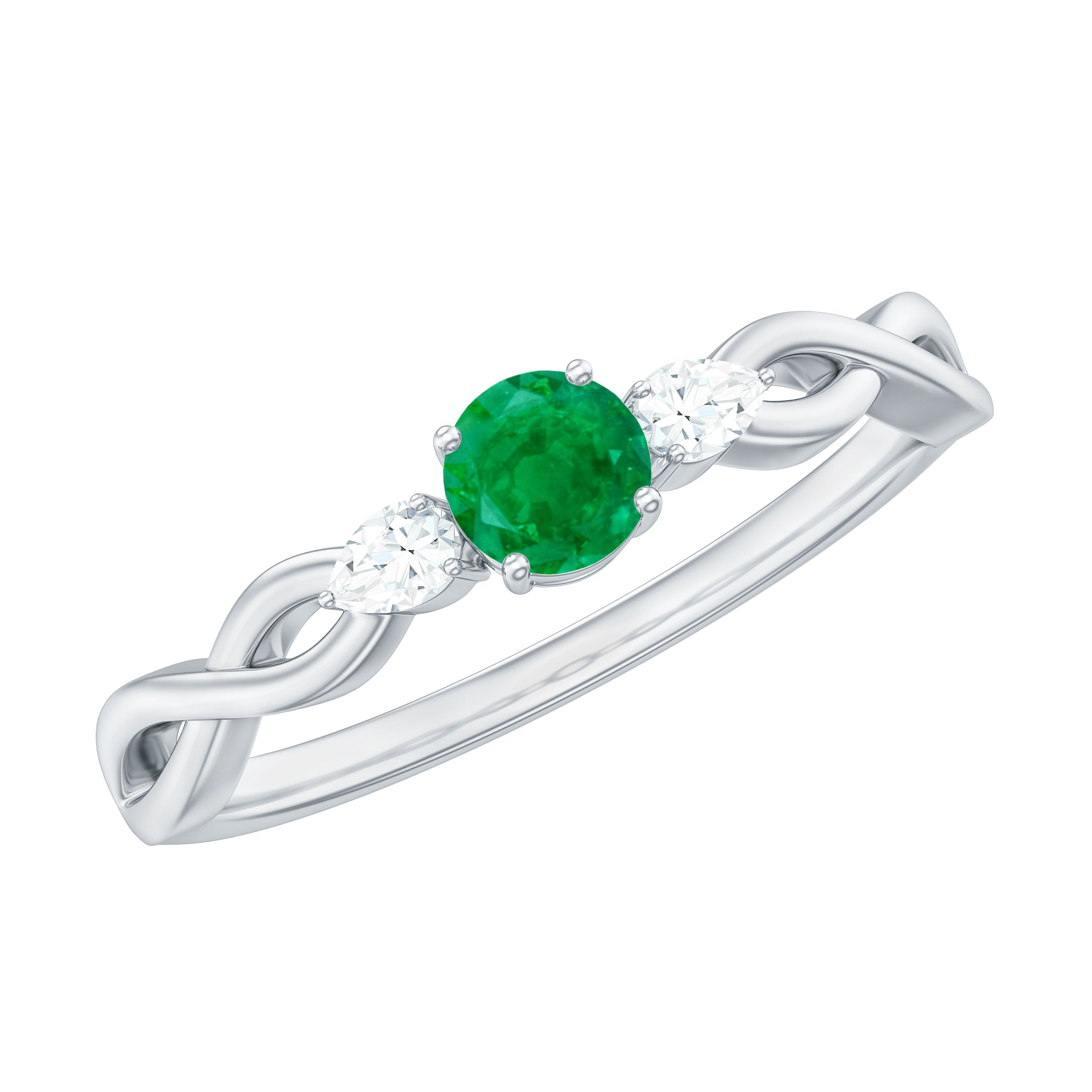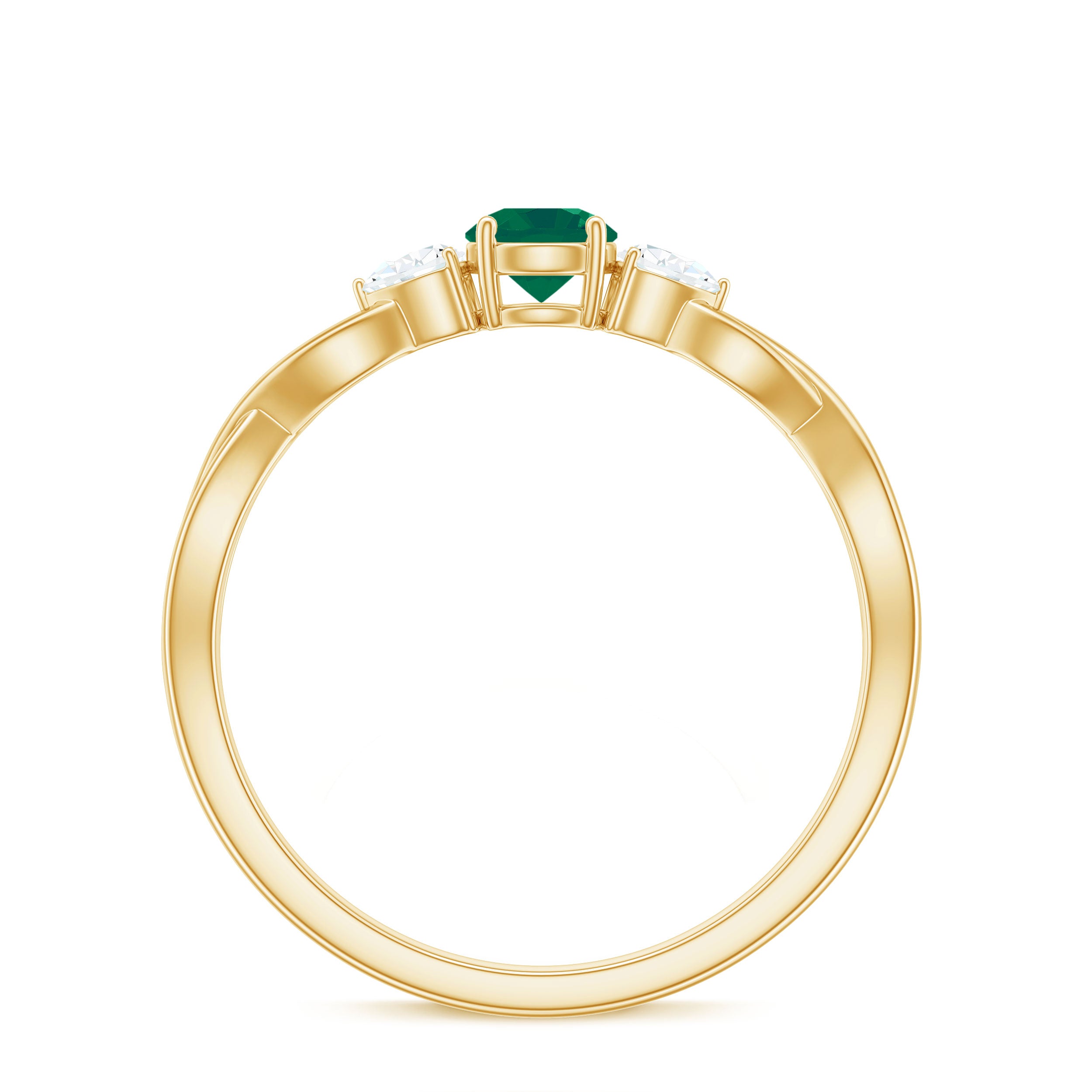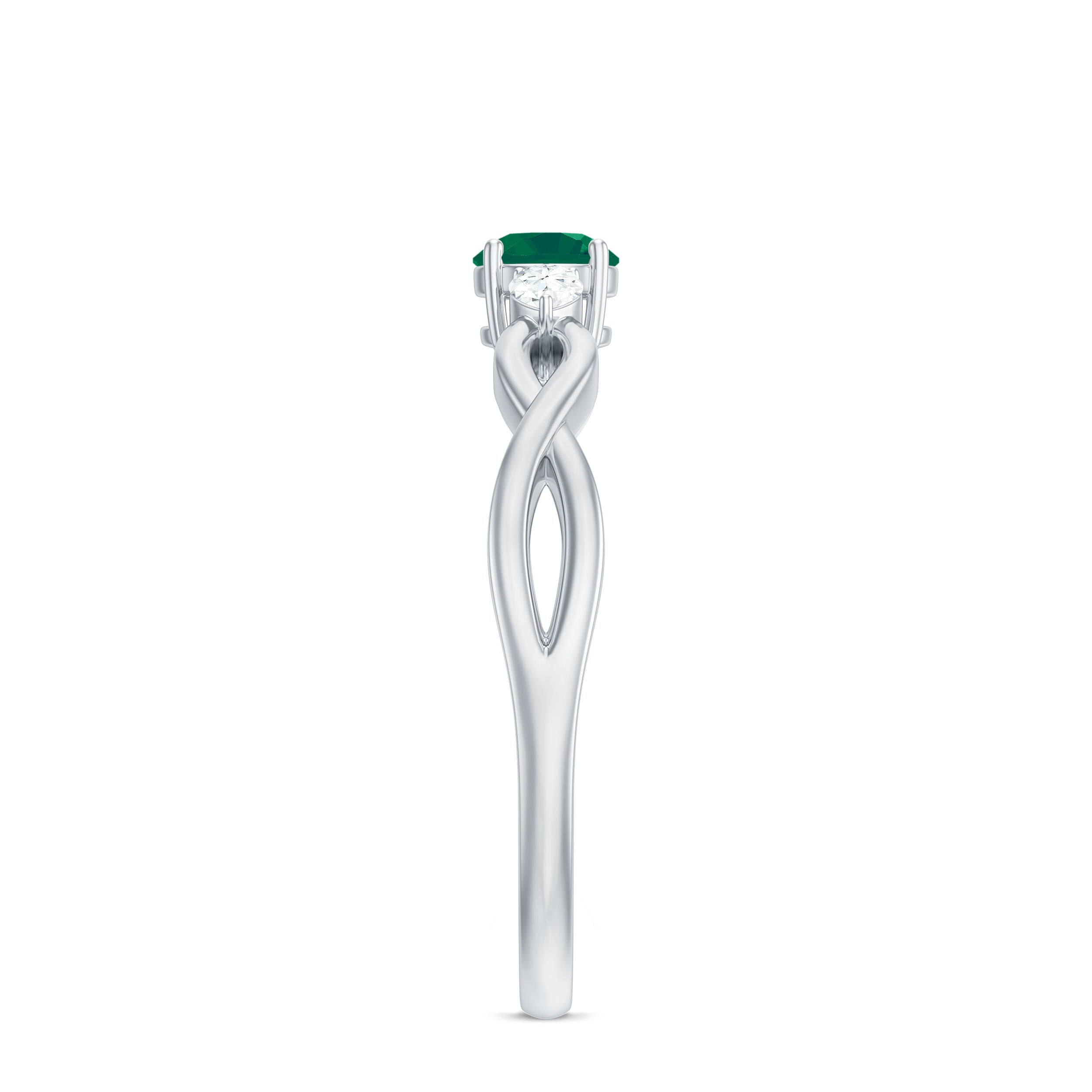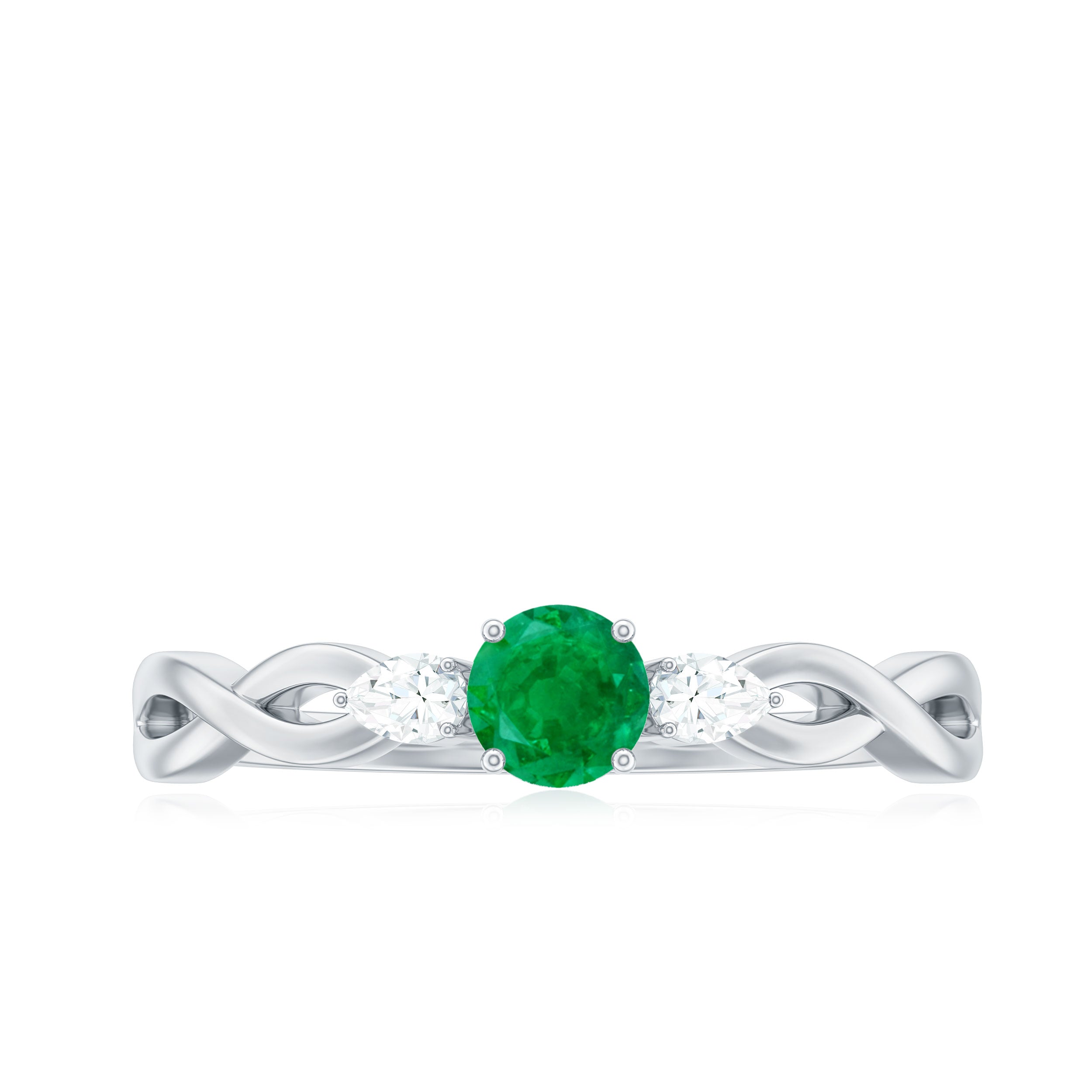 This Promise Ring is the turning of a page, ushering in a story yet untold. At the heart of this stunning piece is a 5 MM round shaped emerald, set in secure prong setting that highlights its brilliant fire and sparkle, highlighted by two pear cut diamond accent stone set on both sides, this unique Commitment Ring is designed to stand out with elegance and grace. The Natural Emerald Ring balances timeless design with a modern twist, making it a meaningful symbol of your forever promise. The distinctive feature of this Pre Engagement Ring is its crossover style shank, where the twist detail symbolizes the intertwining of two lives, progressing together with strength and brightness. This design choice is both subtle and beautiful, enhancing the rings depth and symbolism while maintaining its elegance and wearability. It is accompanied by a certificate of authenticity and is exquisitely packaged in a signature jewelry box, prepared to become a part of your narrative.