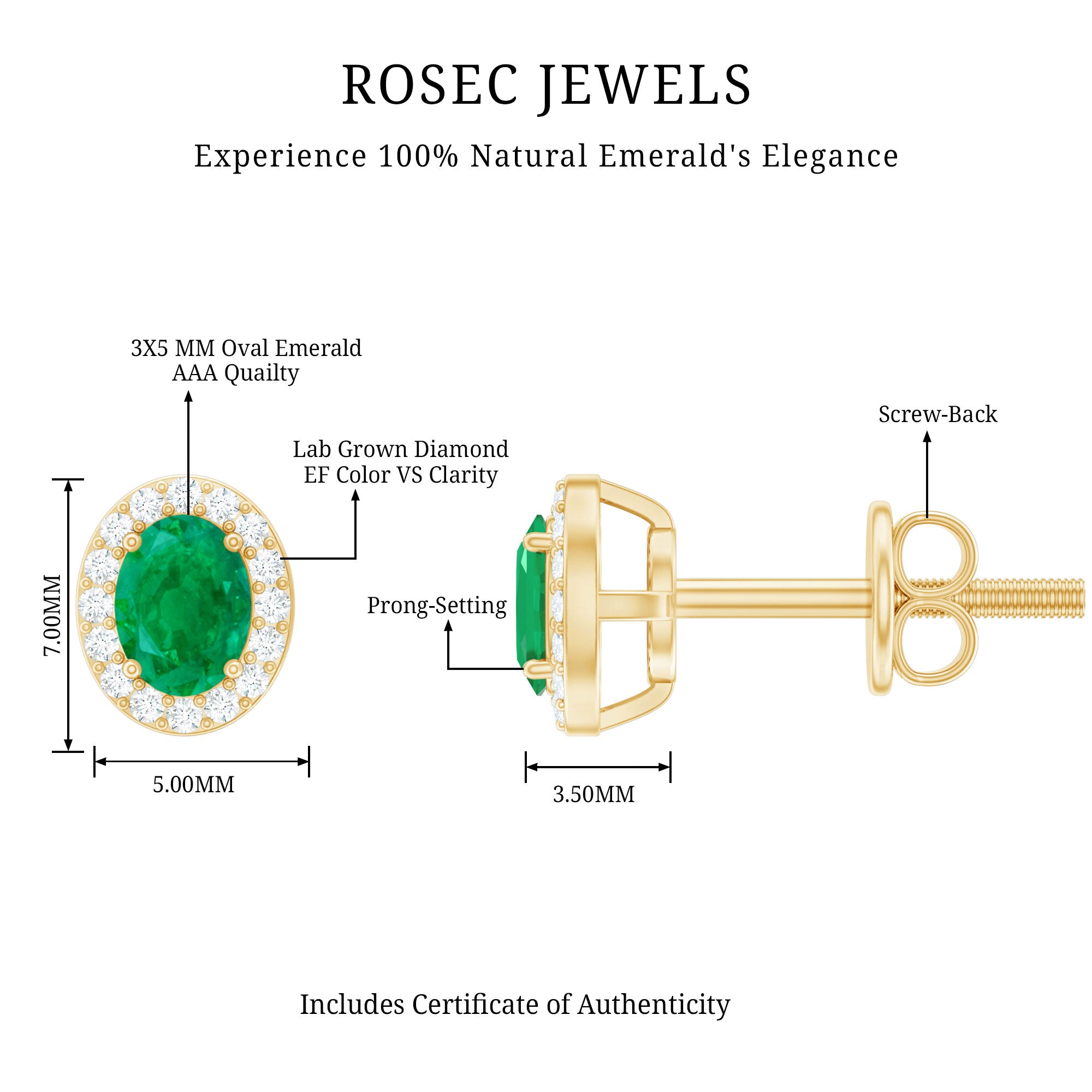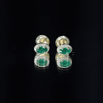 These beautifully made Emerald Stud Earrings bring a timeless charm to any jewelry collection. Crafted in sterling silver, the design is simple, elegant, and easy to wear for any occasion. Each earring features a 3X5 MM oval shaped Emerald set securely in prong setting. The rich green color of the emerald is known for its beauty and meaning, symbolizing growth, renewal, and love. It is also the birthstone for May, making these Green Emerald Earrings a thoughtful and meaningful gift. A delicate lab grown diamond halo of round shaped stones surrounds each emerald, adding just the right amount of sparkle. These diamonds are EF color and VS clarity, creating a clean and bright look that enhances the center stone without overpowering it. Made with AAA quality emeralds, these May Birthstone Earrings are designed to last and be loved for years. The screw back closure keeps them secure and comfortable for everyday wear, while the light weight makes them easy to wear all day. These Emerald and Diamond Earrings are perfect for birthdays, anniversaries, or simply as a gift to yourself. Whether worn with casual clothes or dressed up for a special event, they offer a soft, classic look that never goes out of style. This pair comes in a signature jewelry box and includes a gemstone certificate for authenticity.
