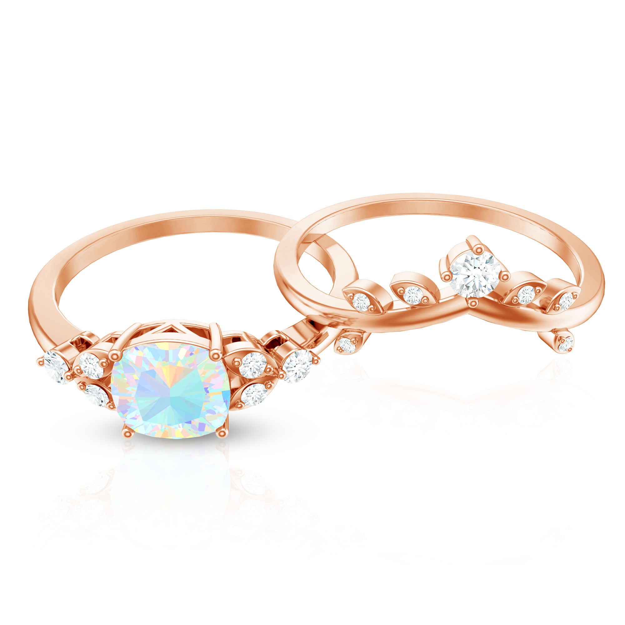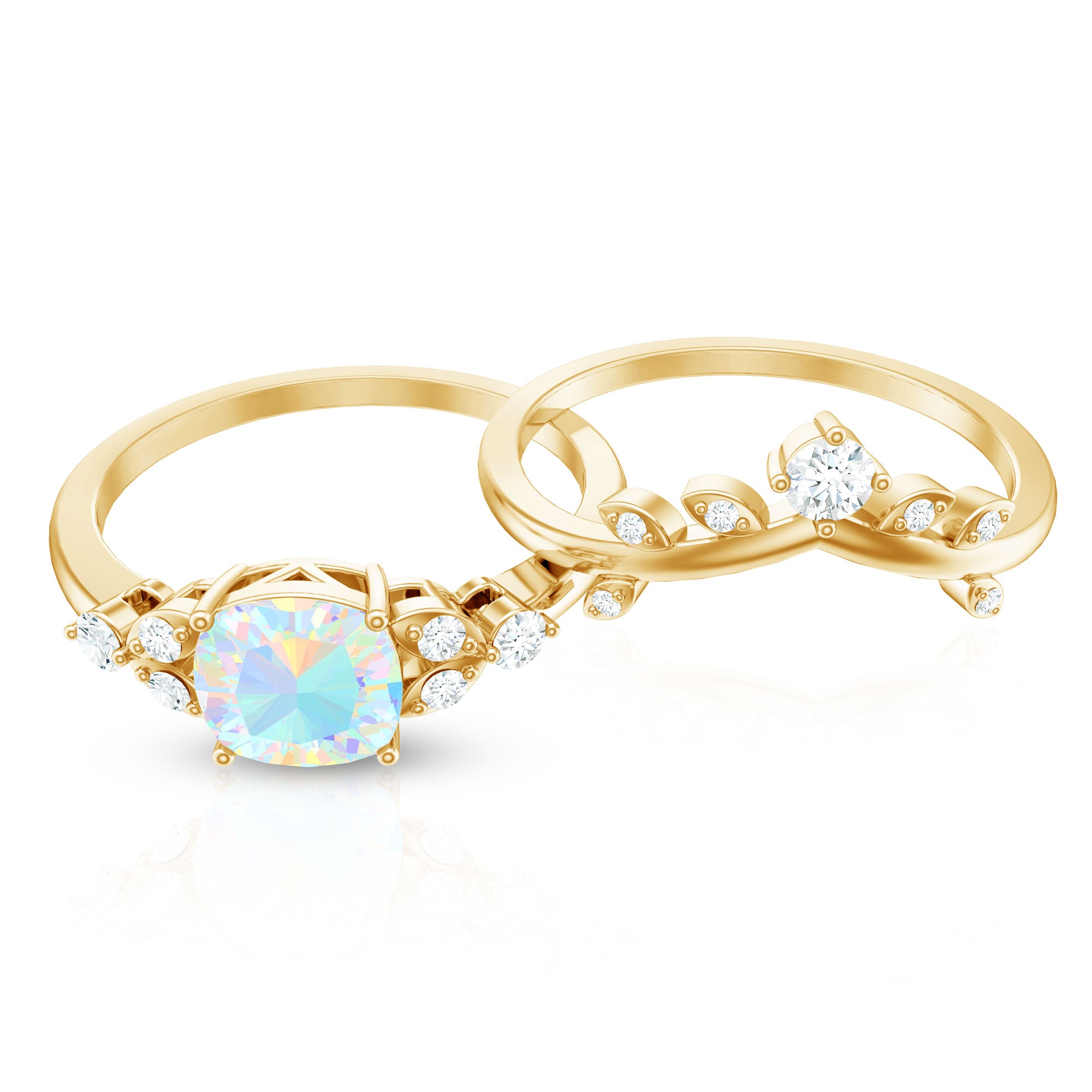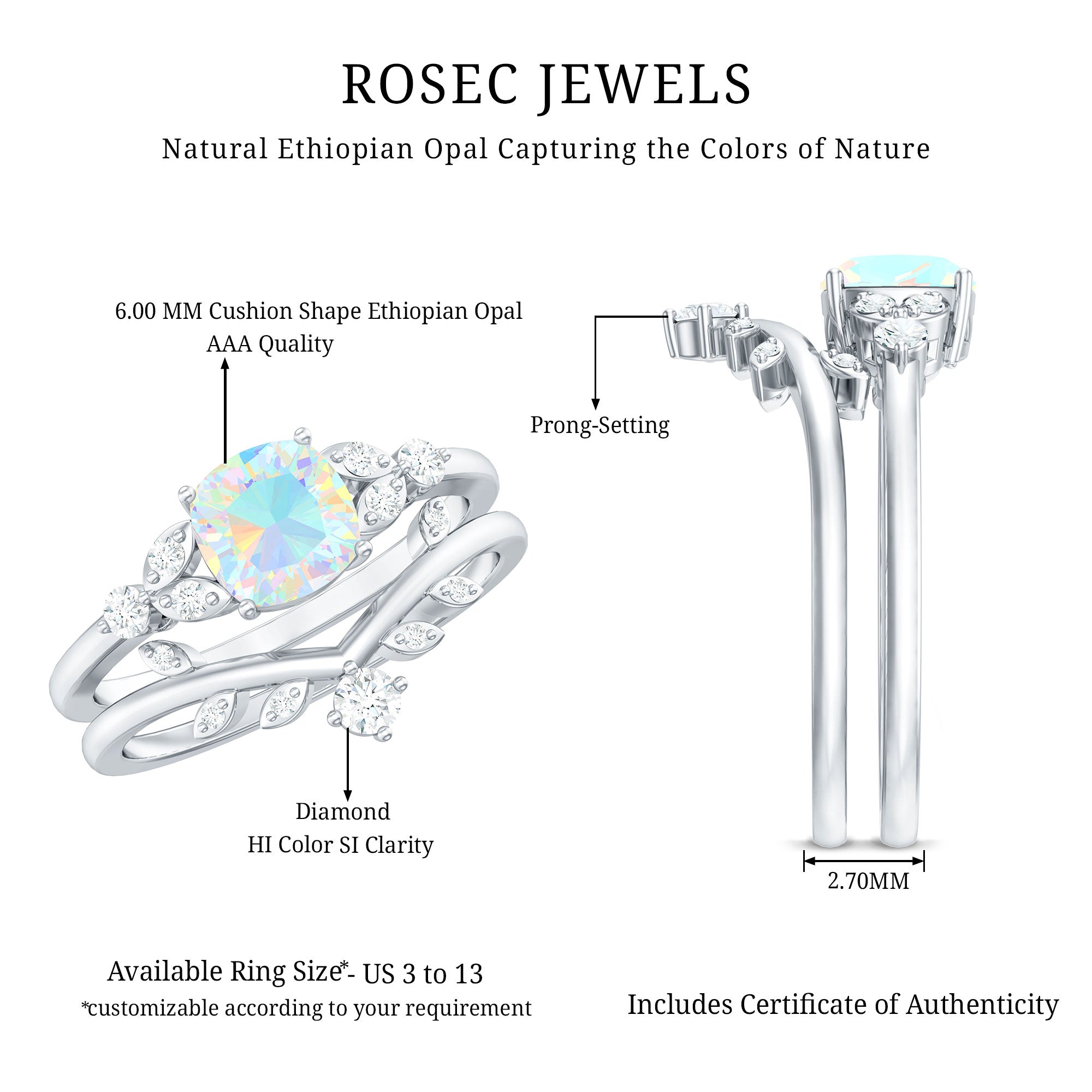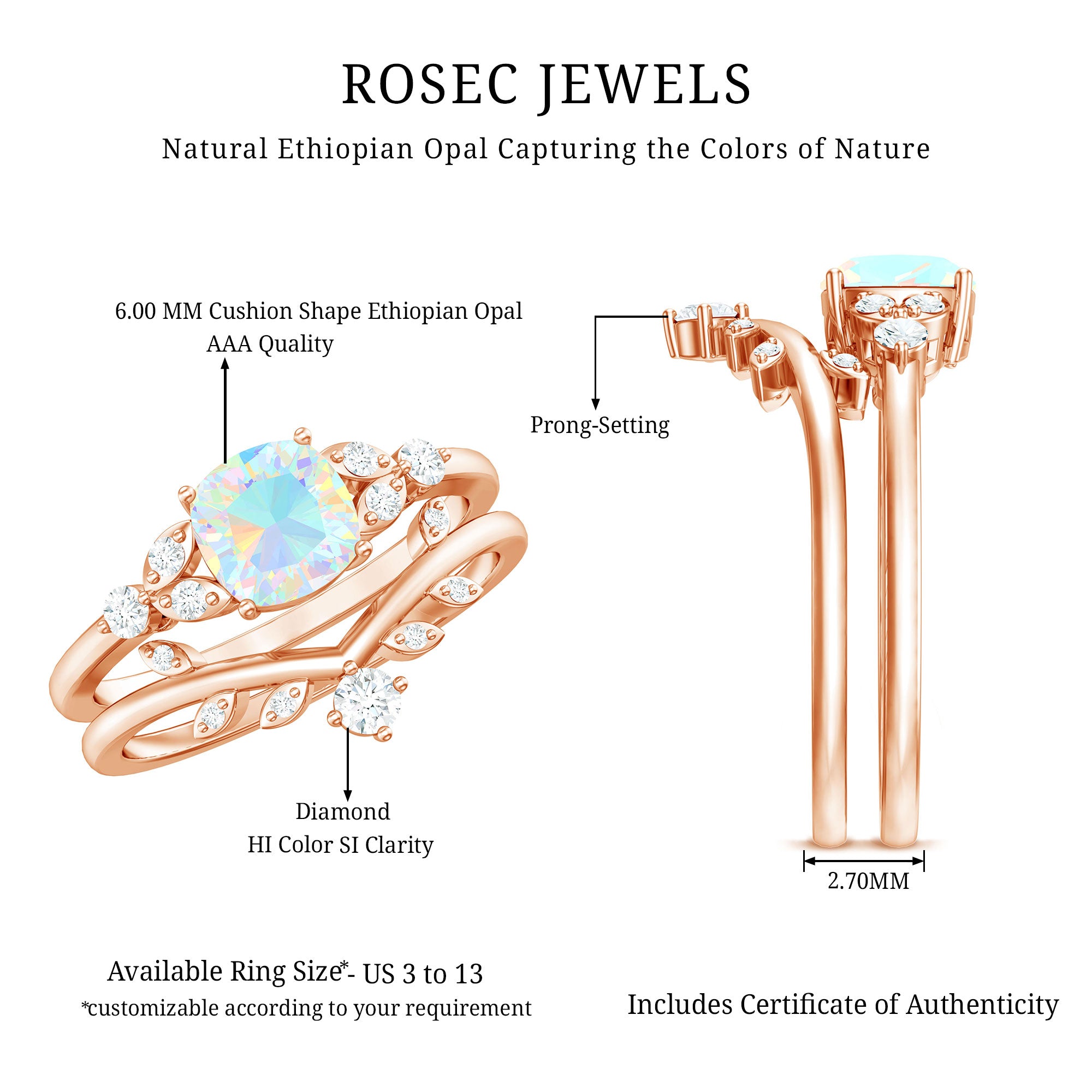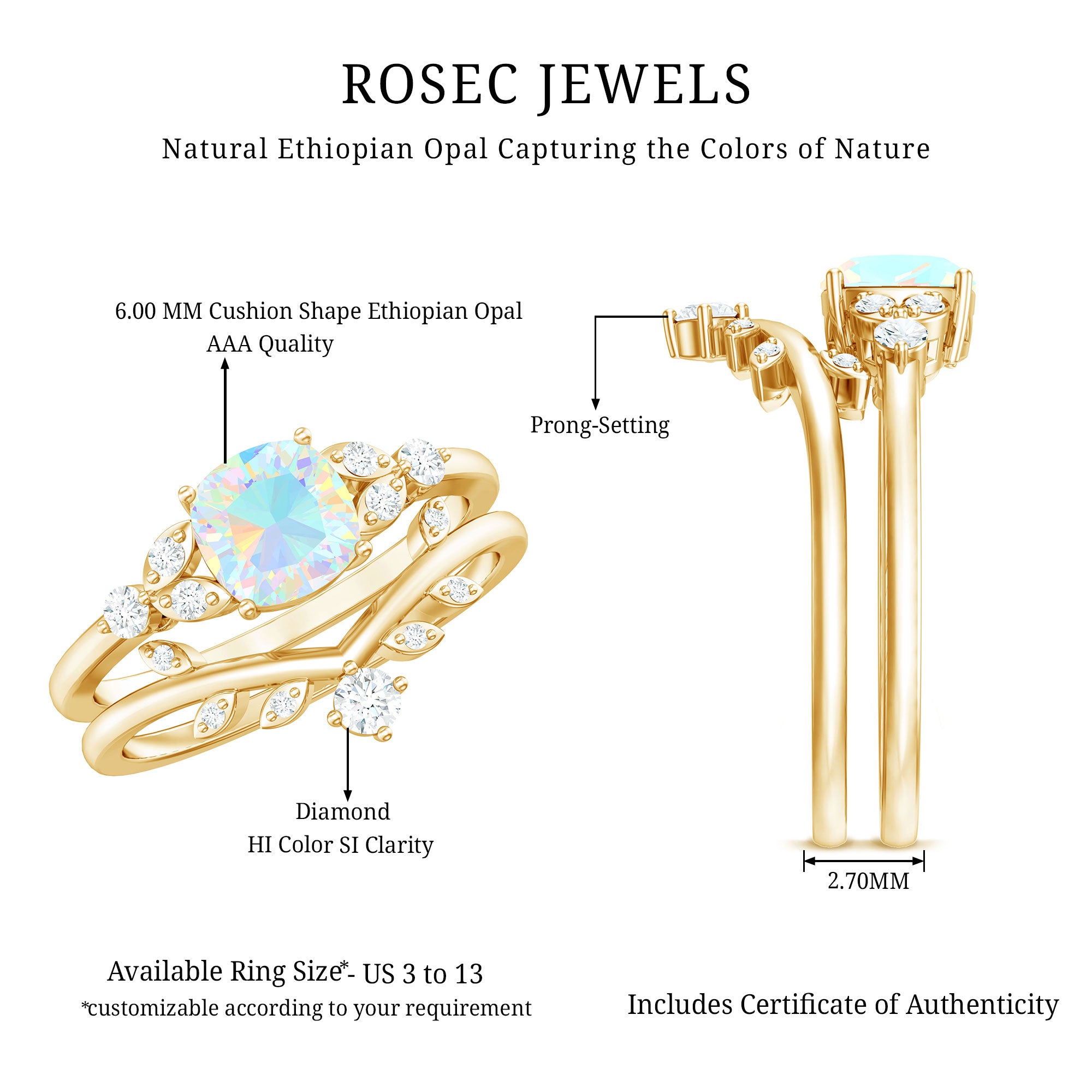 Timeless beauty and vintage charm come together in this breathtaking Ethiopian Opal Engagement Ring Set, designed for brides who love a bold yet elegant sparkle. The centerpiece of this set is an 6 MM cushion cut ethiopian opal set in secure prong setting and radiates brilliance and fire, enhanced with diamond trio on both sides of the center stone. What makes this piece truly special is the graceful pairing of the natural opal diamond engagement ring with a matching curved wedding ring guard, adorned with round shaped diamond stones, boosting its sparkle and giving the entire Vintage Bridal Ring Set the appearance of a stunning trio ring set, without the need for a third band. This 2 piece rings set is a tribute to timeless design, where every stone is placed with care and intention. The mix of brilliant sparkle and vintage styling makes it ideal for the bride who values tradition but also wants a touch of uniqueness. Whether you are walking down the aisle or simply celebrating a meaningful milestone, this Engagement Ring with Wedding Band Set makes a powerful statement of love and elegance.