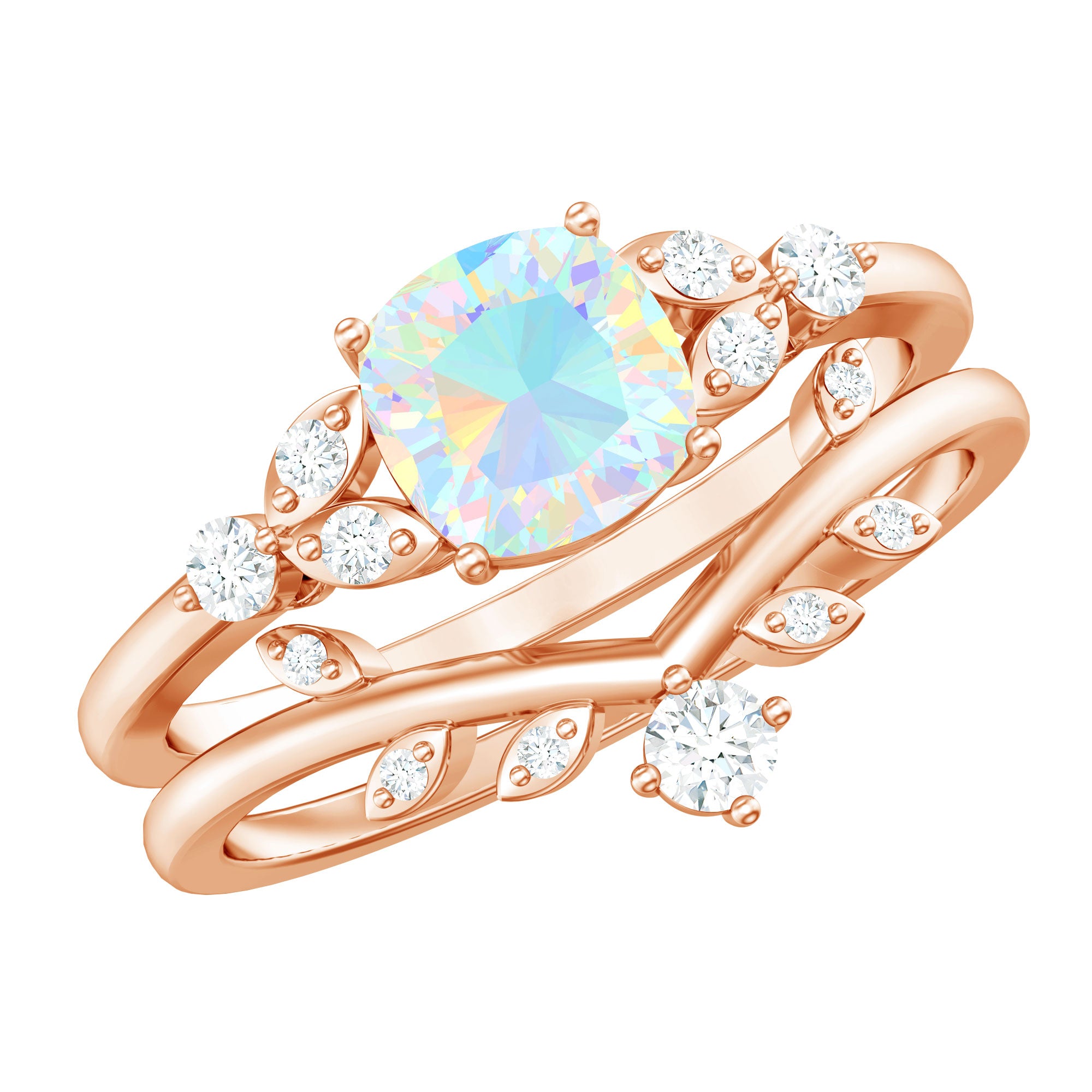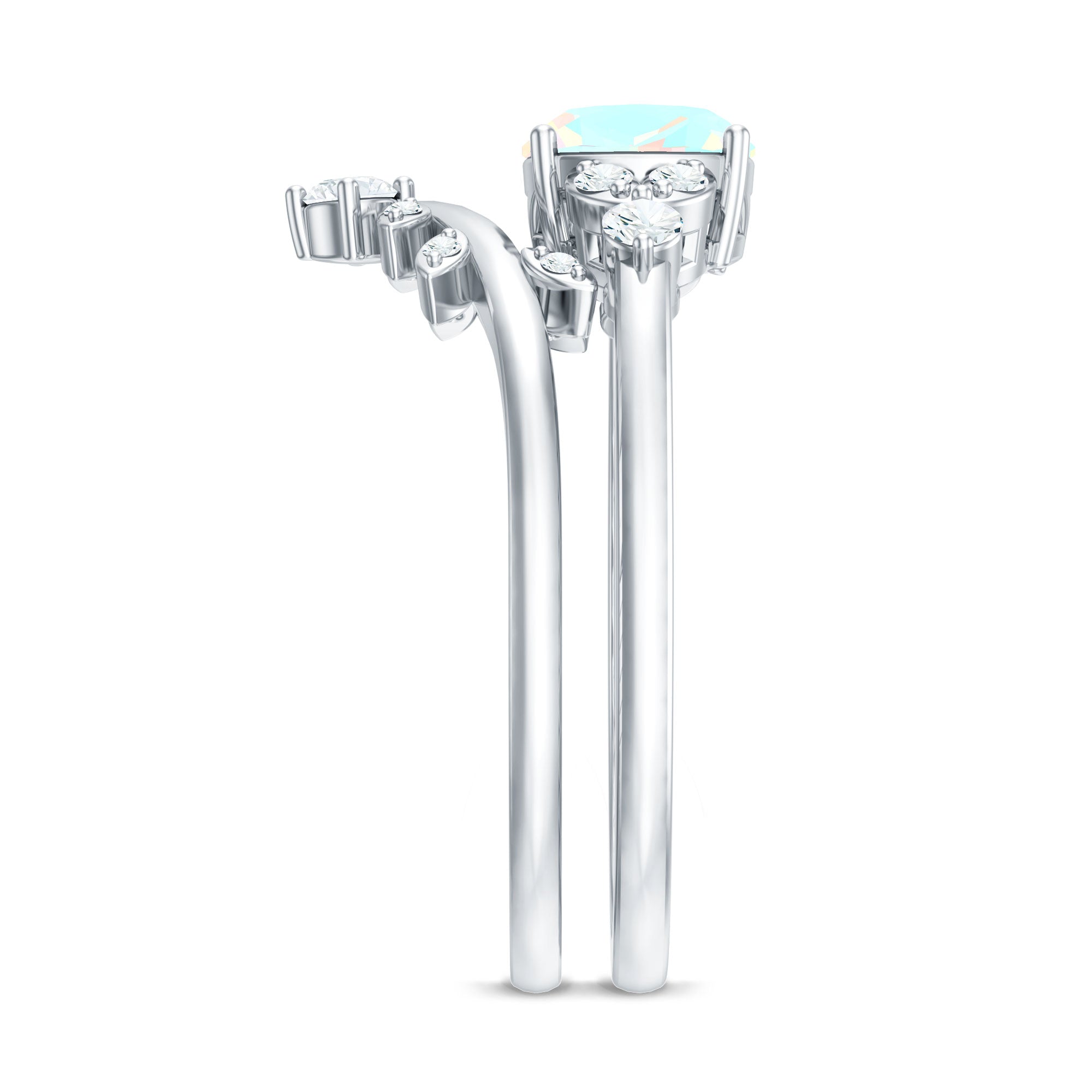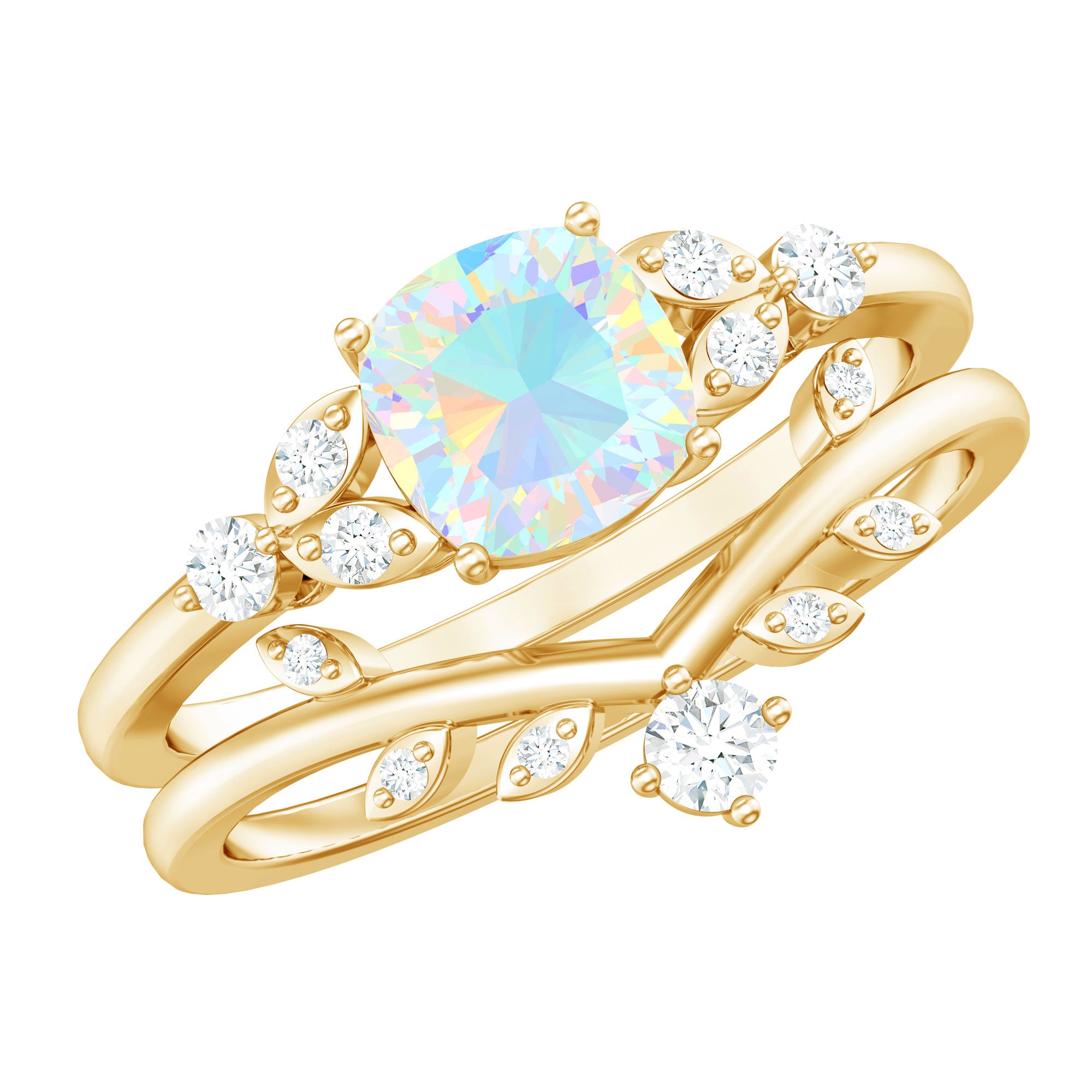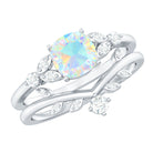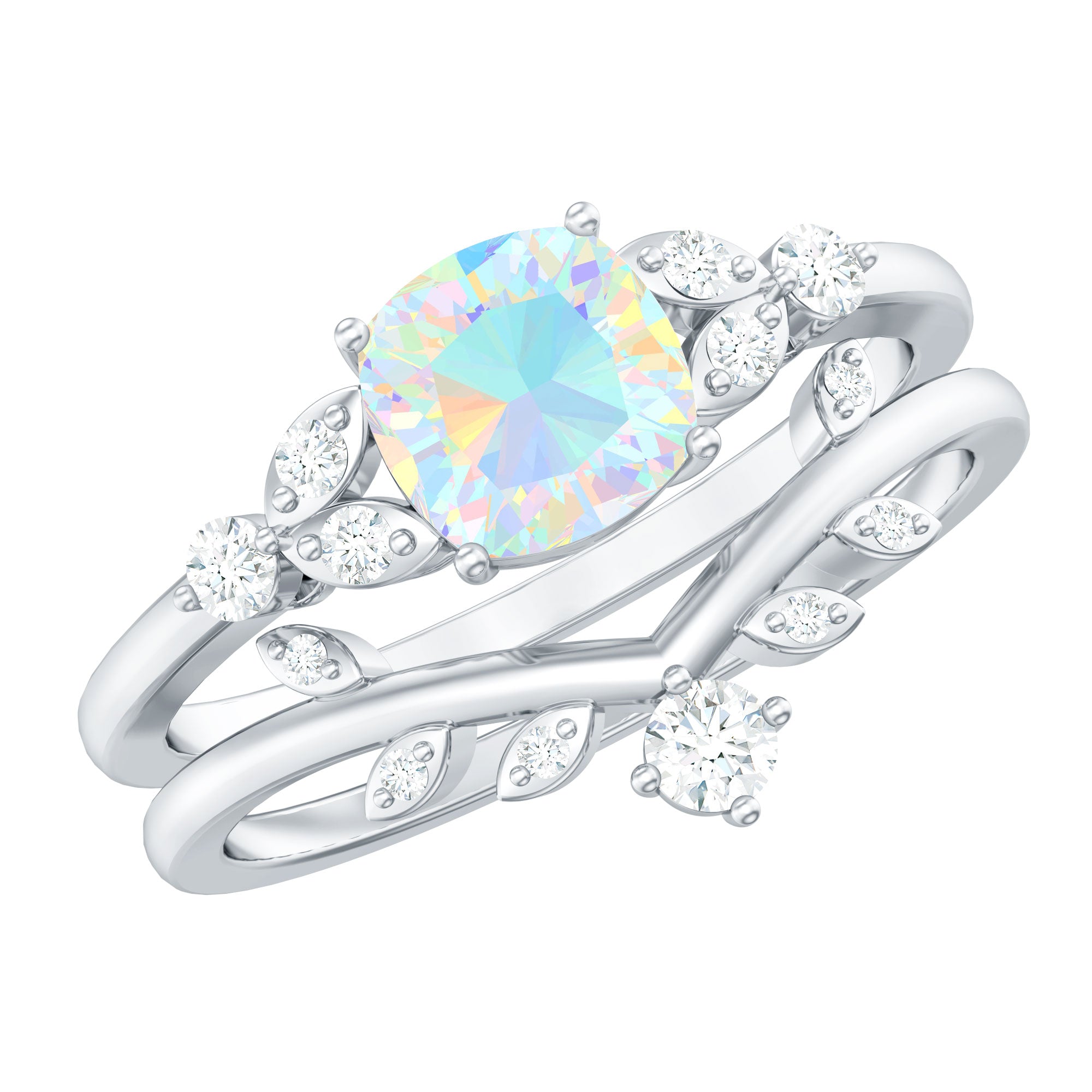 Timeless beauty and vintage charm come together in this breathtaking Ethiopian Opal Engagement Ring Set, designed for brides who love a bold yet elegant sparkle. The centerpiece of this set is an 6 MM cushion cut ethiopian opal set in secure prong setting and radiates brilliance and fire, enhanced with diamond trio on both sides of the center stone. What makes this piece truly special is the graceful pairing of the natural opal diamond engagement ring with a matching curved wedding ring guard, adorned with round shaped diamond stones, boosting its sparkle and giving the entire Vintage Bridal Ring Set the appearance of a stunning trio ring set, without the need for a third band. This 2 piece rings set is a tribute to timeless design, where every stone is placed with care and intention. The mix of brilliant sparkle and vintage styling makes it ideal for the bride who values tradition but also wants a touch of uniqueness. Whether you are walking down the aisle or simply celebrating a meaningful milestone, this Engagement Ring with Wedding Band Set makes a powerful statement of love and elegance.