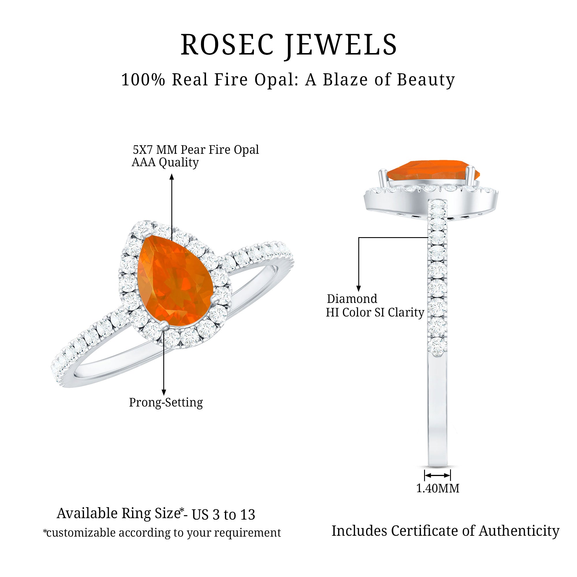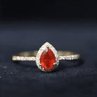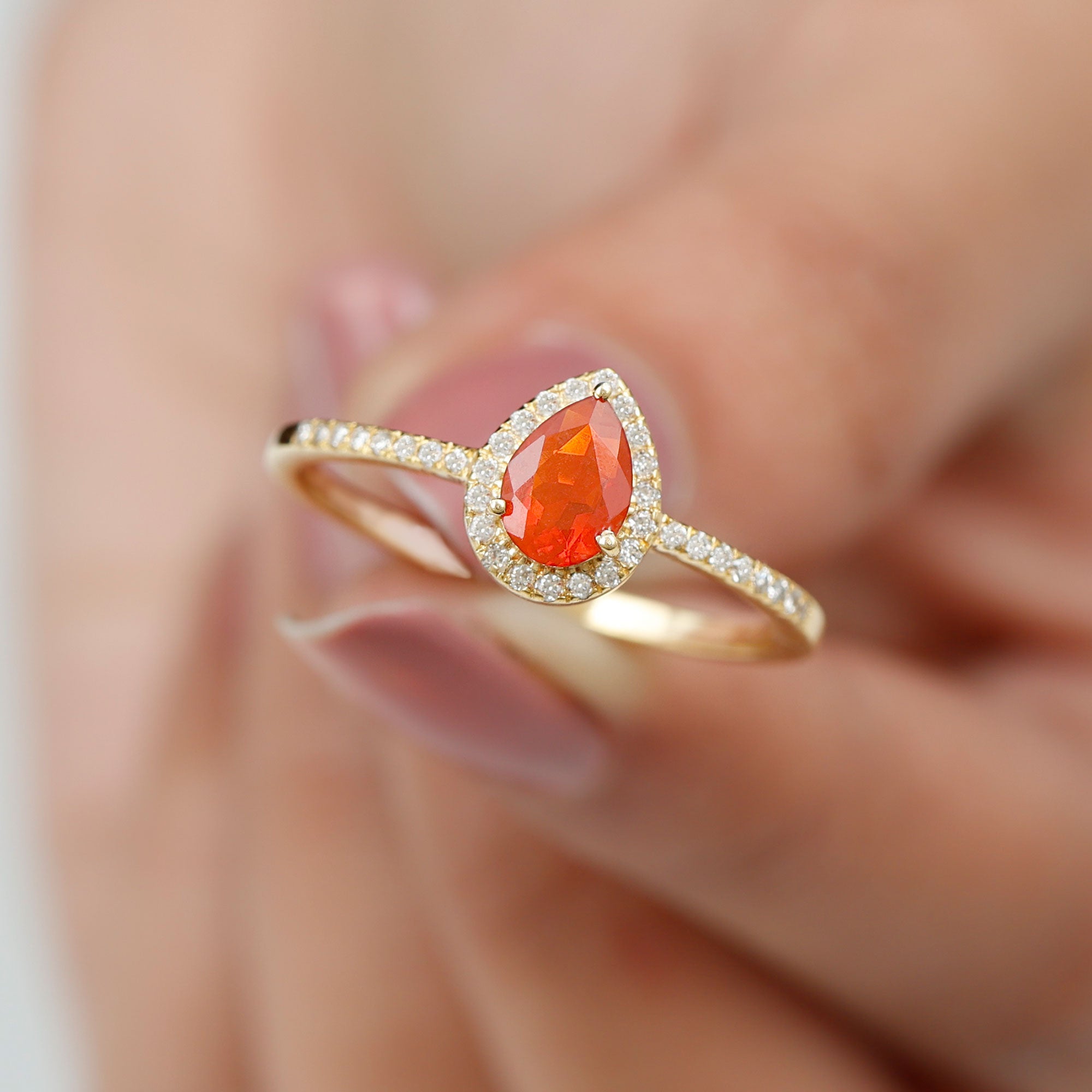 Make a striking statement with this beautiful Fire Opal Engagement Ring, designed for those who love color, warmth, and refined elegance. At the heart of this Teardrop Engagement Ring is a 5X7 MM pear shaped fire opal, held securely in 3 prong setting. Encircling the fire opal is a sparkling diamond halo that adds extra shine and highlights the unique beauty of the center stone. Along the band, round cut diamond side stones are carefully set to bring balance and brilliance to the design. Their soft shimmer perfectly complements the glowing look of the fire opal, creating a stunning contrast that feels both modern and timeless. Crafted with attention to detail, this Fire Opal and Diamond Ring blends colorful charm with classic elegance. Perfect for engagements, proposals, or special milestones, this Halo Engagement Ring symbolizes passion, commitment, and unforgettable moments meant to be cherished forever.