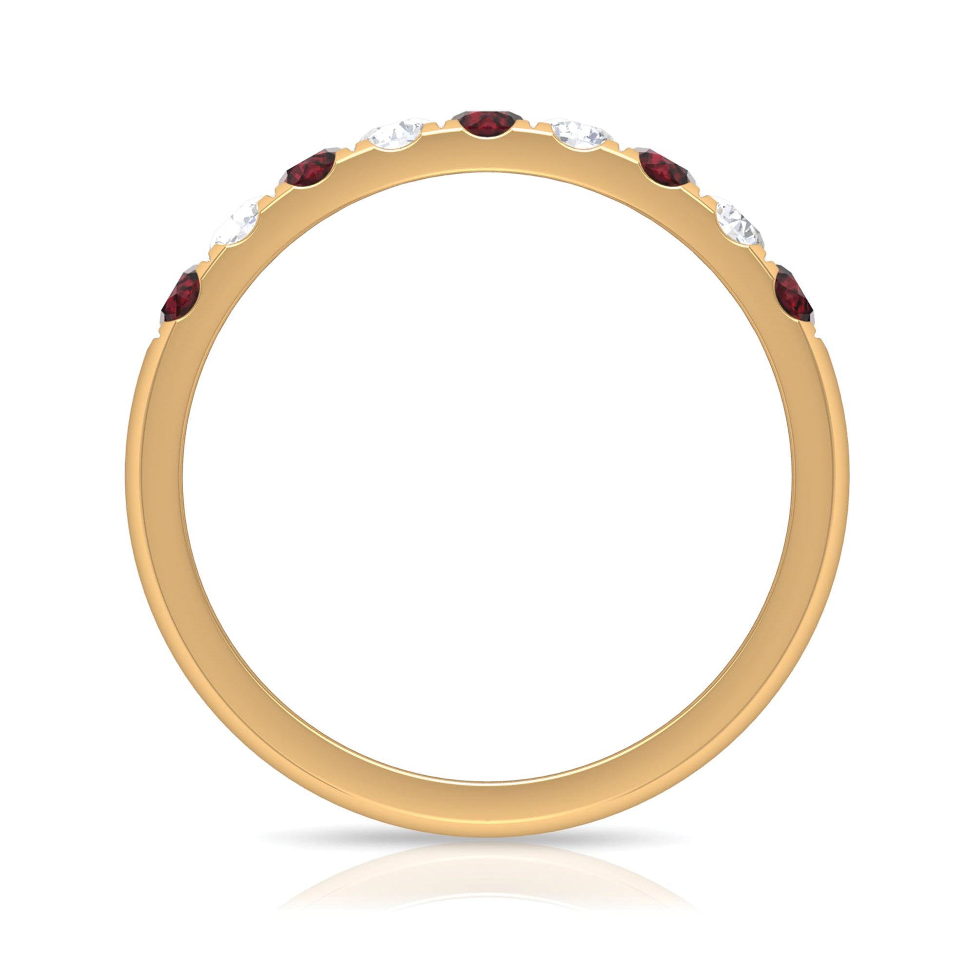The half eternity layout focuses gemstone detail along the upper portion of the ring, allowing the stones to remain visible while the underside stays smooth against the finger. The combination of garnet and diamond creates a defined rhythm of color and sparkle. This structured arrangement enhances visual impact without overwhelming the hand.