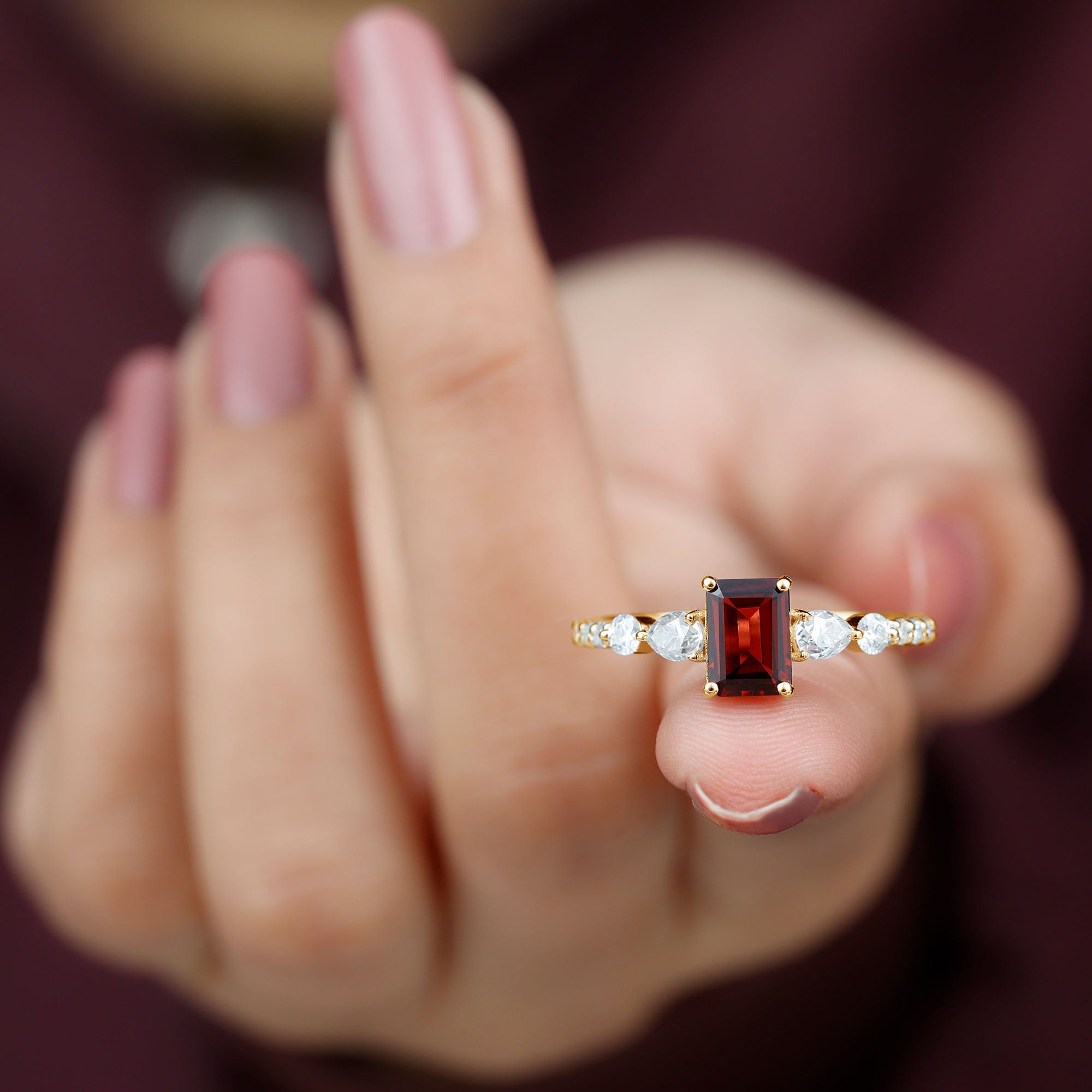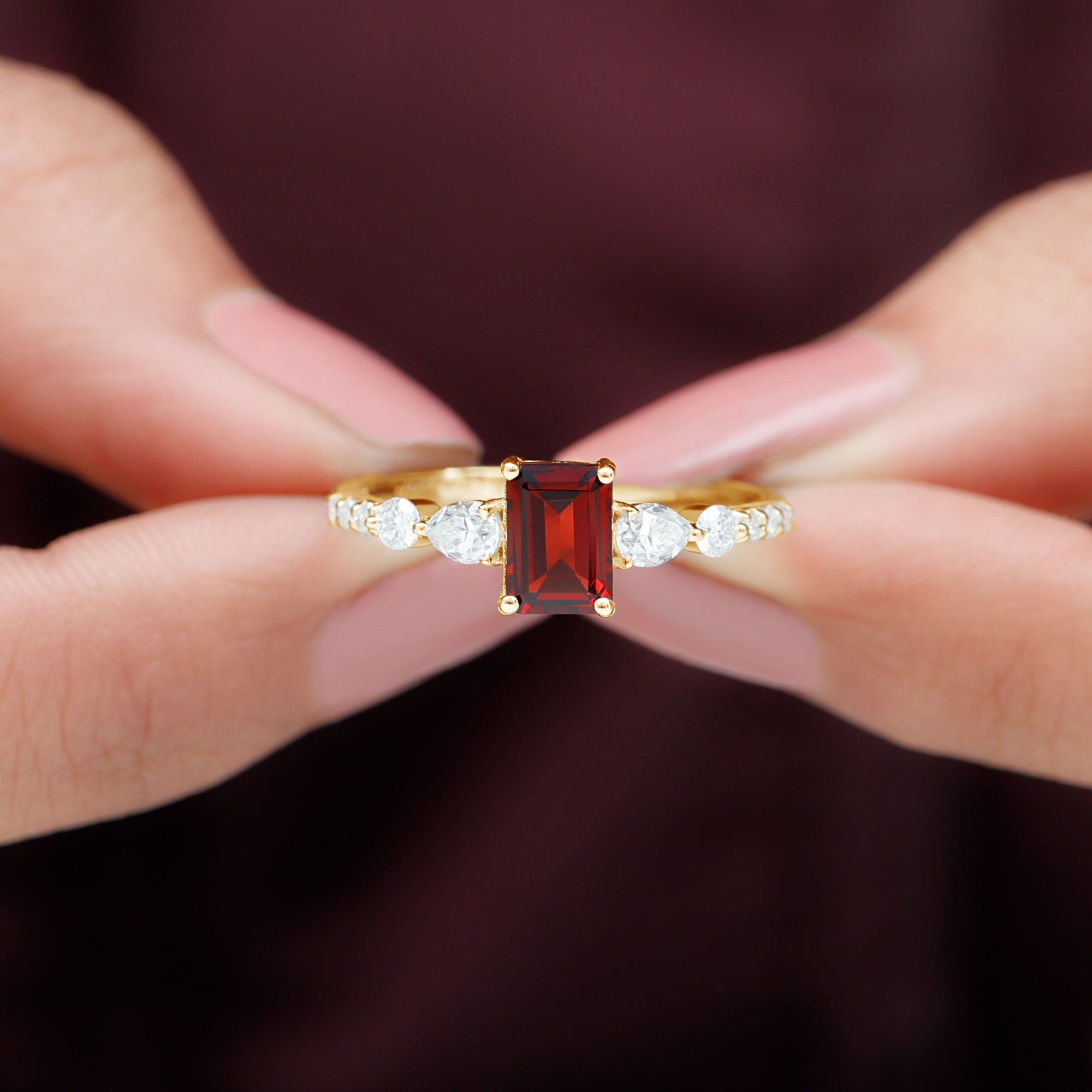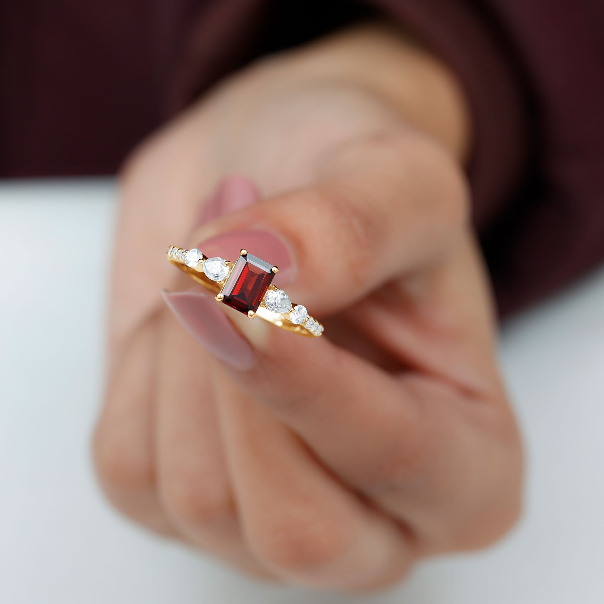 Indulge in the beauty of timeless elegance with this Emerald Cut Engagement Ring, a true symbol of everlasting love. The striking 6X8 mm Emerald Cut Garnet takes center stage in Prong Setting, its deep red color radiating passion and warmth. Flanking the central stone are exquisite Pear and Round Shape Diamond Side Stones, placed horizontally to add a touch of modern flair while perfectly complementing the bold AAA Quality Garnet. The thoughtful arrangement of these HI-SI Diamond stones enhances the overall design, bringing an elegant contrast to the sophisticated style of this Garnet Engagement Ring. Every detail is crafted to perfection, making this Garnet Diamond Ring a stunning representation of a love that is meant to last forever. Presented in a signature jewelry box and available in various US ring sizes, this Classic Engagement Ring is ready to be given as the ultimate token of your commitment. Whether for a proposal or a milestone anniversary, this Emerald Cut Garnet Ring is sure to leave a lasting impression. Classic yet contemporary, it is the perfect way to express your deepest affection with a piece that is as unique and beautiful as your love story.