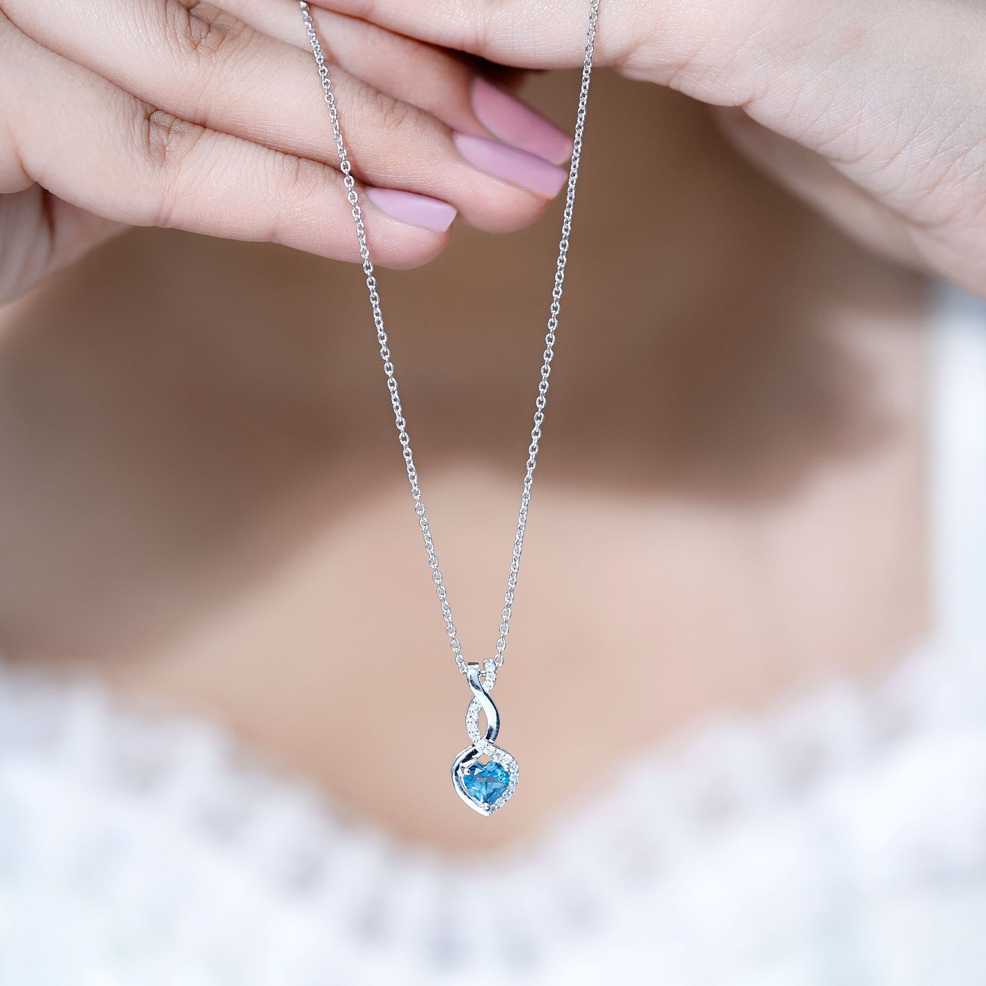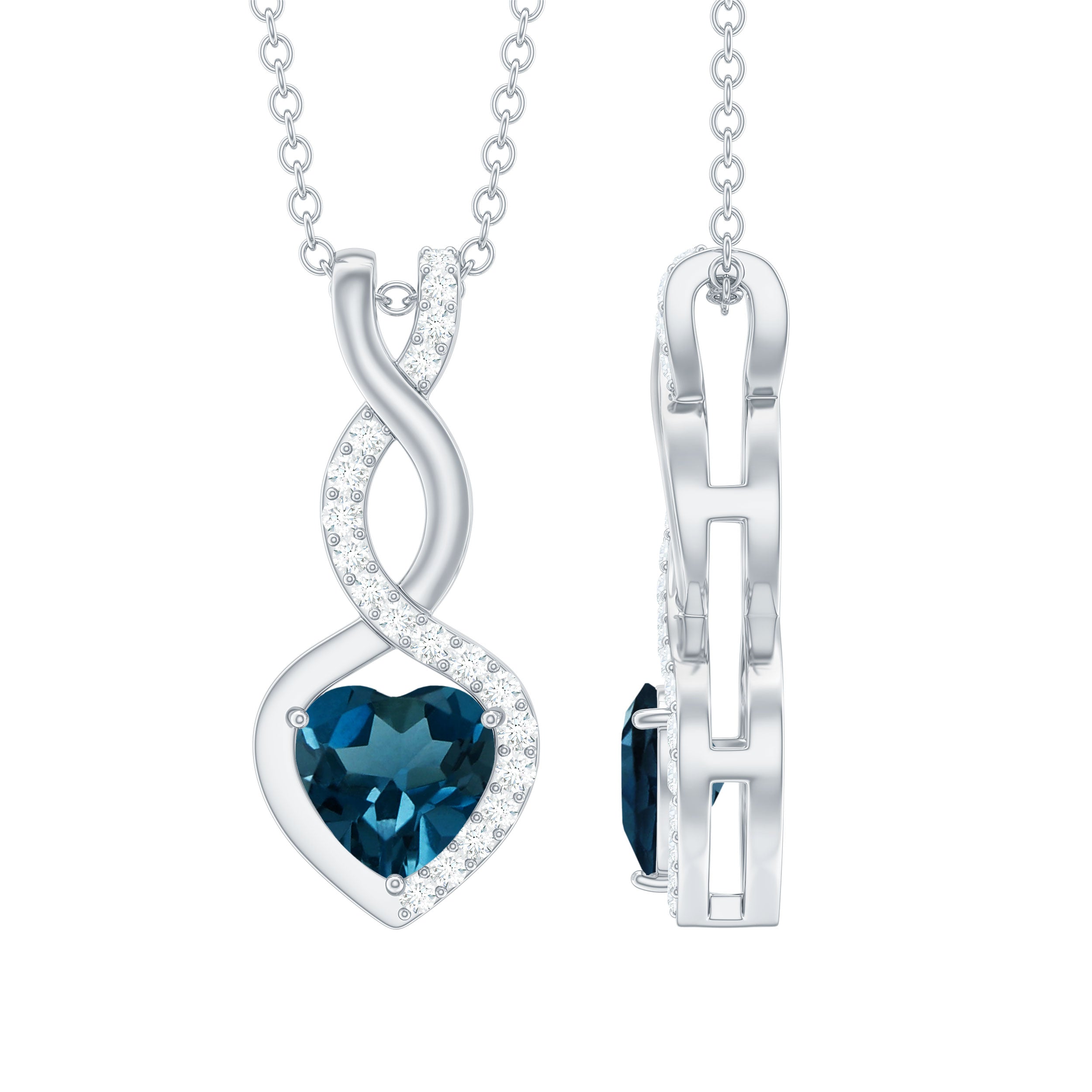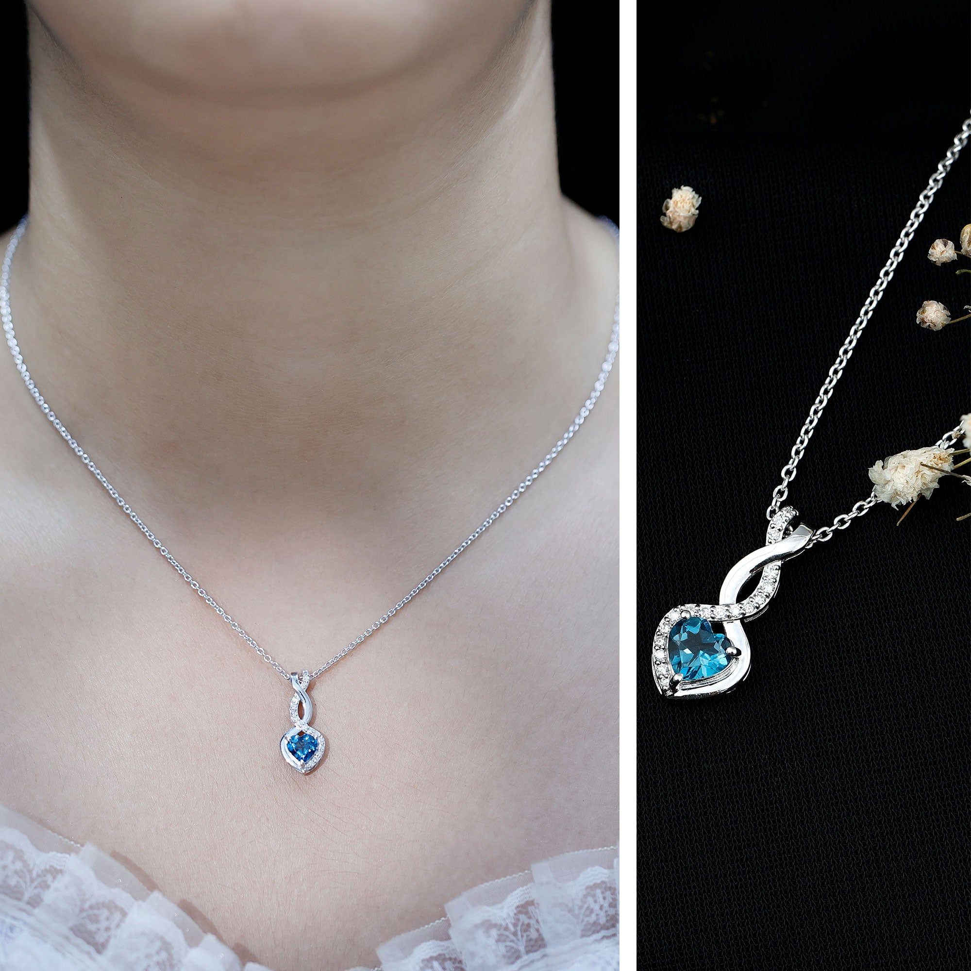 Delicate, meaningful, and undeniably elegant, this London Blue Topaz Necklace is the kind of piece that tells a story of forever love and deep connection. Crafted in white gold plated silver, the Heart Infinity Pendant features a striking 6 MM heart shaped London Blue Topaz, securely set in prongs and framed by a graceful infinity loop, which is decorated by lab grown diamonds to add sparkle. Dangling from a cable chain, it sits beautifully on the neckline, ideal for everyday elegance or special moments. The AAA quality London Blue Topaz and EF-VS quality lab grown diamond offer exceptional beauty and sparkle, making this piece not only visually stunning. More than just a pretty accessory, this Blue Topaz and Diamond Necklace is a symbol of everlasting love and emotional connection. The heart represents affection, while the infinity loop stands for eternity, together they create a powerful message that words sometimes cannot express. Perfect as a thoughtful gift for anniversaries, birthdays, or just because, this Heart Shaped Blue Topaz Necklace captures both beauty and meaning in one unforgettable design.