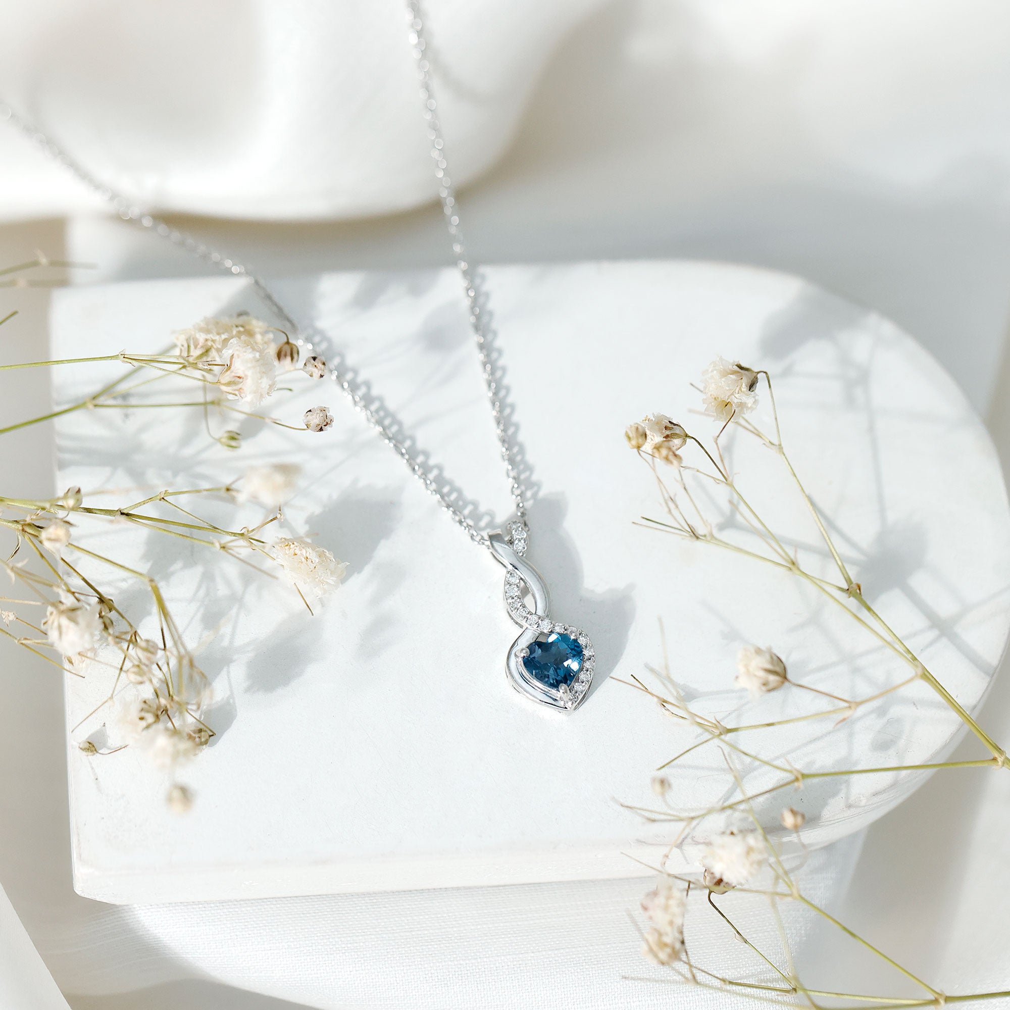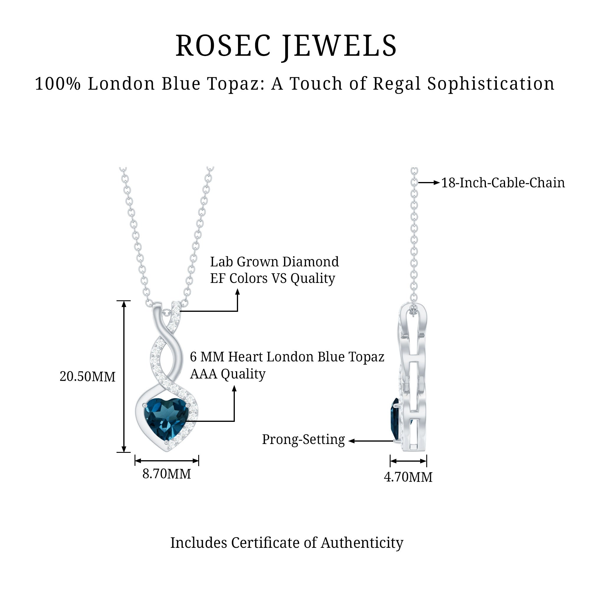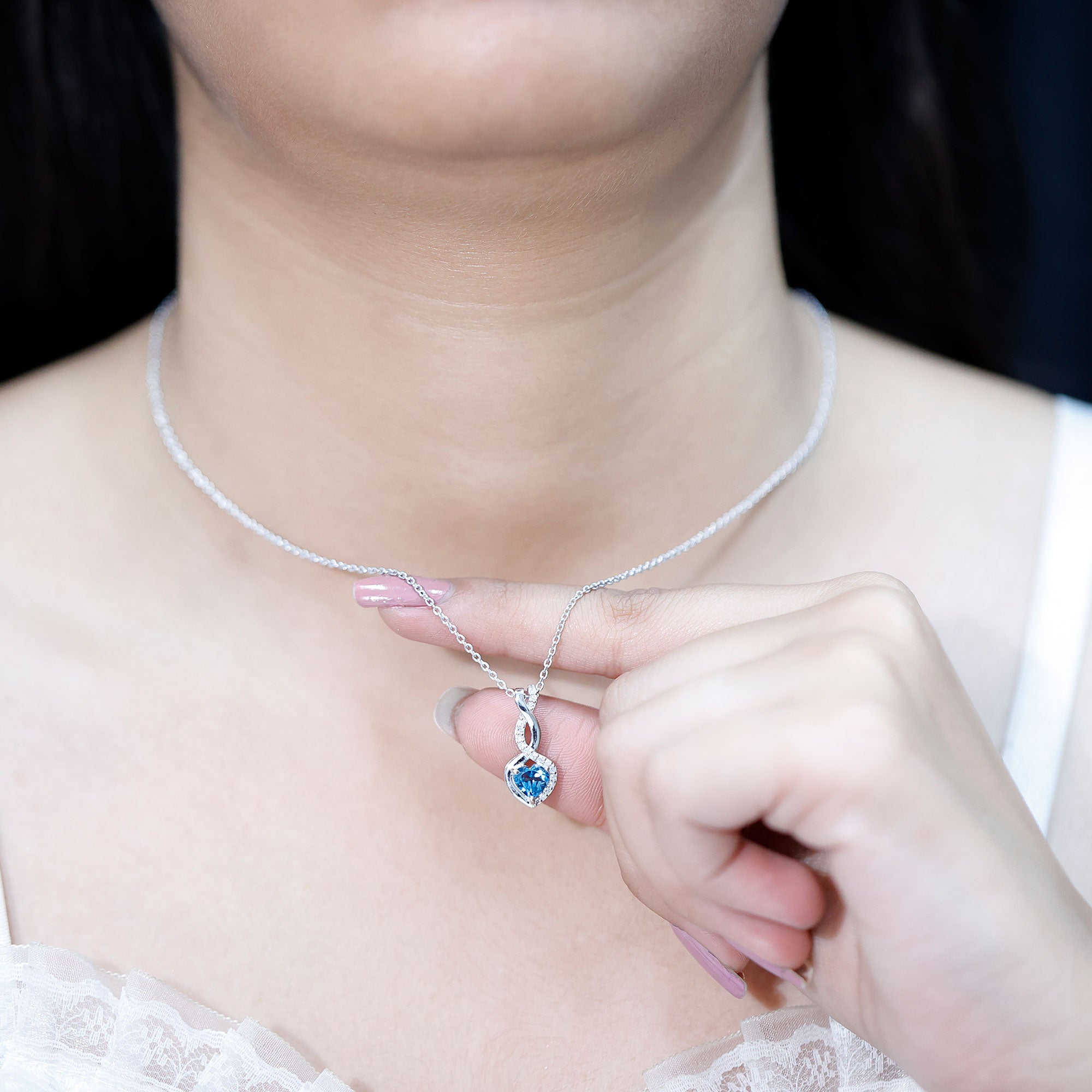 Delicate, meaningful, and undeniably elegant, this London Blue Topaz Necklace is the kind of piece that tells a story of forever love and deep connection. Crafted in white gold plated silver, the Heart Infinity Pendant features a striking 6 MM heart shaped London Blue Topaz, securely set in prongs and framed by a graceful infinity loop, which is decorated by lab grown diamonds to add sparkle. Dangling from a cable chain, it sits beautifully on the neckline, ideal for everyday elegance or special moments. The AAA quality London Blue Topaz and EF-VS quality lab grown diamond offer exceptional beauty and sparkle, making this piece not only visually stunning. More than just a pretty accessory, this Blue Topaz and Diamond Necklace is a symbol of everlasting love and emotional connection. The heart represents affection, while the infinity loop stands for eternity, together they create a powerful message that words sometimes cannot express. Perfect as a thoughtful gift for anniversaries, birthdays, or just because, this Heart Shaped Blue Topaz Necklace captures both beauty and meaning in one unforgettable design.
