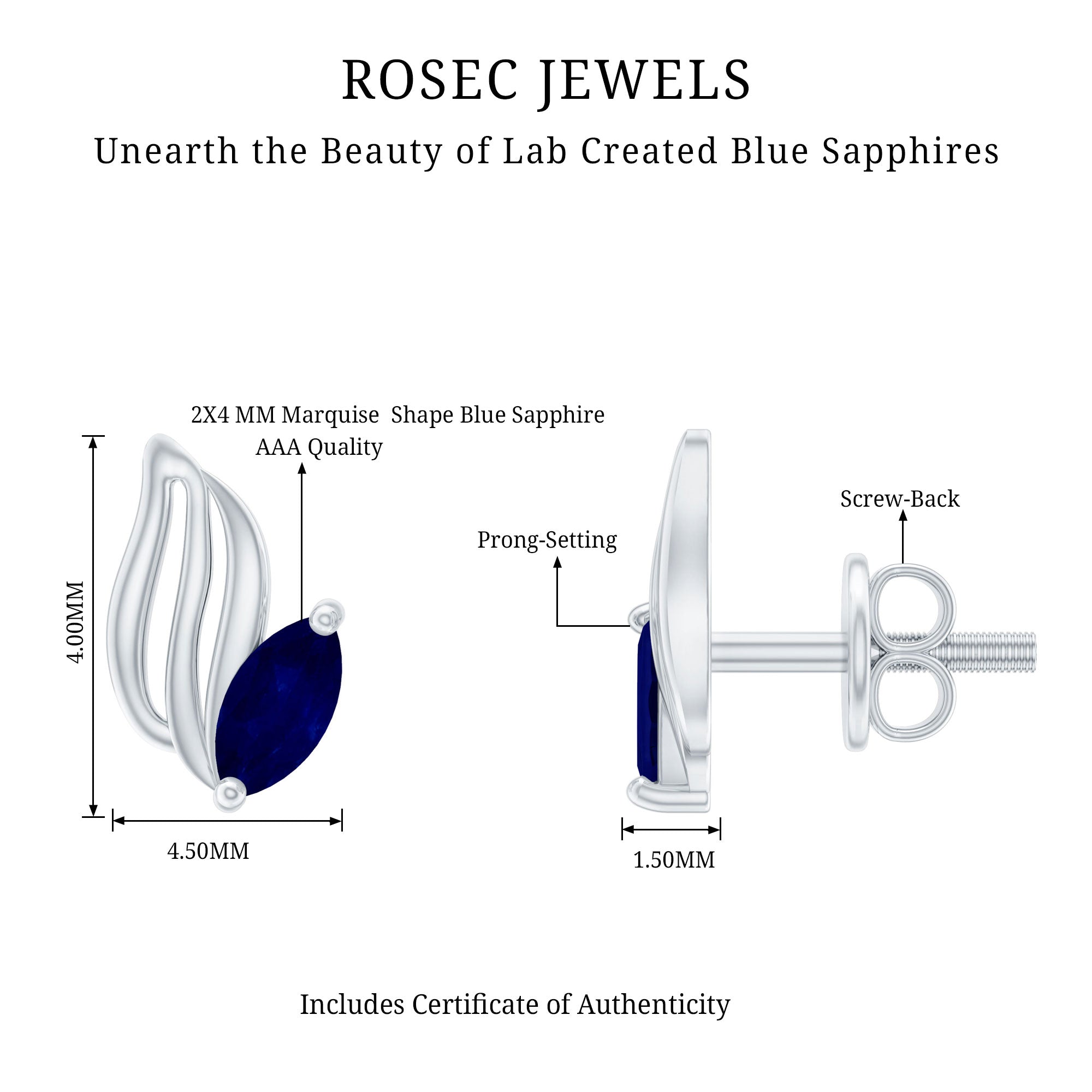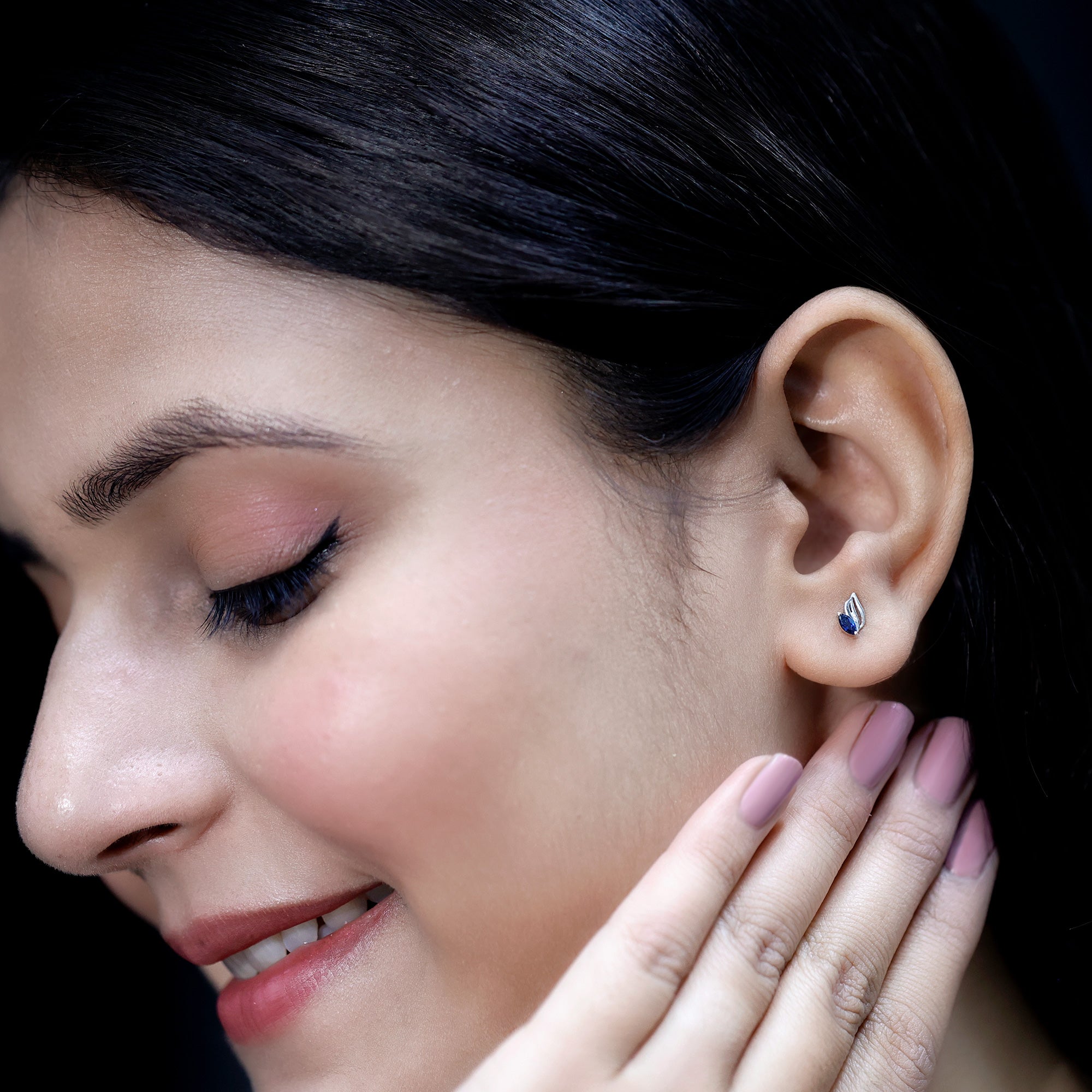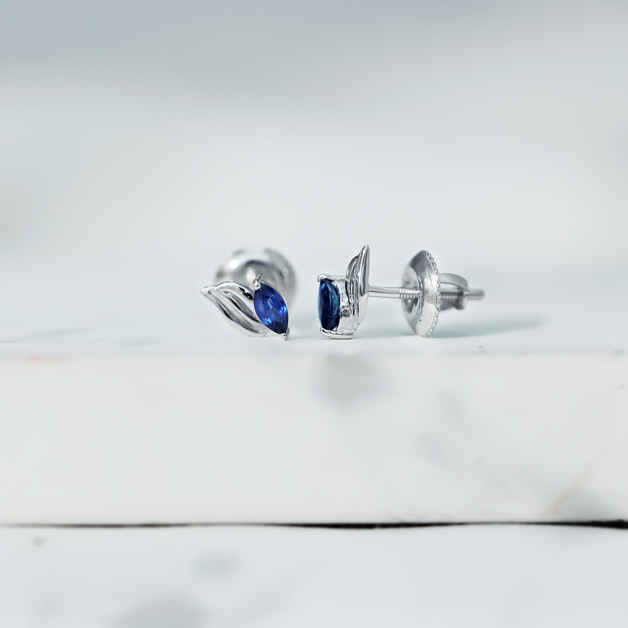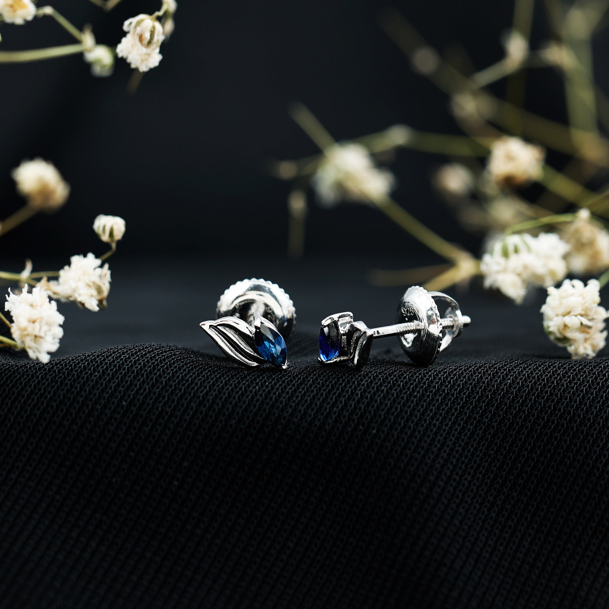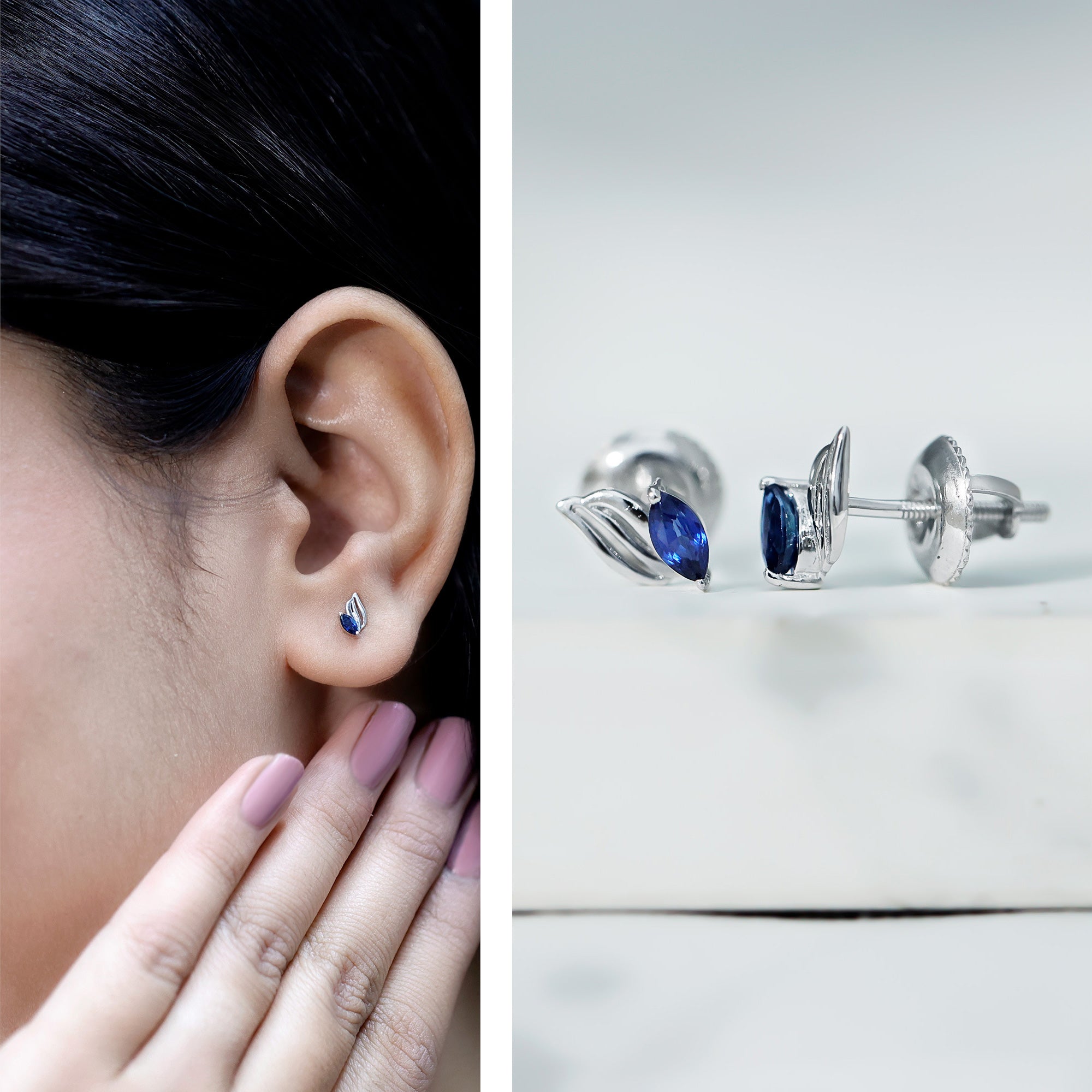 Nature meets elegance in a design that feels both earthy and classic. These Blue Sapphire Stud Earrings are a quiet nod to natures beauty, made to bring a touch of September’s birthstone charm into your everyday style. Each stud features a 2X4 MM marquise cut blue sapphire, set securely in prongs. The gemstone nestles perfectly into a leaf-inspired frame, handcrafted in 925 sterling silver. The flowing lines of the metal leaf give the design a graceful and modern look, soft enough for everyday wear, yet polished enough to elevate your evening outfits. The contrast between the dark sapphire and cool silver tones creates an eye-catching finish. Designed with screw back closures, these Silver Leaf Earrings are made to stay comfortably all day. Whether you pair them with other jewelry pieces or wear them solo, the subtle shape and elegant sparkle make them easy to style. Perfect for September birthdays, thoughtful gifting, or simply adding a fresh detail to your jewelry rotation, these Marquise Stud Earrings bring just the right blend of simplicity, creativity, and timeless appeal.