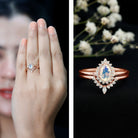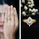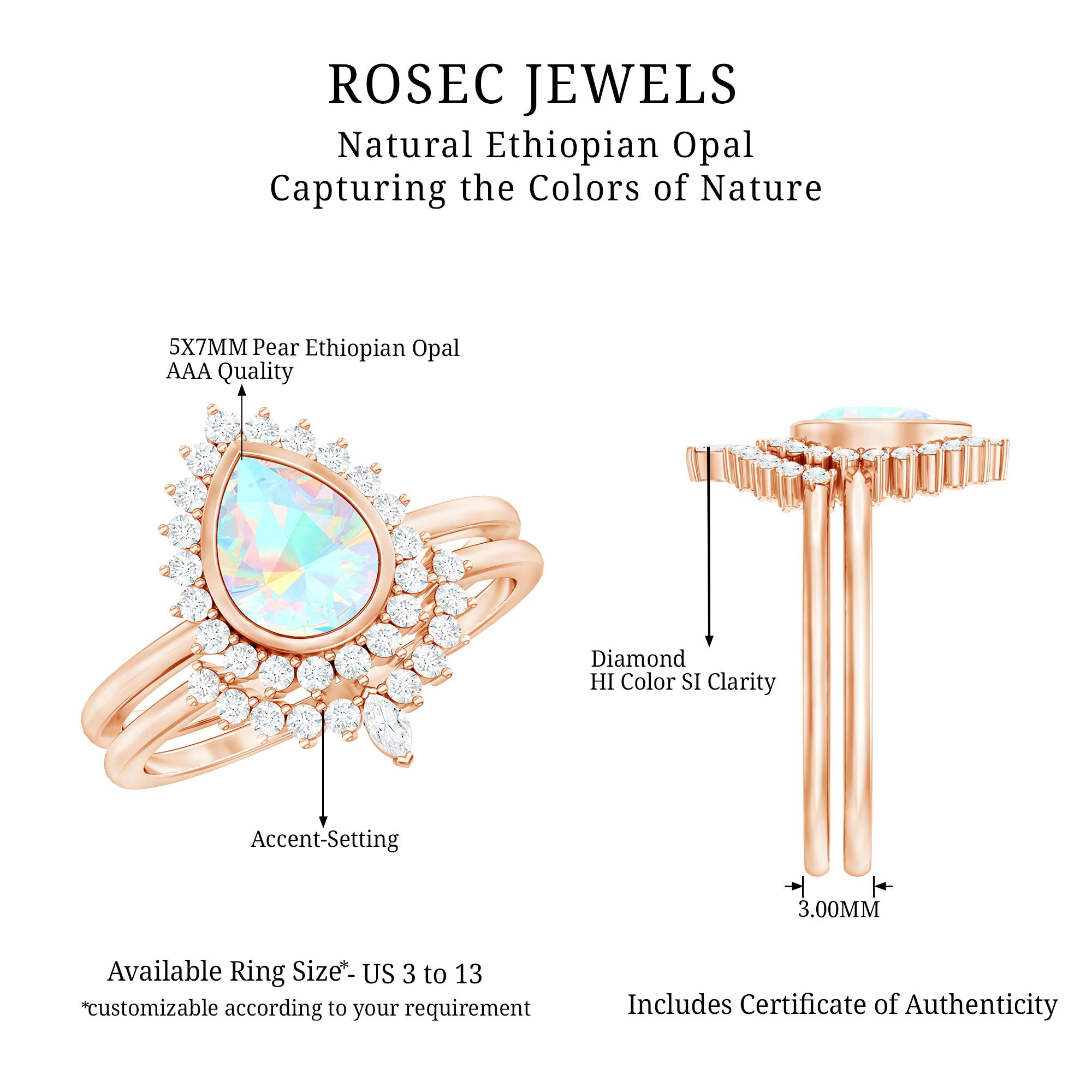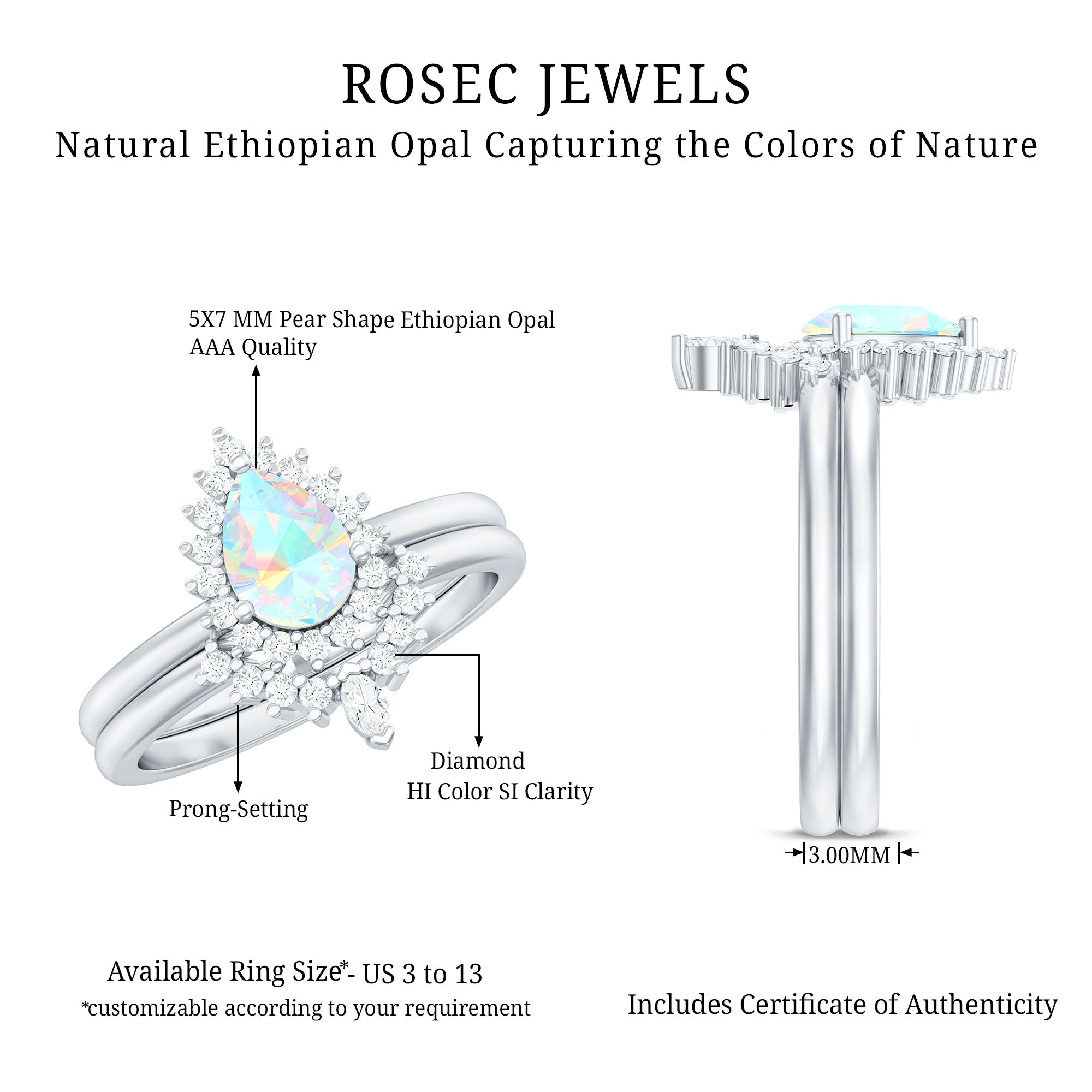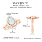 Step into your fairytale with this Vintage Inspired Wedding Bridal Ring Set, a romantic duo designed to celebrate your once-in-a-lifetime love. The dreamy Teardrop Engagement Ring of this 2 Piece Ring Set features a 5X7 mm Pear Shape Ethiopian Opal, glowing with rainbow hues and crowned in a delicate halo of sparkling Diamond stones. This engagement ring is perfectly paired with a Curved Diamond Wedding Ring, designed to cradle the teardrop engagement ring in a seamless, graceful arc. Together, they create a bold yet timeless design that whispers vintage glamour with a modern soul. Crafted for brides who crave both beauty and meaning, this Opal Engagement Ring Set is made to be worn forever and adored every step of the way. Whether stacked together or worn separately, each ring brings its own charm and sparkle. Arrives in a luxurious jewelry box and available in a wide range of sizes to ensure the perfect fit from yes to I do. Ethereal, elegant and endlessly unique, just like your love story. This Opal Wedding Ring Set is your forever, wrapped in light.