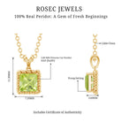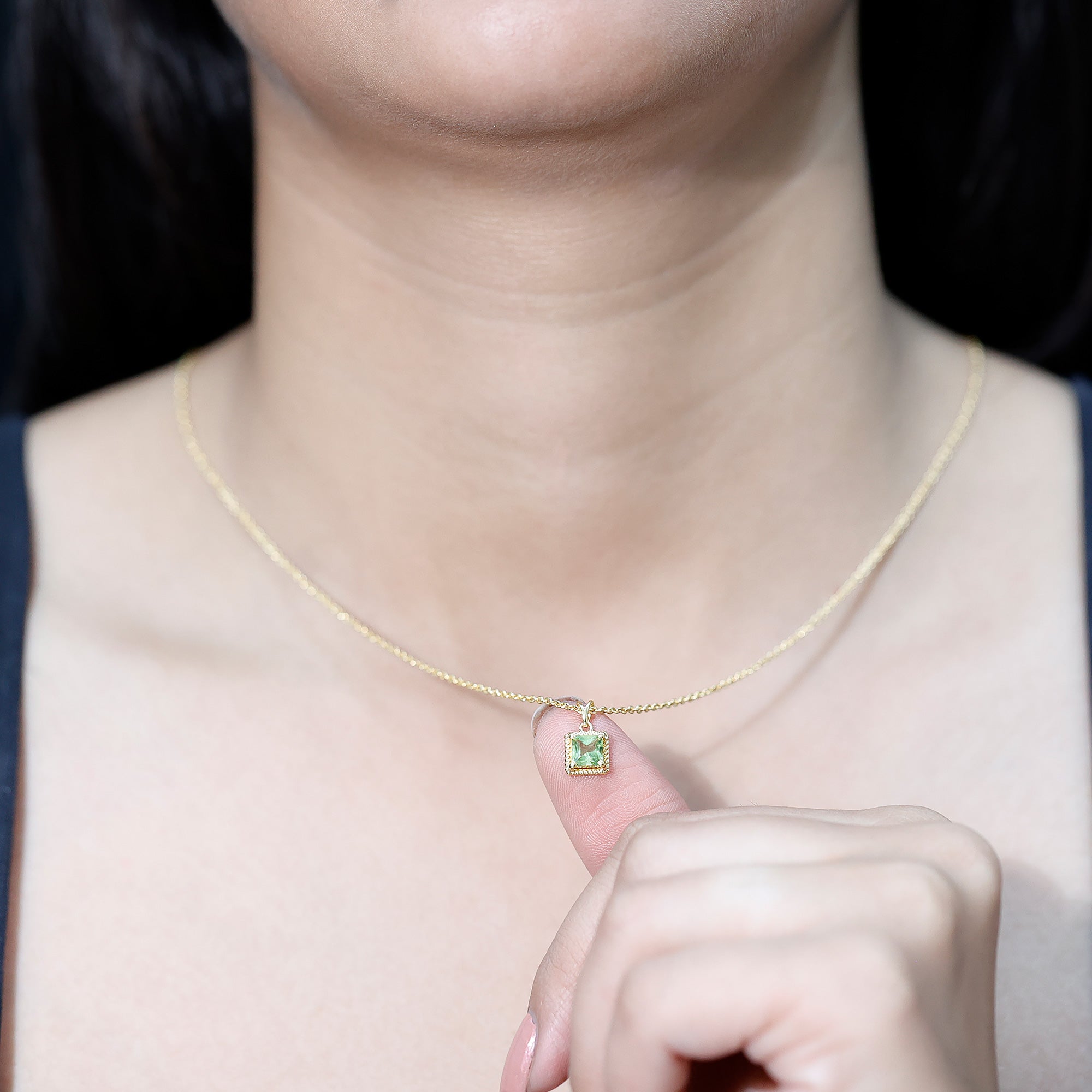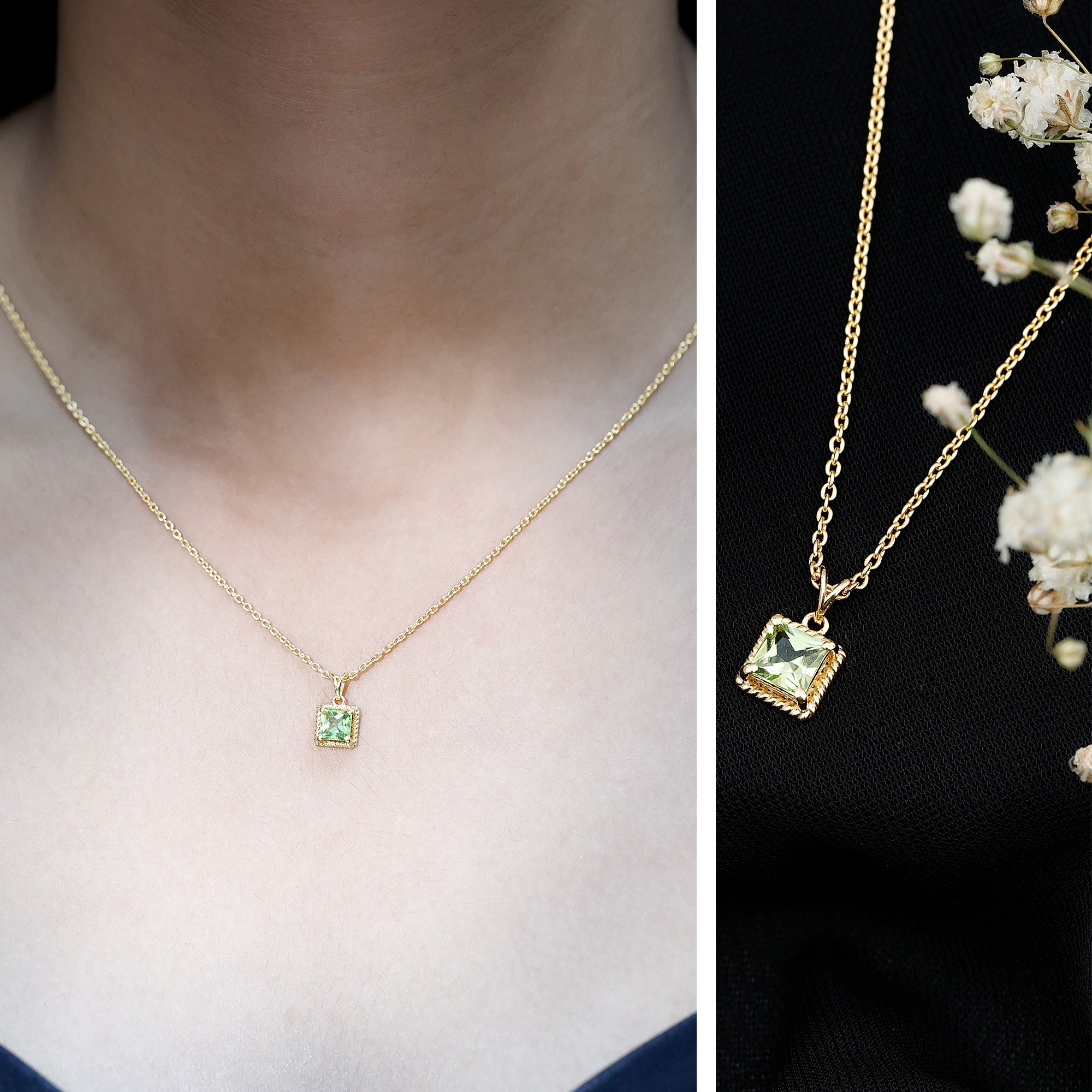 With a touch of minimal elegance, this Peridot Pendant Necklace effortlessly grabs everyones attention, sparkling with every little movement. Made from Yellow Gold Plated Silver, this pendant features 5 MM Princess Cut Peridot set in Prong Setting, complete with twisted rope details. Hanging from a strong cable chain, this Solitaire Pendant exudes a captivating charm that blends classic elegance with stunning beauty. Its majestic and refined design makes it an ideal choice for everyday wear or paired with an office outfit. It draws attention without being too much, and this graceful and feminine Princess Cut Necklace adds depth to its striking appearance. The royal glow of this August Birthstone Necklace speaks of sophisticated taste and is a timeless beauty investment. As a cherished piece destined to be part of your collection, it is perfect for celebrations, serving as a token of love or a personal declaration to be treasured and remembered for years to come. Whether worn as a symbolic piece or given as a heartfelt gift to someone who loves classic pieces of jewelry, this piece enhances the beauty of every moment. This Green Gem Necklace is accompanied by a certificate of authenticity for the gemstones and is presented in a premium quality signature jewelry box.