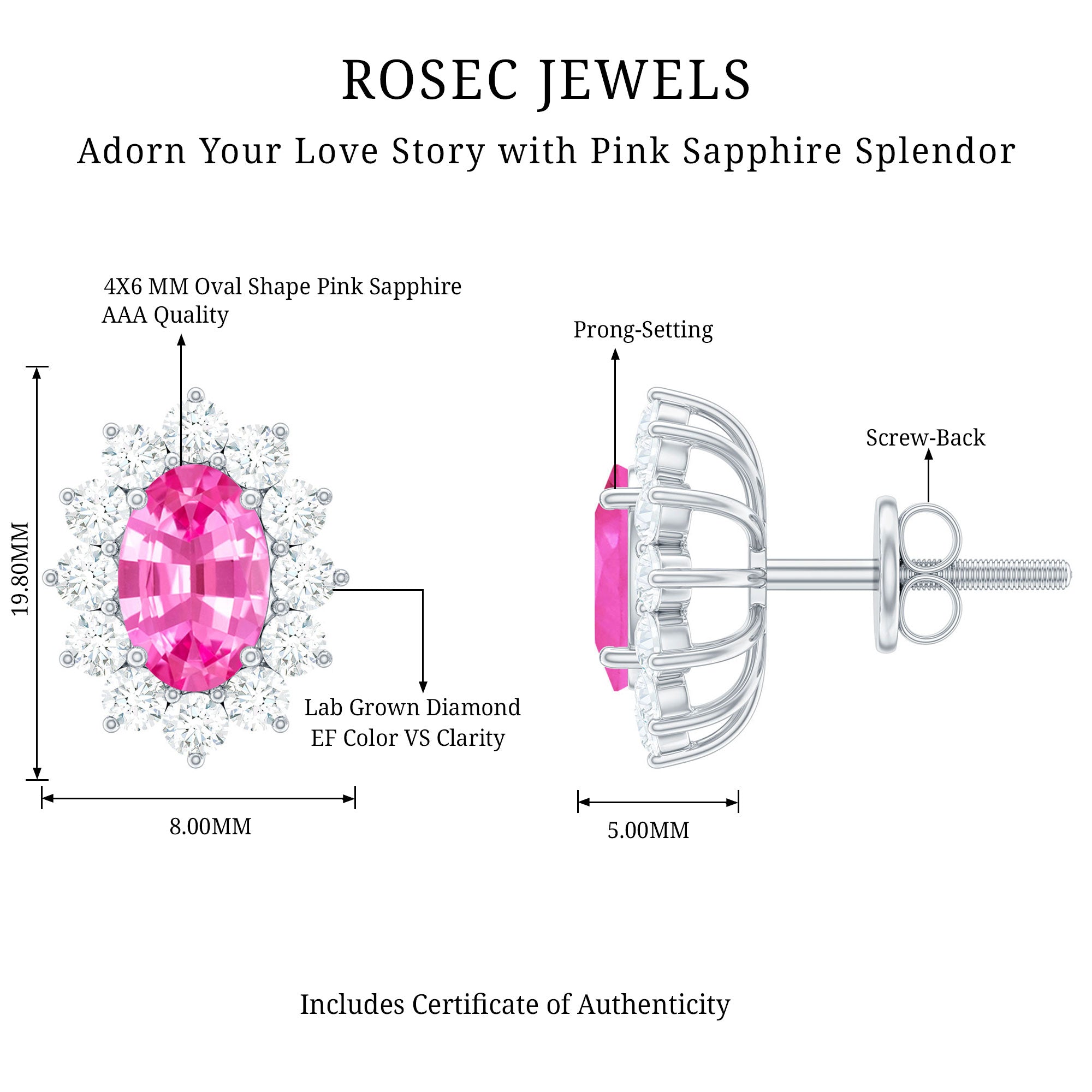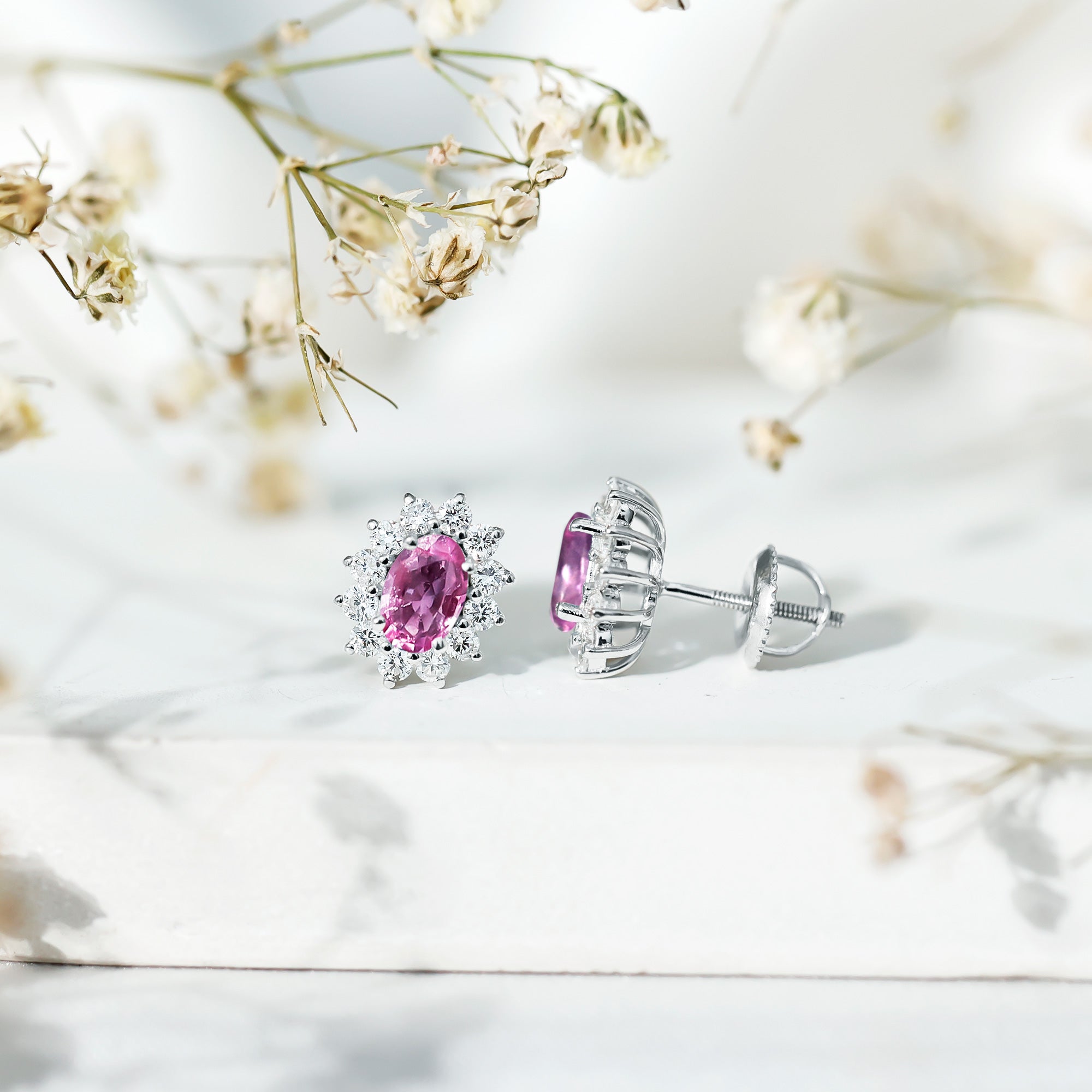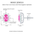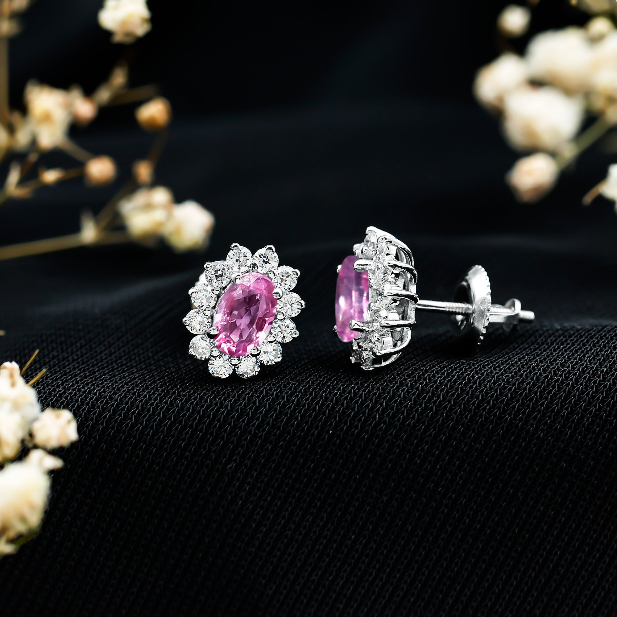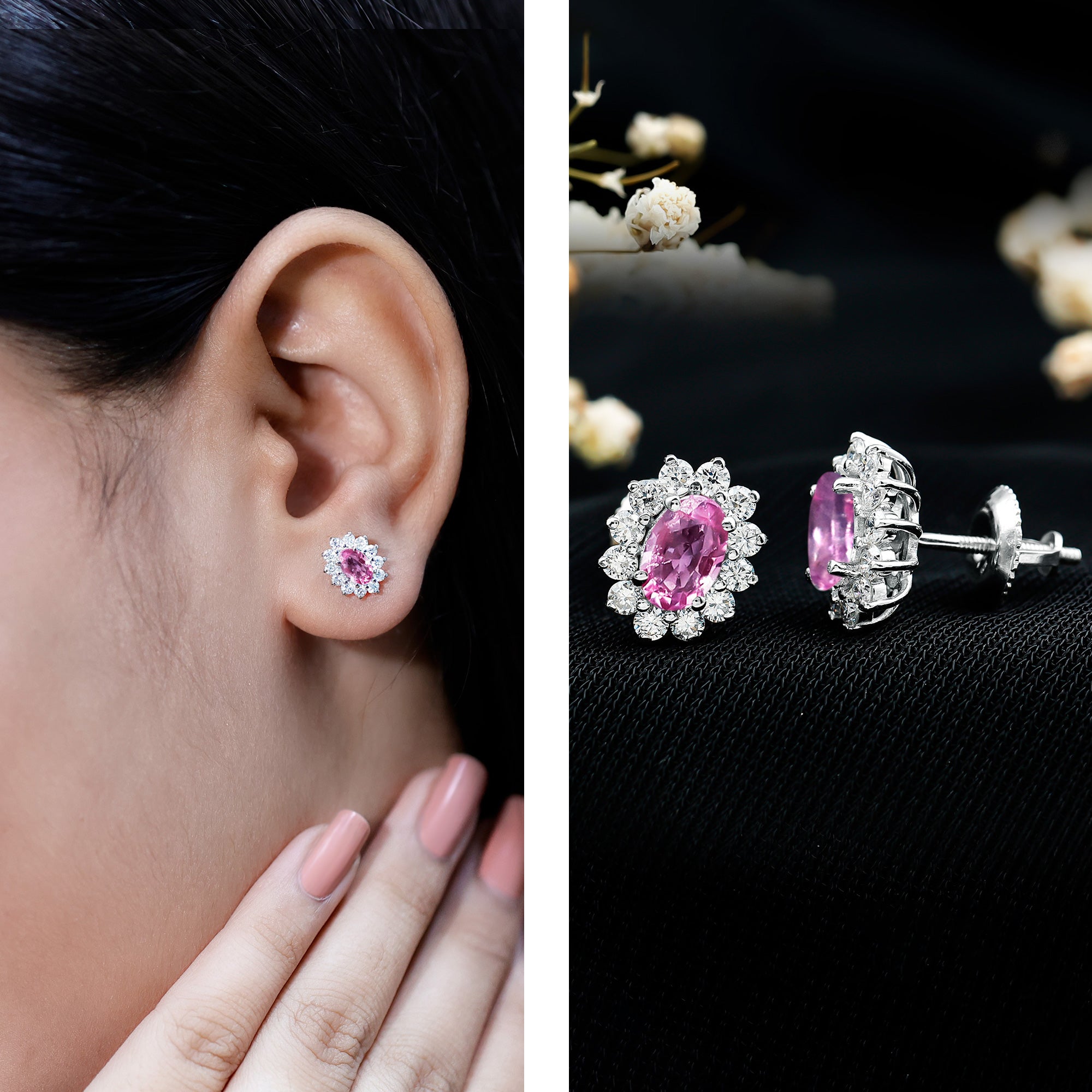 Add a soft, romantic sparkle to your look with these stunning Pink Sapphire Earrings. Thoughtfully designed to blend elegance with a modern touch, these timeless ear studs feature a 4X6 MM oval shaped Pink Sapphire at the center, set in secure prong setting. Surrounding the center stone is a dazzling halo of round brilliant cut lab grown diamonds that adds just the right amount of shine and luxury. The delicate blend of pink and white creates a graceful contrast, making these Sapphire Halo Earrings perfect for any woman who loves jewelry that feels feminine and meaningful. Crafted with 14k white gold plated silver and finished with secure screw back closures, these Pink Sapphire and Diamond Stud Earrings are made for everyday elegance or special celebrations. Whether you are dressing up for a romantic dinner, a wedding, or simply adding charm to your daily outfit, these Pink Gemstone Earrings are sure to make a lasting impression. More than just an accessory, they symbolize love, beauty, and confidence. The combination of AAA quality Pink Sapphire and EF-VS quality lab grown diamonds gives them a refined look that is ideal for gifting, whether it is an anniversary, a birthday, or a sweet surprise. These earrings offer a sophisticated design with a soft sparkle that every woman would love to wear all day long.