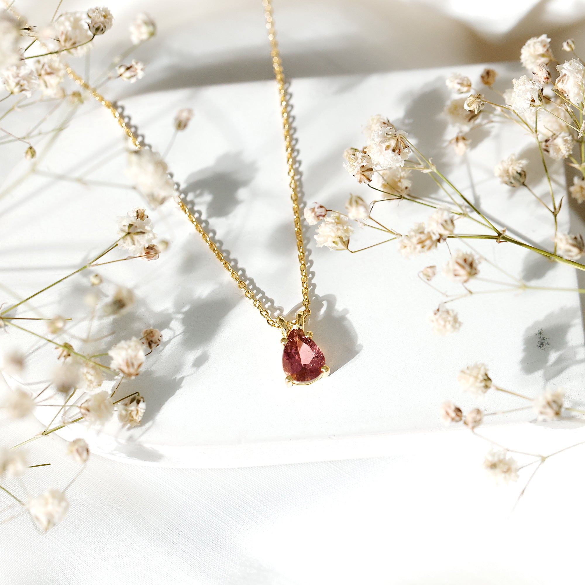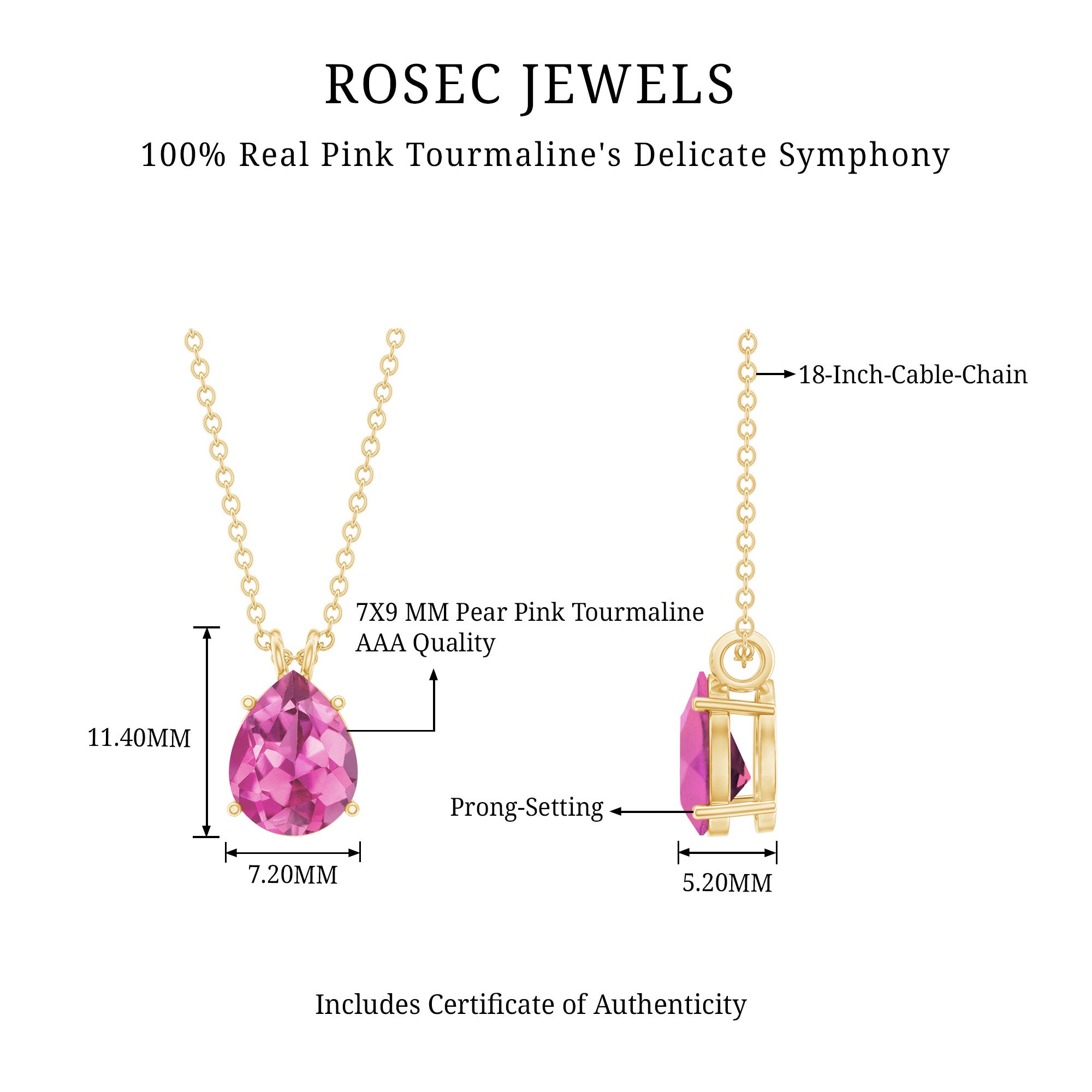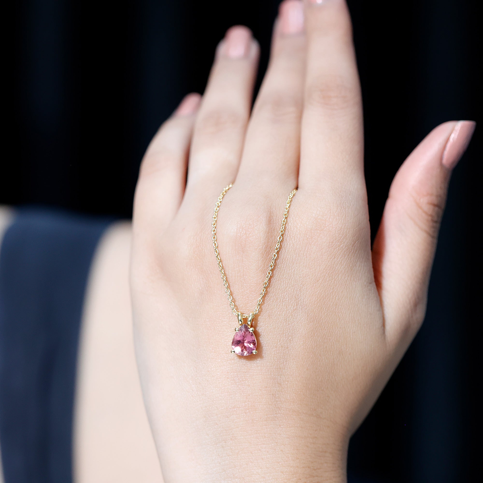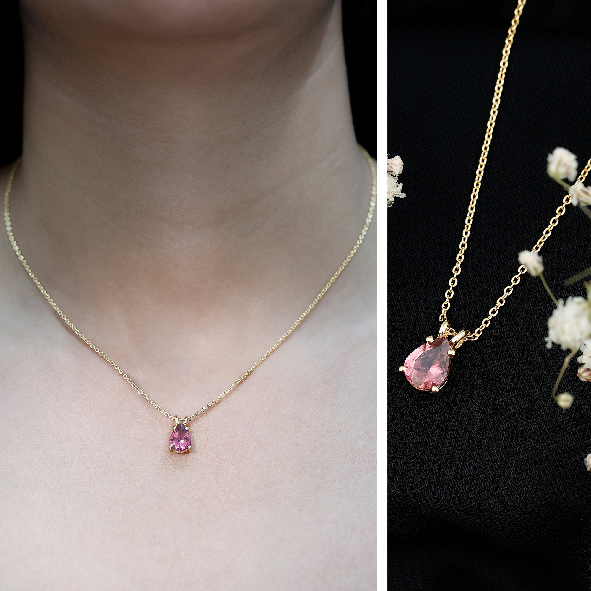 Add a soft and meaningful sparkle to your style with this beautiful Pink Tourmaline Necklace. Featuring a 7X9 MM pear shaped pink tourmaline, this Teardrop Necklace is a lovely way to celebrate October’s birthstone. Known as a stone of love, peace, and emotional strength, pink tourmaline is believed to bring calm and comfort to the heart. The gemstone is set in a secure 4 prong setting, allowing its natural beauty to shine brightly. It hangs from a stylish rabbit ear bail that adds a touch of elegance and gives the pendant a smooth, flowing look. The entire piece is handcrafted in 14K yellow gold plated silver, which adds warmth and glow to the rich pink color of the tourmaline. Simple yet eye-catching, this Pink Gem Necklace is perfect for everyday wear or for dressing up special occasions. The timeless teardrop shape gives it a graceful and feminine touch. Whether you are gifting it to someone born in October or treating yourself to something special, this October Birthstone Necklace holds a deeper meaning beyond its beauty. Wear it as a symbol of love and emotional balance, or simply enjoy its bright color and elegant design. This Solitaire Necklace is a timeless piece youll treasure for years to come.
