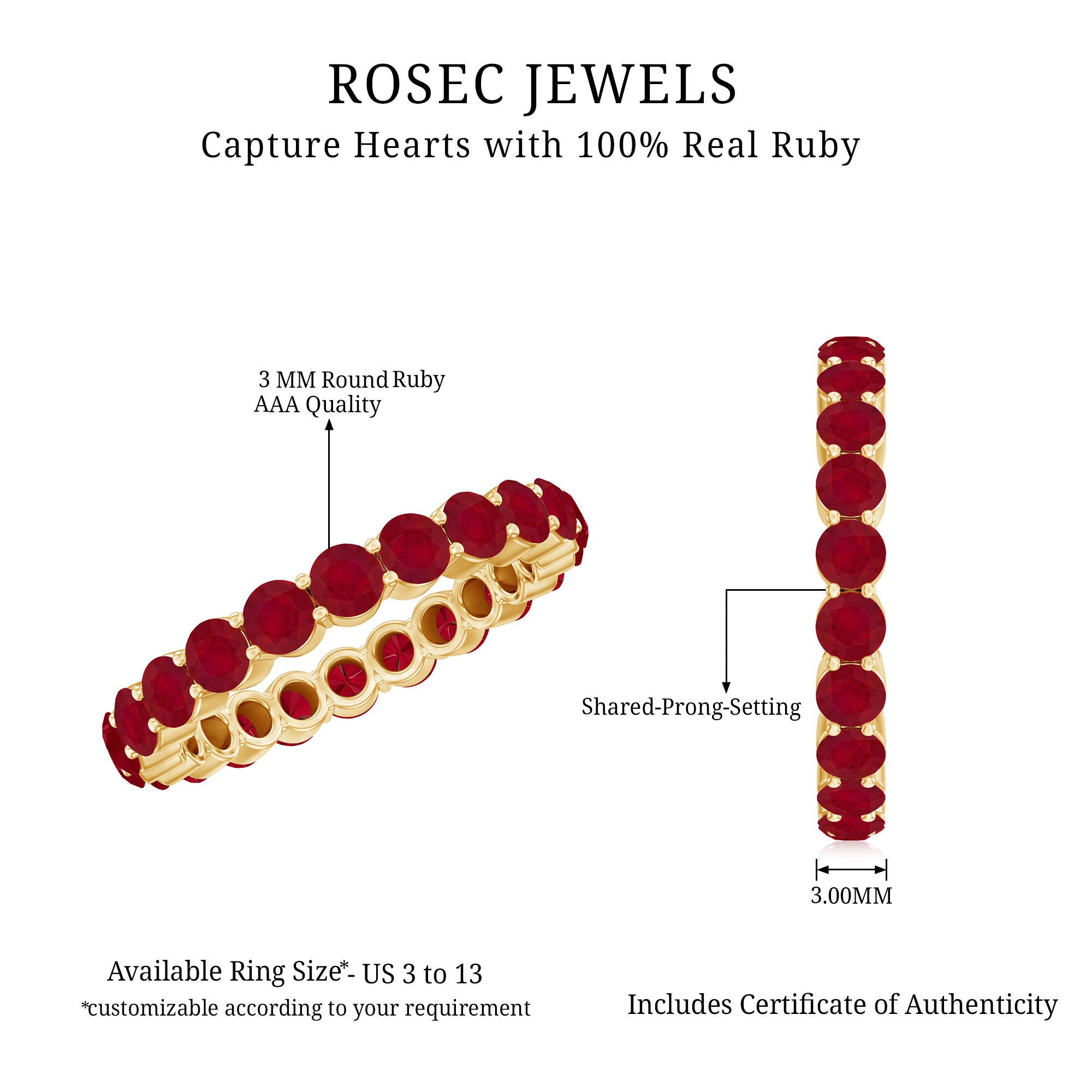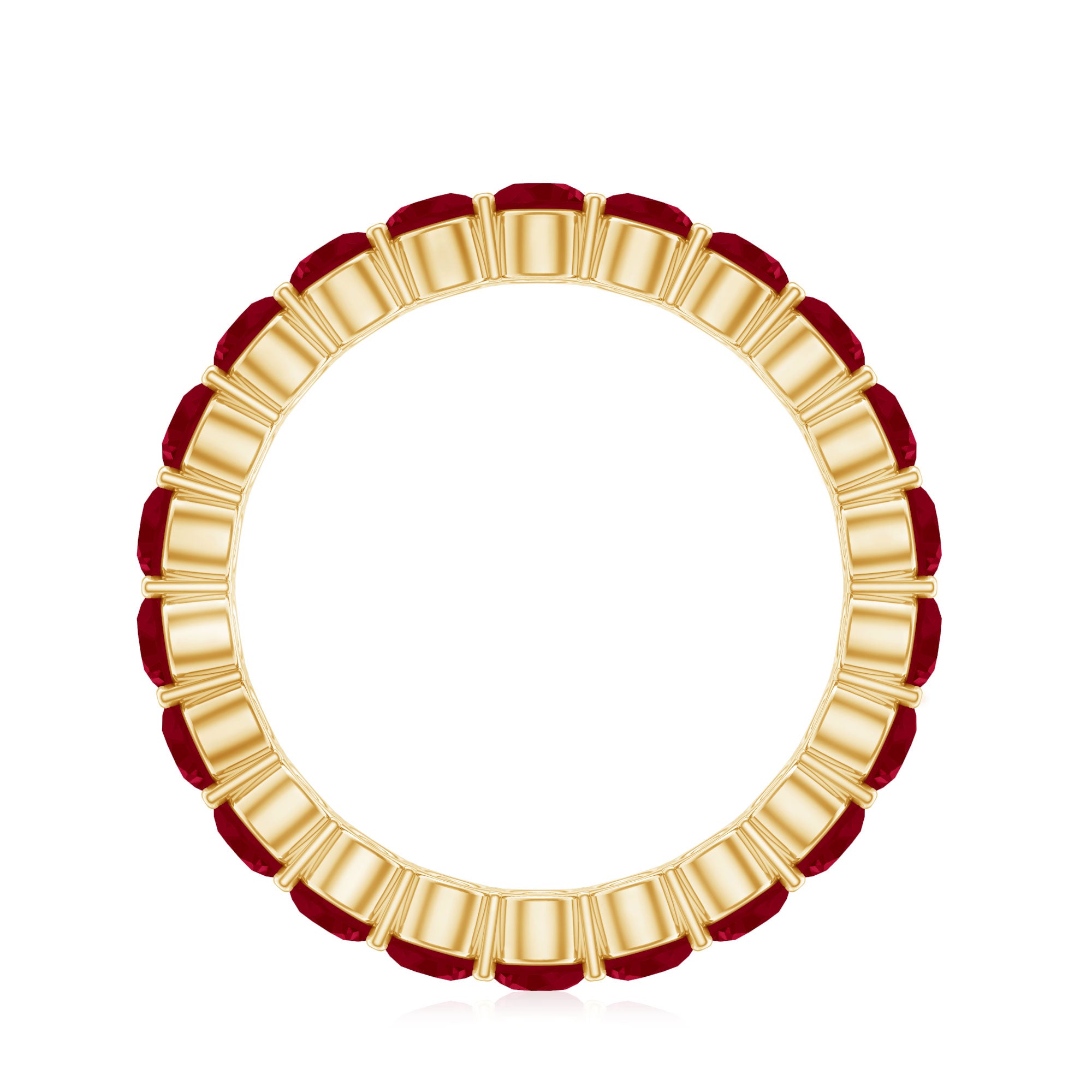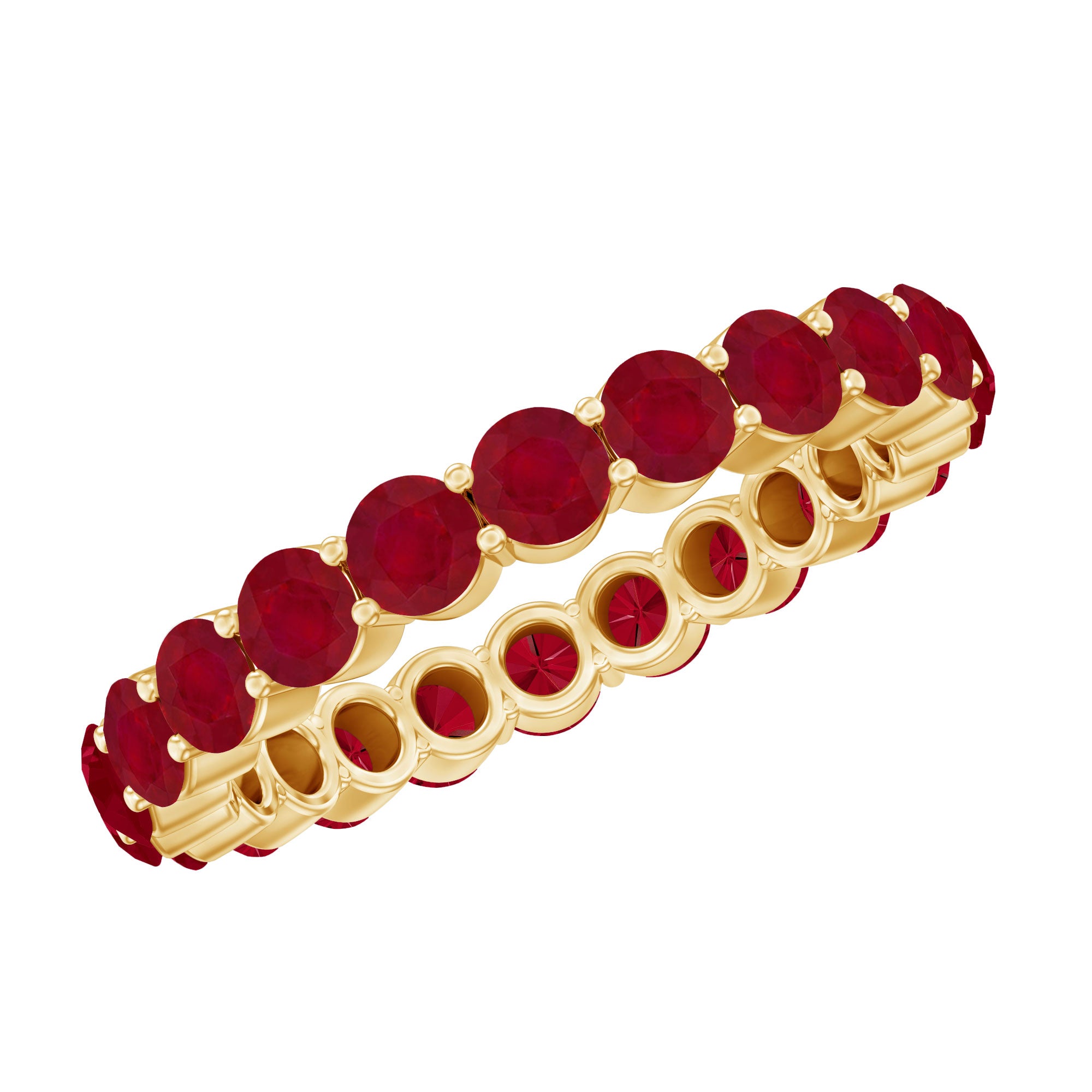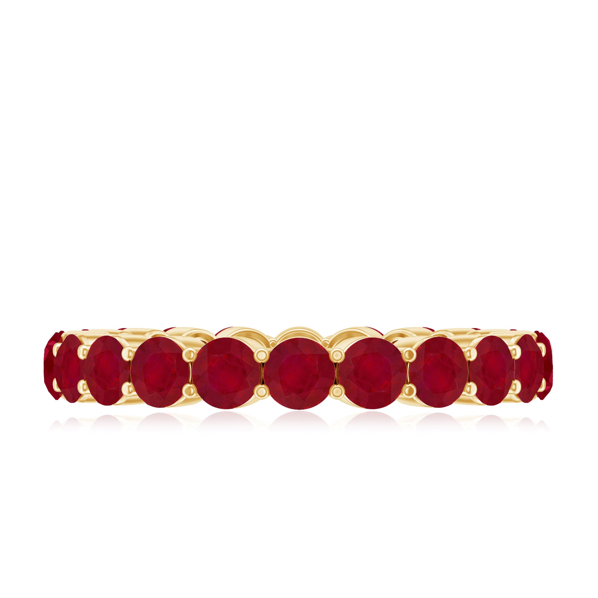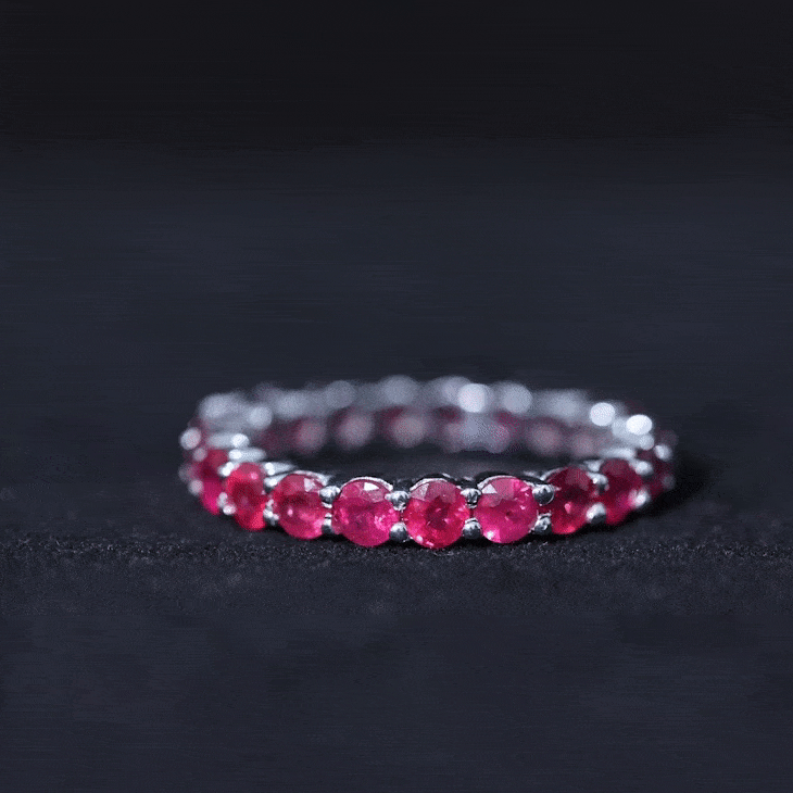 Express your emotion and surprise her with this exquisite Ruby Eternity Ring that will surely get more attention. This ring features 3 MM round Red Ruby encased in shared prong setting, making this piece more attractive and appealing to look at. If you want to make her surprised then this ring is just the perfect option for you. You can give this ring to your partner as it fits well on any occasion.