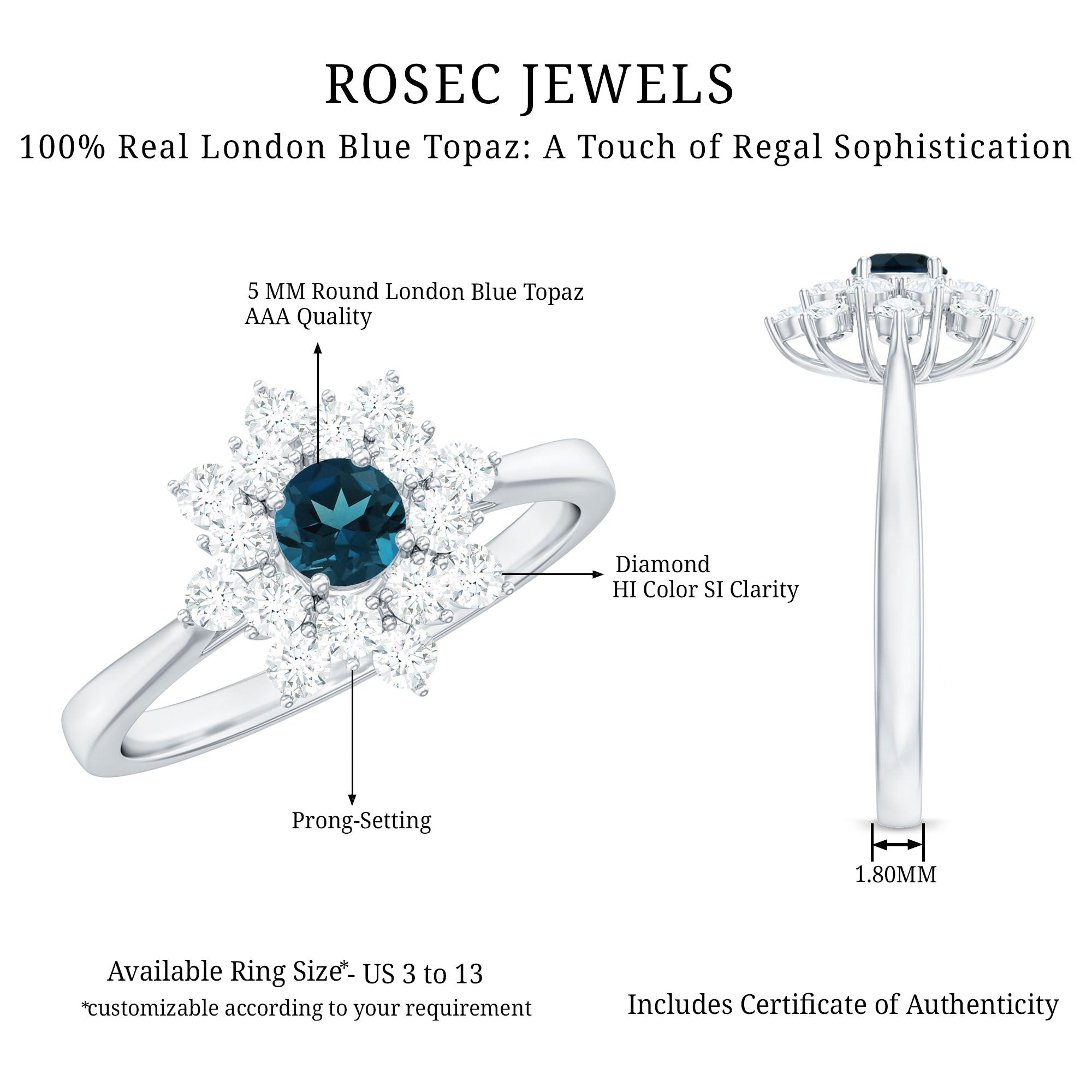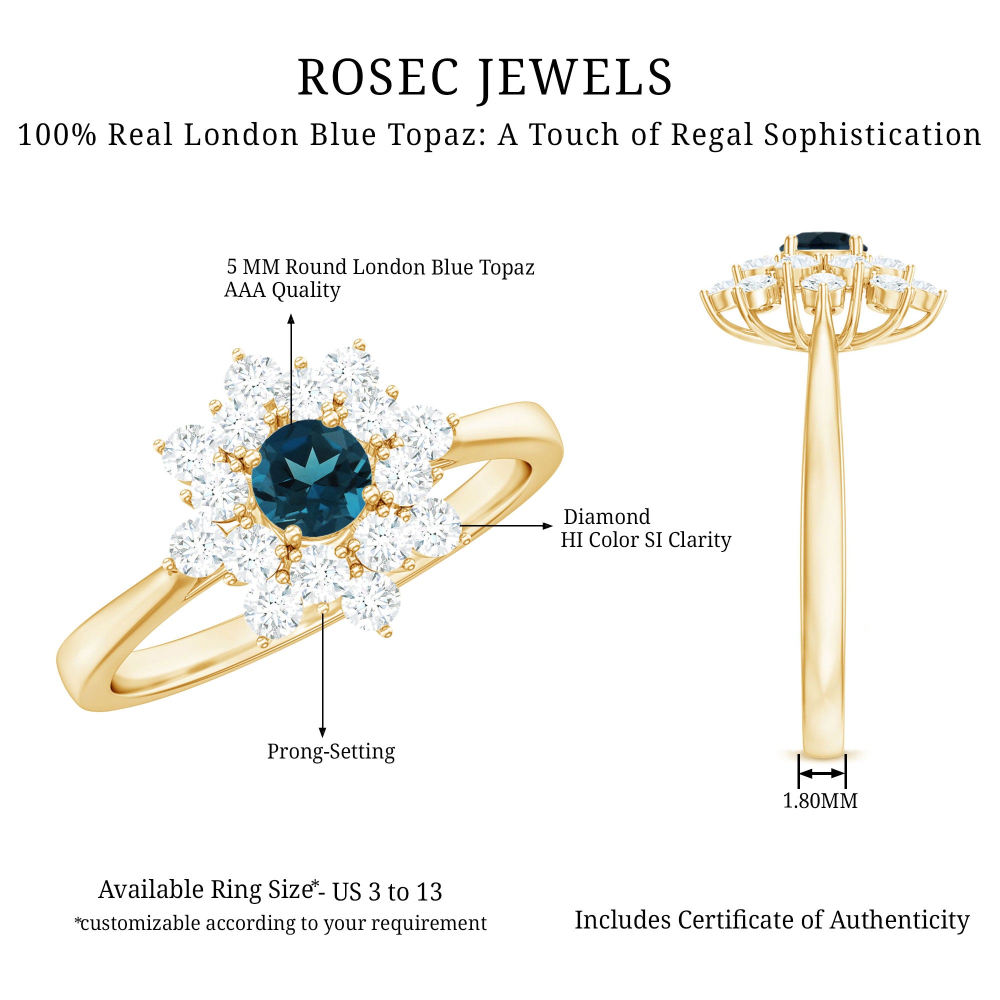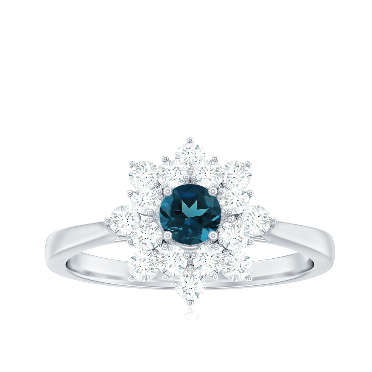 Genuine Round Cut London Blue Topaz Flower Engagement Ring with Diamonds