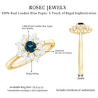 Inspired by the exquisite beauty of nature, this Blue Topaz Flower Ring adds a refreshing and elegant element to any jewelry collection. At the core of the design is an 5MM round cut london blue topaz, meticulously set in a secure prong setting. Its deep blue color provides a striking contrast to the brilliant sparkle of the surrounding diamonds, capturing attention and enhancing the overall aesthetic. Encircling the central stone is a floral halo composed of dazzling round diamonds. The London Blue Topaz Engagement Ring embodies the allure of a blossoming flower. Thoughtfully crafted for both comfort and visual appeal, it is a ring that is as delightful to wear as it is to behold. Whether commemorating a significant occasion or simply seeking a ring that embodies your personal style and narrative, this design presents a beautiful blend of traditional and contemporary elements. The fusion of AAA quality blue topaz and shimmering HI-SI quality diamonds imparts a bold yet gentle presence, ideal for everyday wear or special moments. Expertly constructed with high-quality materials and meticulous attention to detail, this Floral Engagement Ring symbolizes growth, love, and enduring charm, making it a cherished piece for years to come. This Natural Blue Topaz and Diamond Ring is presented in elegant packaging, ready for gifting.
