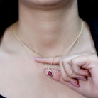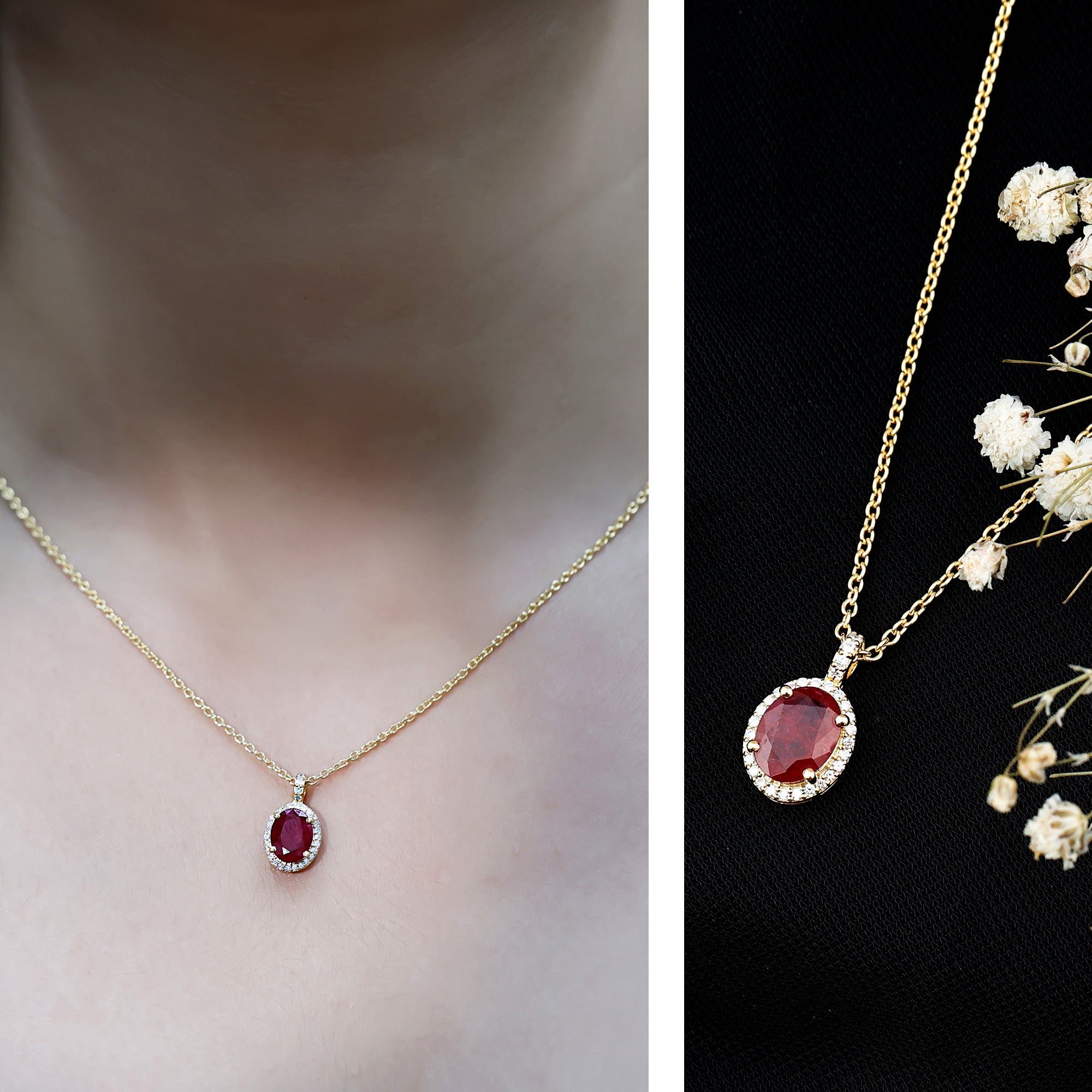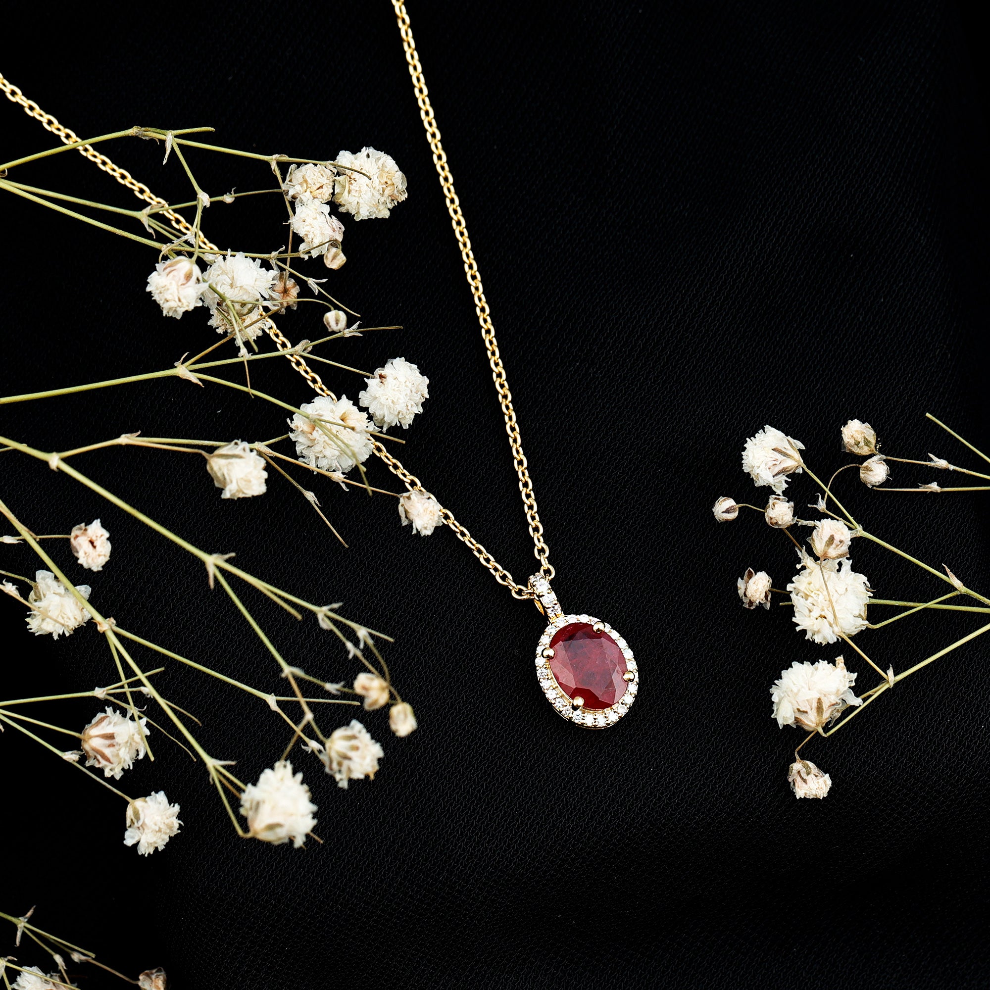Timeless and elegant, this Ruby Pendant Necklace is a beautiful balance of classic design and modern craftsmanship. Crafted in 14k yellow gold plated silver, this piece brings a sophisticated charm to your everyday style or special moments. At the heart of the pendant lies a 6X8 MM oval cut ruby, held securely in prong setting. Framing the center stone is a halo of round EF-VS quality lab grown diamonds, adding a touch of brilliance without overpowering the design. The diamonds continue onto the bail, offering a seamless sparkle from top to bottom and giving the Oval Pendant a refined, finished look. The Ruby Halo Necklace is suspended from a sleek and durable chain that drapes comfortably across the neckline. Whether layered with other pieces or worn solo, it brings a graceful pop of charm to any outfit. The AAA quality ruby adds a touch of richness to the look, while the gold tone brings warmth and depth. Ideal for gifting or treating yourself, this Ruby and Diamond Necklace is a perfect pick for birthdays, anniversaries, or milestones worth remembering. It is a piece that feels both personal and timeless, easy to wear, hard to forget.