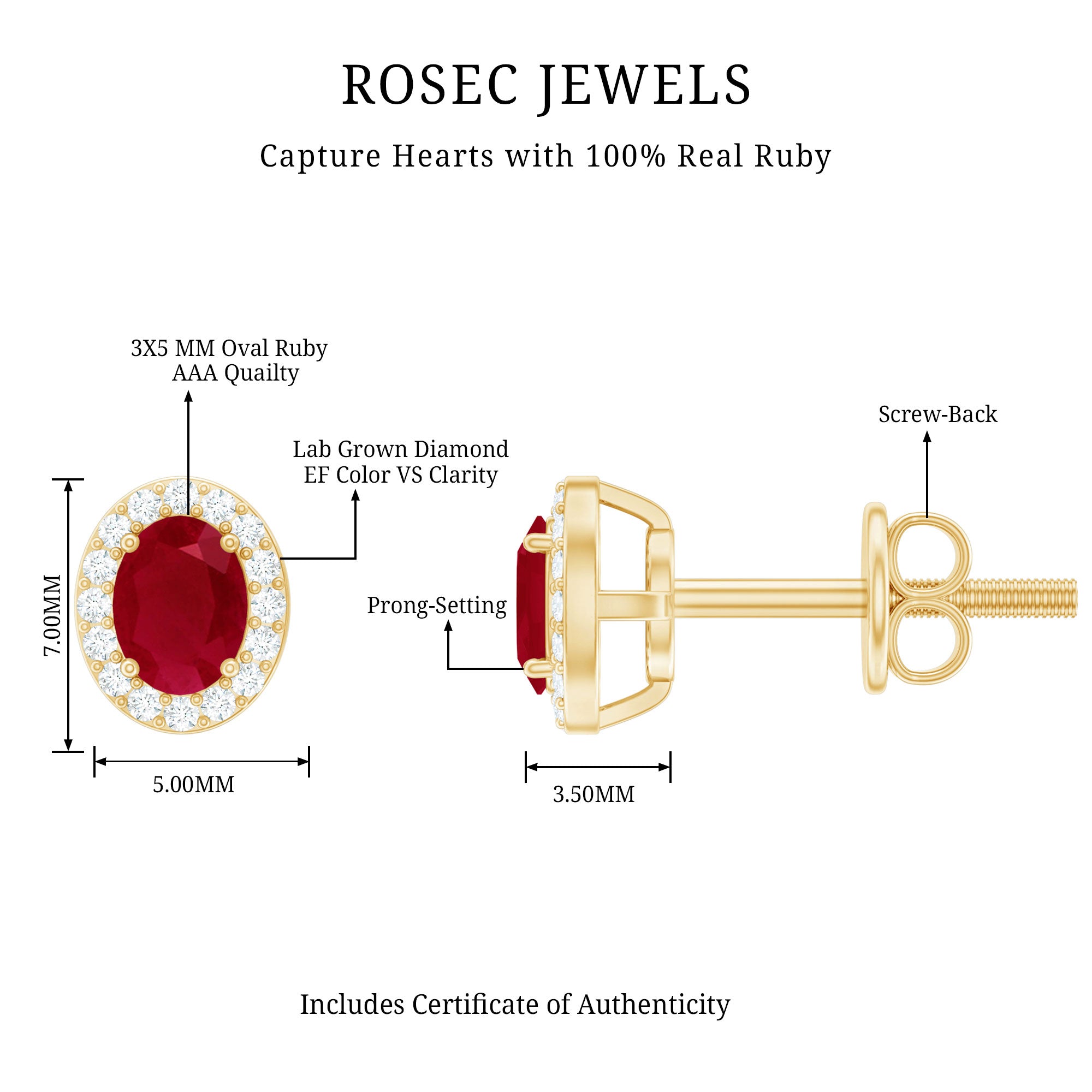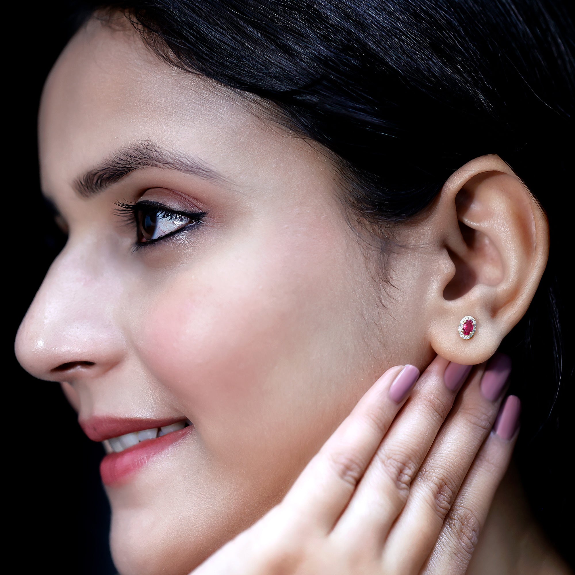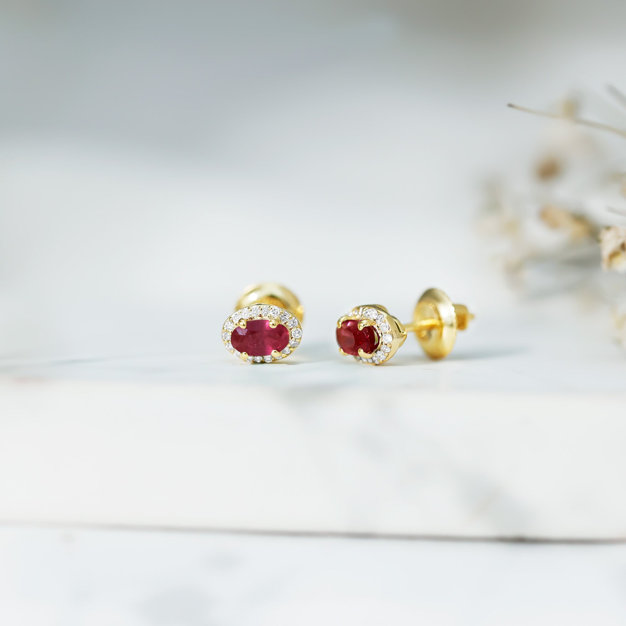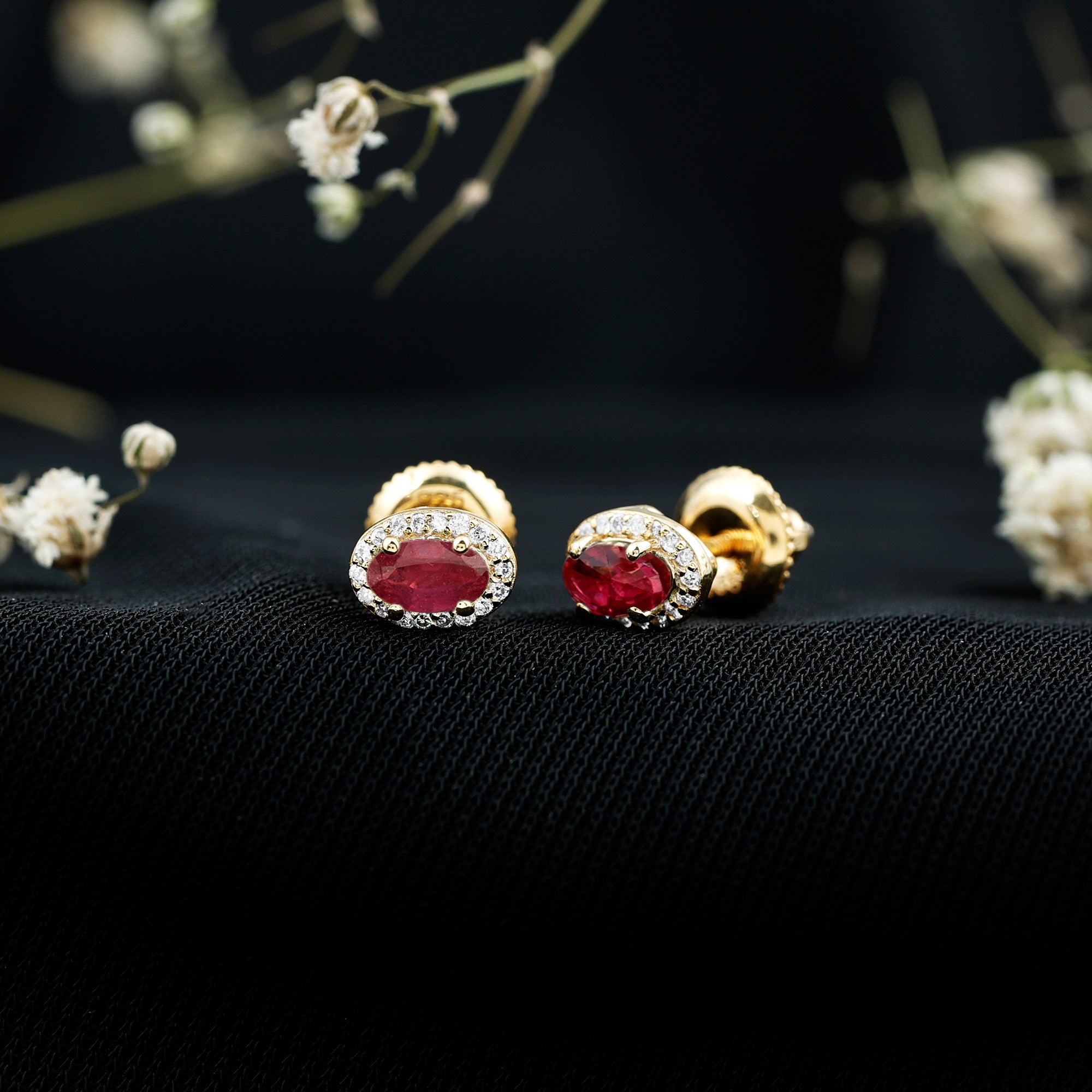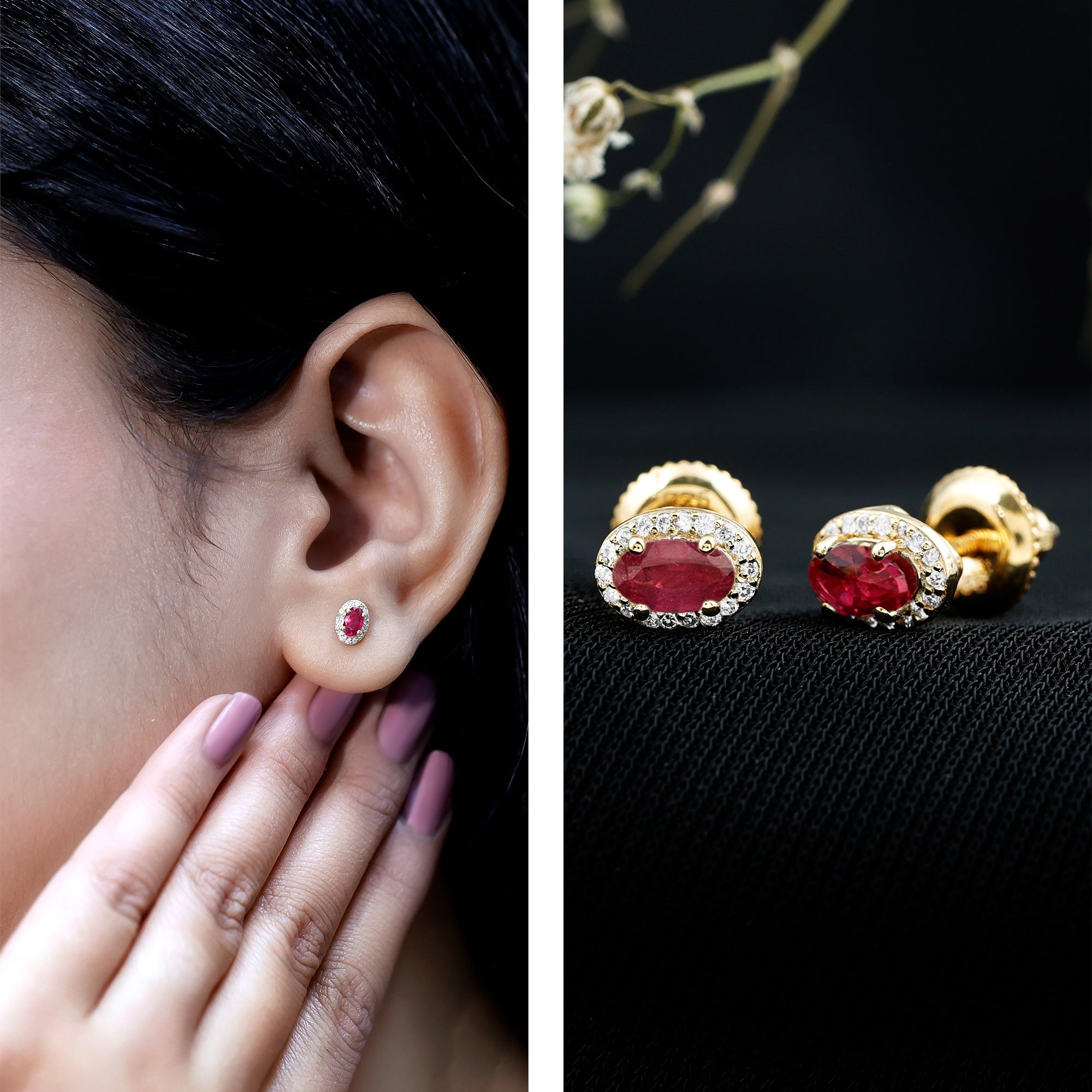 Celebrate love, passion, and timeless beauty with these stunning Ruby Stud Earrings, crafted in yellow gold plated sterling silver. These elegant Halo Stud Earrings feature a 3X5 MM oval shaped real Ruby known as the birthstone of July and a symbol of love and romance, making them a perfect choice for Valentine’s Day or any special moment. Each ruby is carefully set in secure prong setting and surrounded by a sparkling halo of lab grown diamonds. These EF-VS quality diamonds add a gentle shine that beautifully enhances the ruby’s bold color. The combination of vibrant red and sparkling white gives these Oval Shaped Earrings a classic and graceful look that suits any outfit. Made with AAA quality rubies and sustainably created diamonds, these Red Stone Earrings reflect thoughtful craftsmanship and modern values. The screw back closure ensures they stay securely in place, offering both comfort and peace of mind for daily wear or special occasions. Whether you are treating yourself, celebrating a July birthday, or gifting a loved one on Valentine’s Day, these Ruby and Diamond Earrings are a meaningful and stylish choice. Their timeless beauty, paired with a touch of modern sparkle, makes them a piece to treasure forever. This pair comes in a beautiful signature jewelry box, ready to gift and ready to shine.