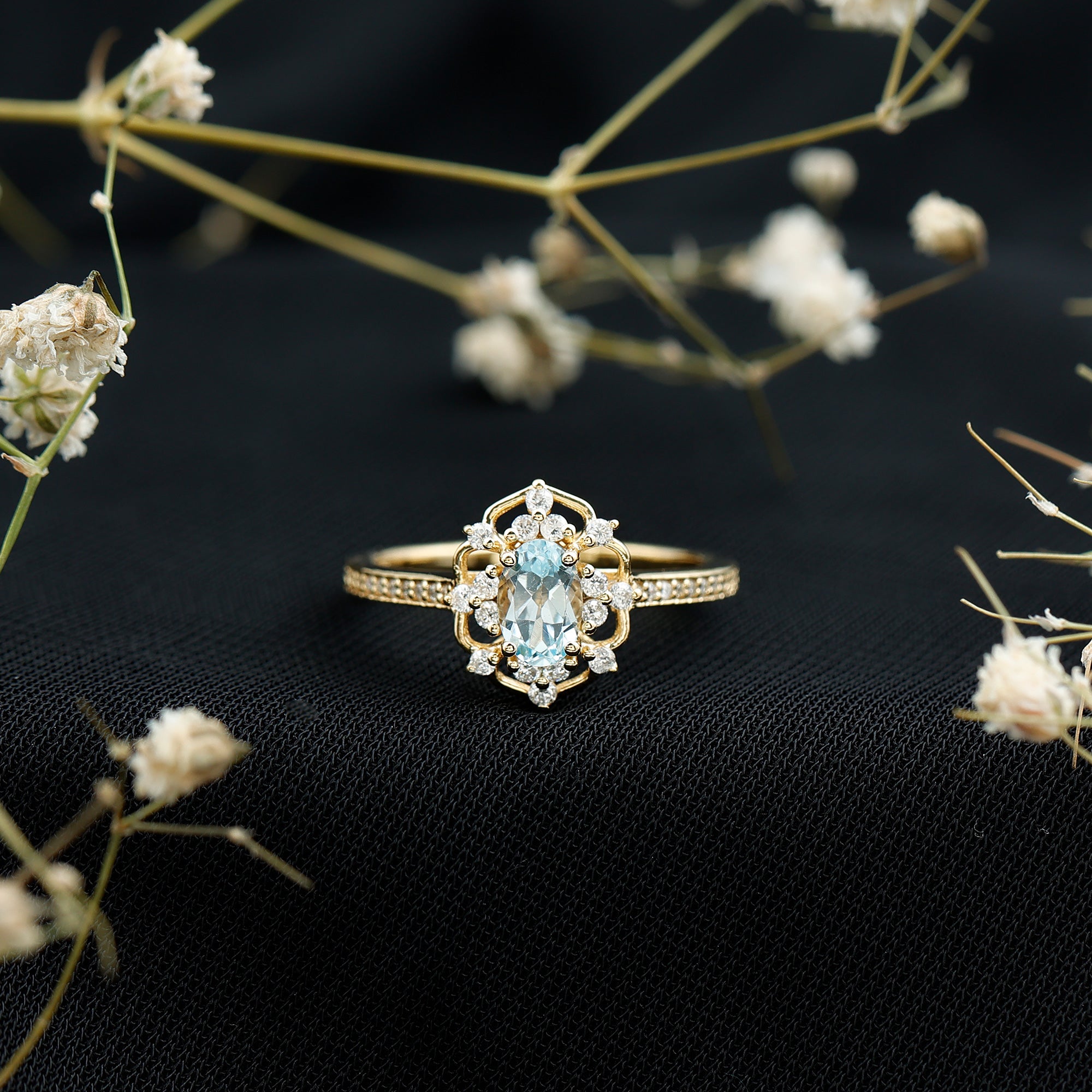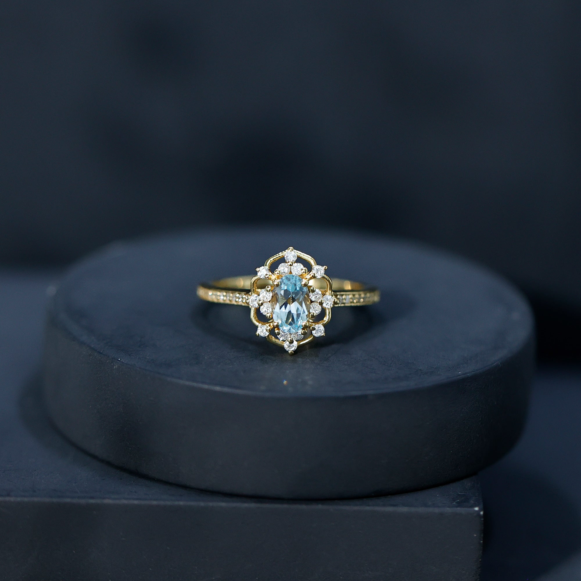 Bring back the elegance of the past with this Vintage Blue Topaz Ring that looks like it was made for a fairytale. Crafted in 14k yellow gold plated sterling silver, the design is inspired by vintage style, with delicate details that give it a classic and elegant look. At the center of the ring is a 4X6 MM oval shaped Sky Blue Topaz, securely set in prongs to let its hue shine from every angle. Beautifying the center stone and adorning the shank are brilliant round lab grown diamonds, adding a subtle sparkle that enhances the topaz without overwhelming it. This Vintage Style Engagement Ring has a graceful, old-world charm that makes it stand out, perfect for someone who loves jewelry with meaning and a touch of history. The fine detailing and thoughtful craftsmanship make it feel truly special, while the soft blue hue brings a sense of calm and harmony. The AAA quality Sky Blue Topaz and EF-VS quality lab grown diamonds ensure lasting brilliance and beauty. Beautifully packaged in a signature jewelry box, this Blue Topaz and Diamond Ring is ready to make memories.