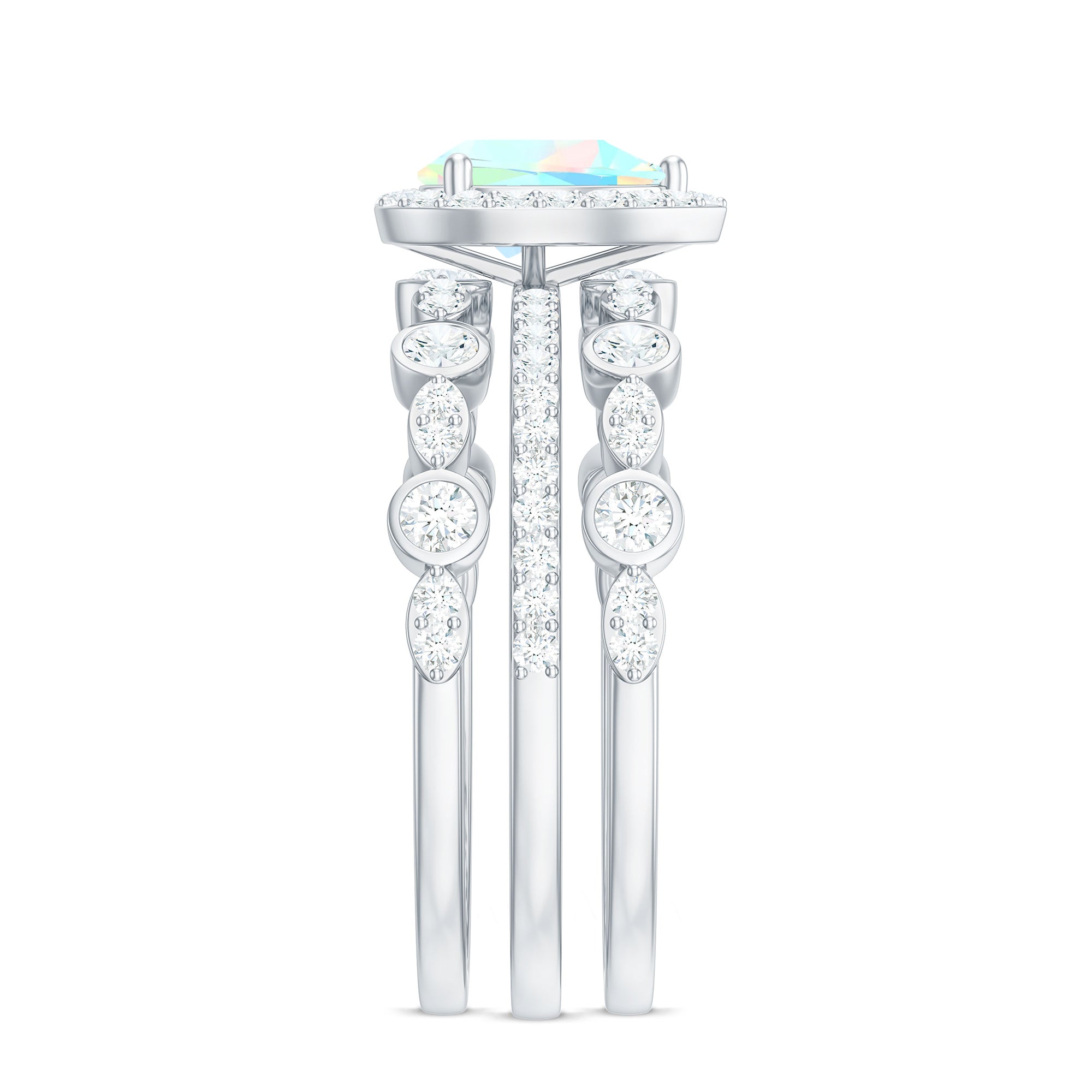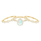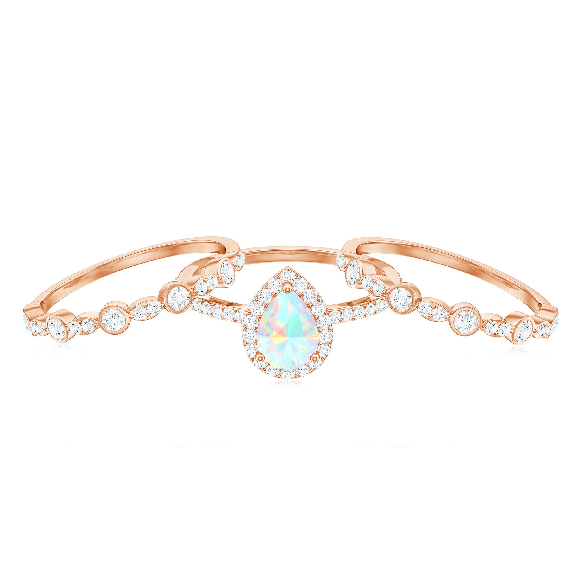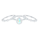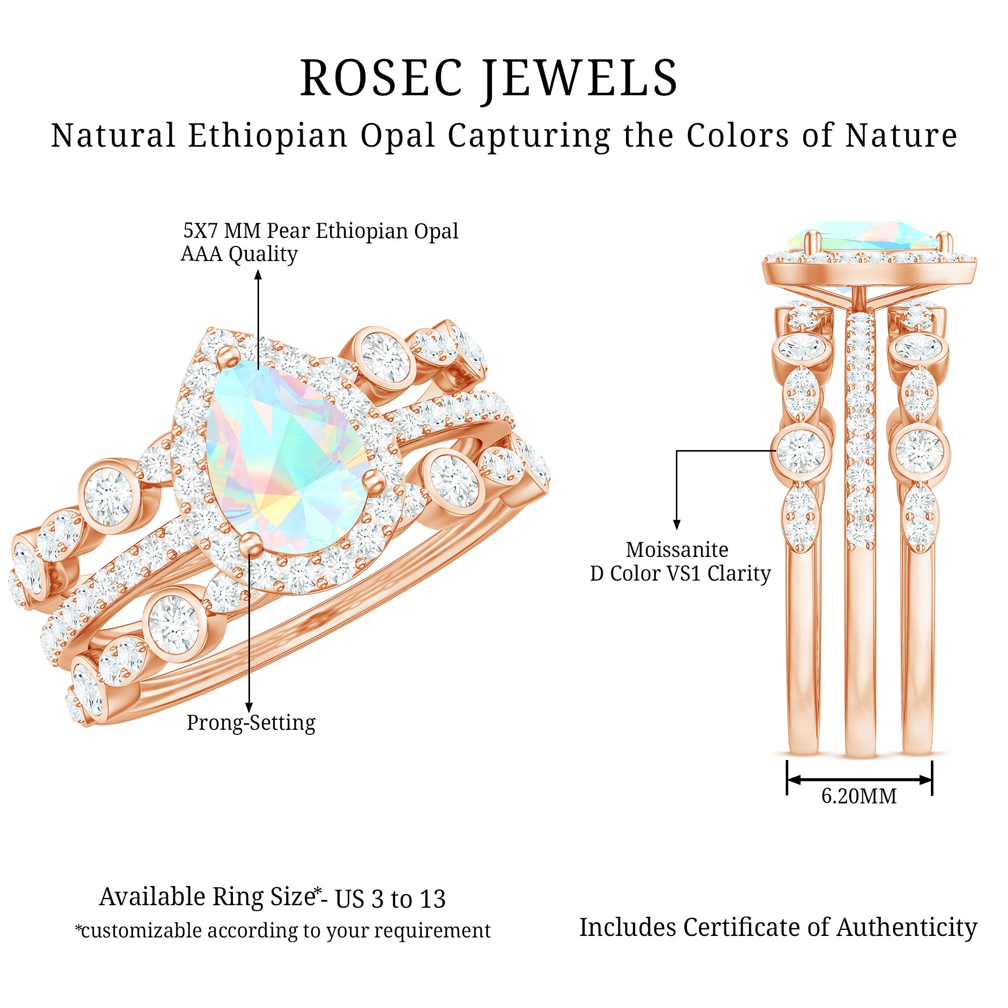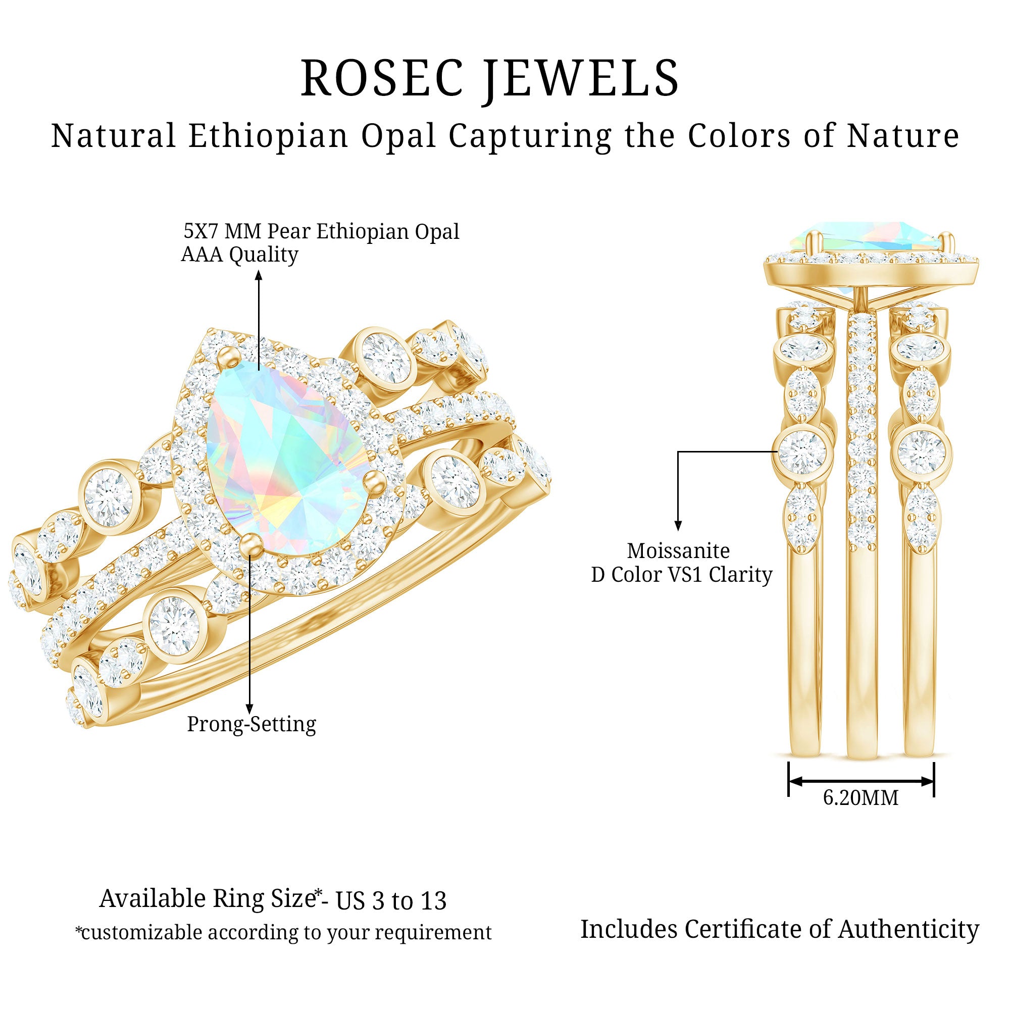 Step into a world of timeless romance with this 3 Piece Bridal Ring Set, a stunning trio crafted for the bride who dreams in color and detail. At the center of the set is a Teardrop Engagement Ring adorned with a 5X7 mm Pear Shape Ethiopian Opal set in Prong Setting, glowing with rainbow hues and set within a sparkling Halo of Moissanite stones that shimmer with every movement. Moissanite Side Stones trail down the band, adding layers of sparkle and elegance. Framing this statement piece are two matching Enhancer Rings, each adorned with Round Shape Moissanite stones that give the set a regal, heirloom feel. Together, this Wedding Bridal Ring Set creates a perfectly stacked look. Whether worn as a full set or styled individually, this Opal Wedding Ring Set is designed to celebrate love in its most luminous form. Available in multiple sizes and delivered in a beautiful jewelry box, this Opal Engagement Ring with Enhancer is ready to mark your forever moment with unforgettable sparkle. This Engagement and Wedding Ring Set is for the bride who craves a blend of antique charm and modern brilliance.
