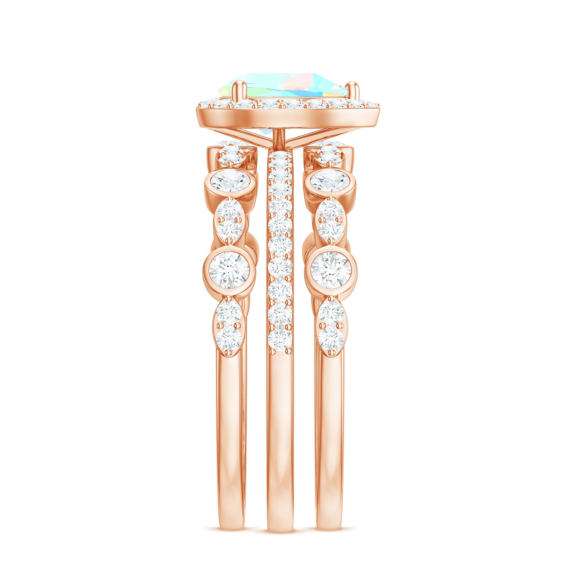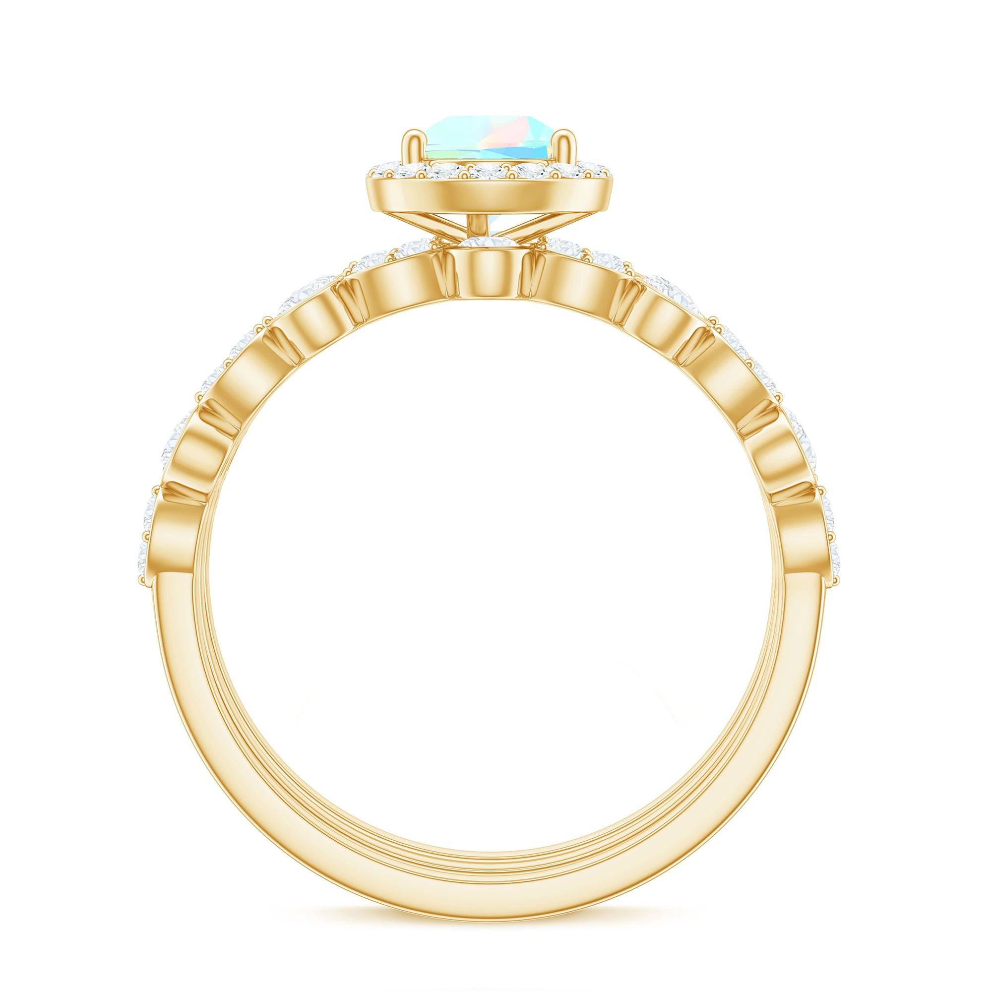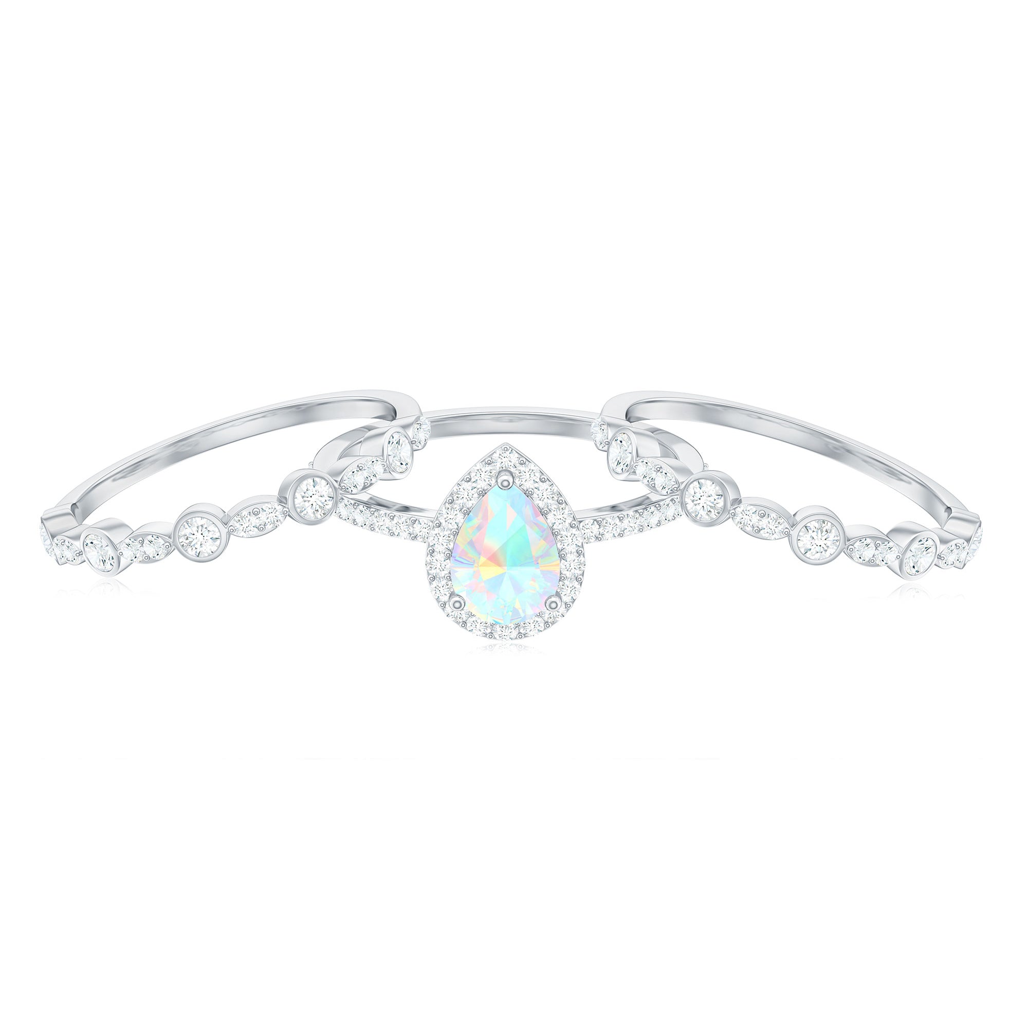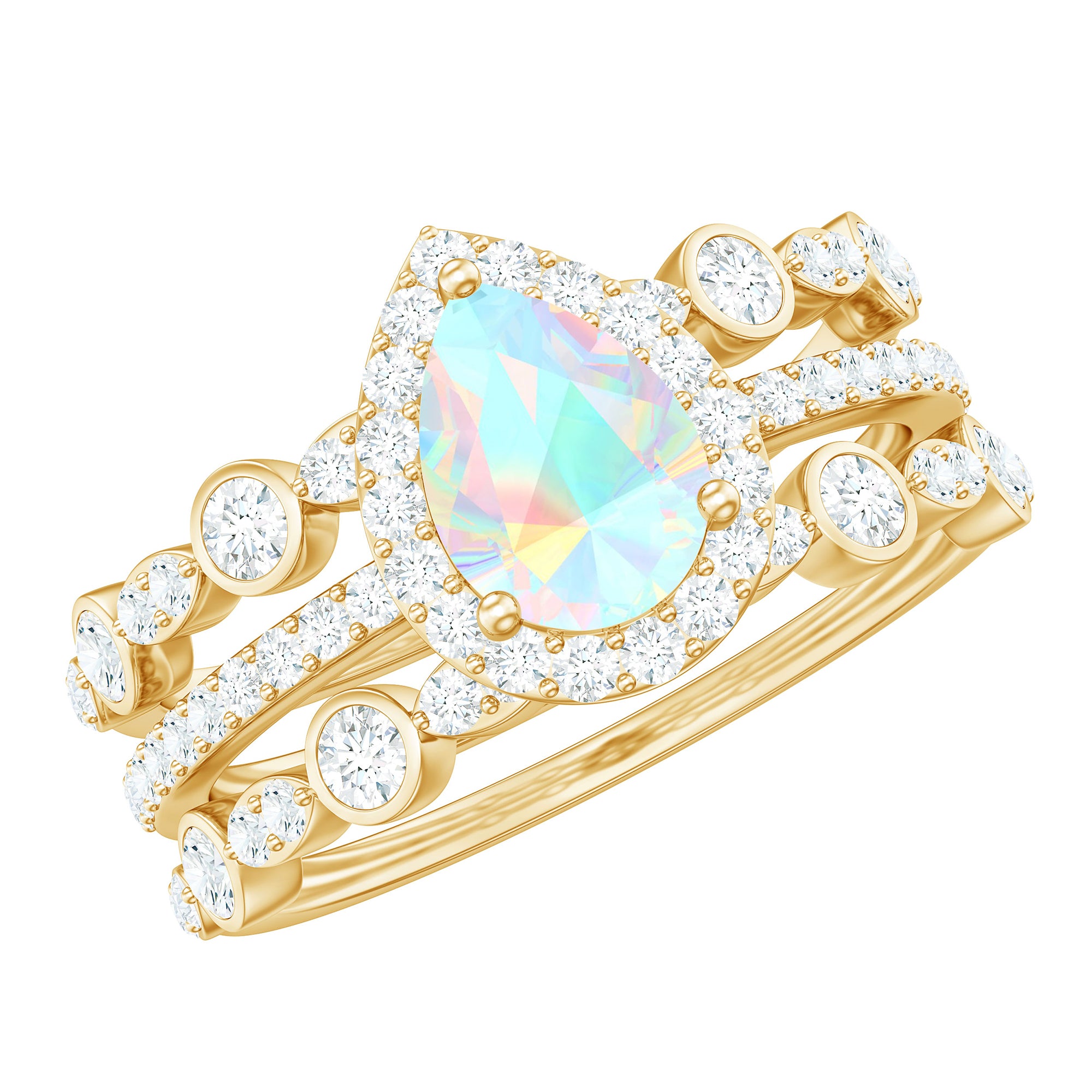 Step into a world of timeless romance with this 3 Piece Bridal Ring Set, a stunning trio crafted for the bride who dreams in color and detail. At the center of the set is a Teardrop Engagement Ring adorned with a 5X7 mm Pear Shape Ethiopian Opal set in Prong Setting, glowing with rainbow hues and set within a sparkling Halo of Moissanite stones that shimmer with every movement. Moissanite Side Stones trail down the band, adding layers of sparkle and elegance. Framing this statement piece are two matching Enhancer Rings, each adorned with Round Shape Moissanite stones that give the set a regal, heirloom feel. Together, this Wedding Bridal Ring Set creates a perfectly stacked look. Whether worn as a full set or styled individually, this Opal Wedding Ring Set is designed to celebrate love in its most luminous form. Available in multiple sizes and delivered in a beautiful jewelry box, this Opal Engagement Ring with Enhancer is ready to mark your forever moment with unforgettable sparkle. This Engagement and Wedding Ring Set is for the bride who craves a blend of antique charm and modern brilliance.