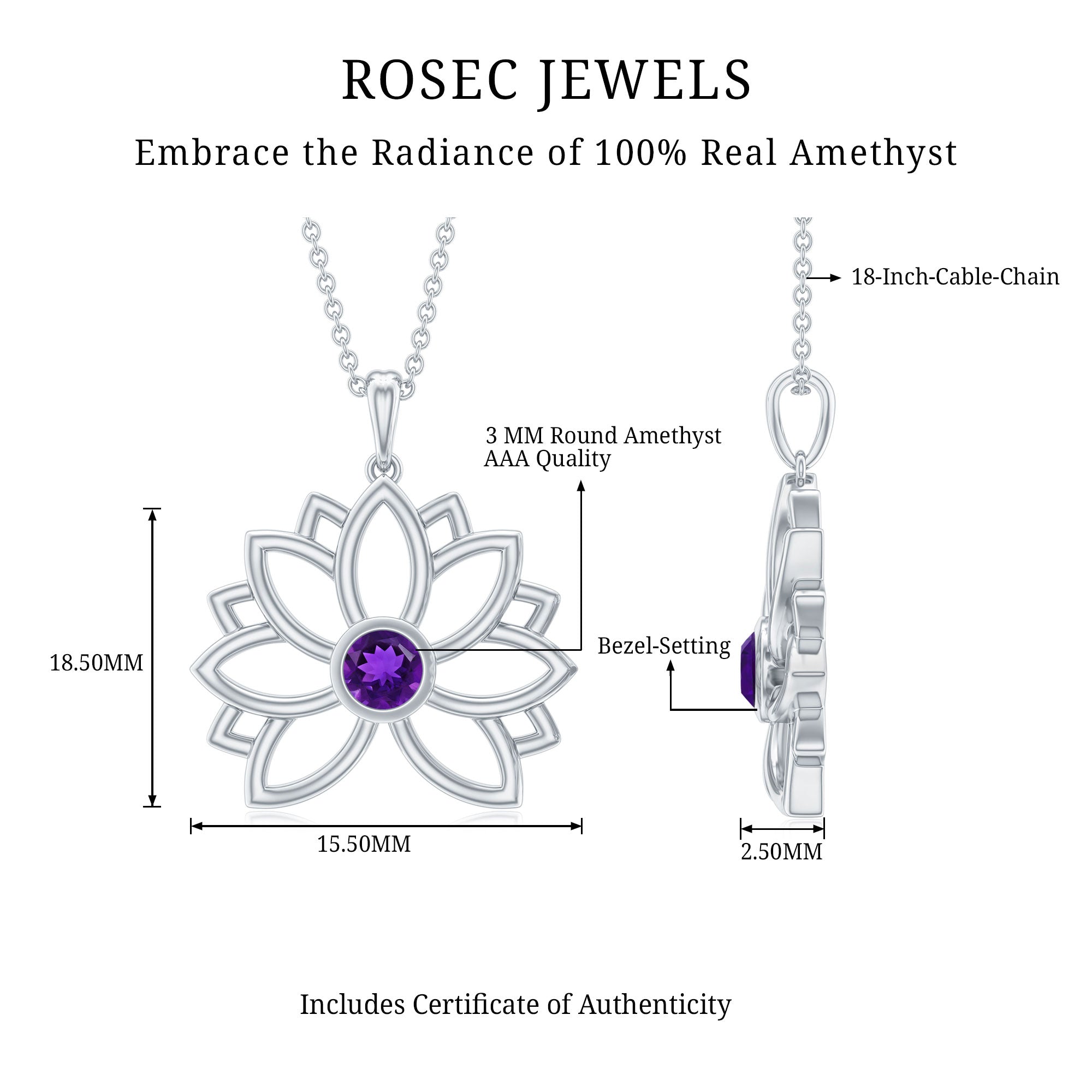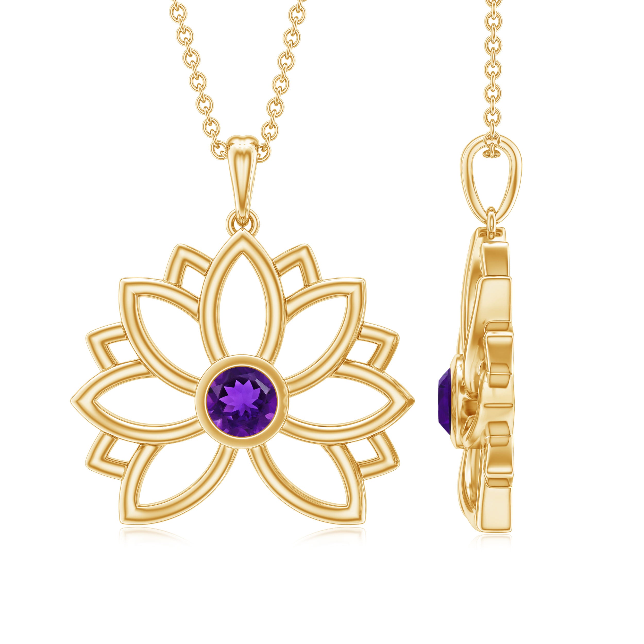 It is a Gold Lotus Pendant consisting of a Round Cut Amethyst embellished in Bezel Setting. It is also known as a Floral Necklace.