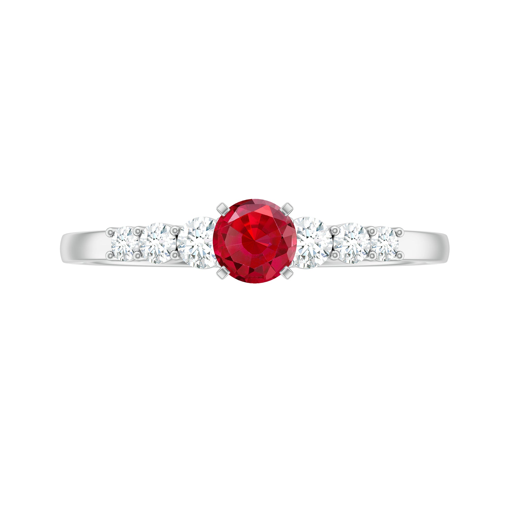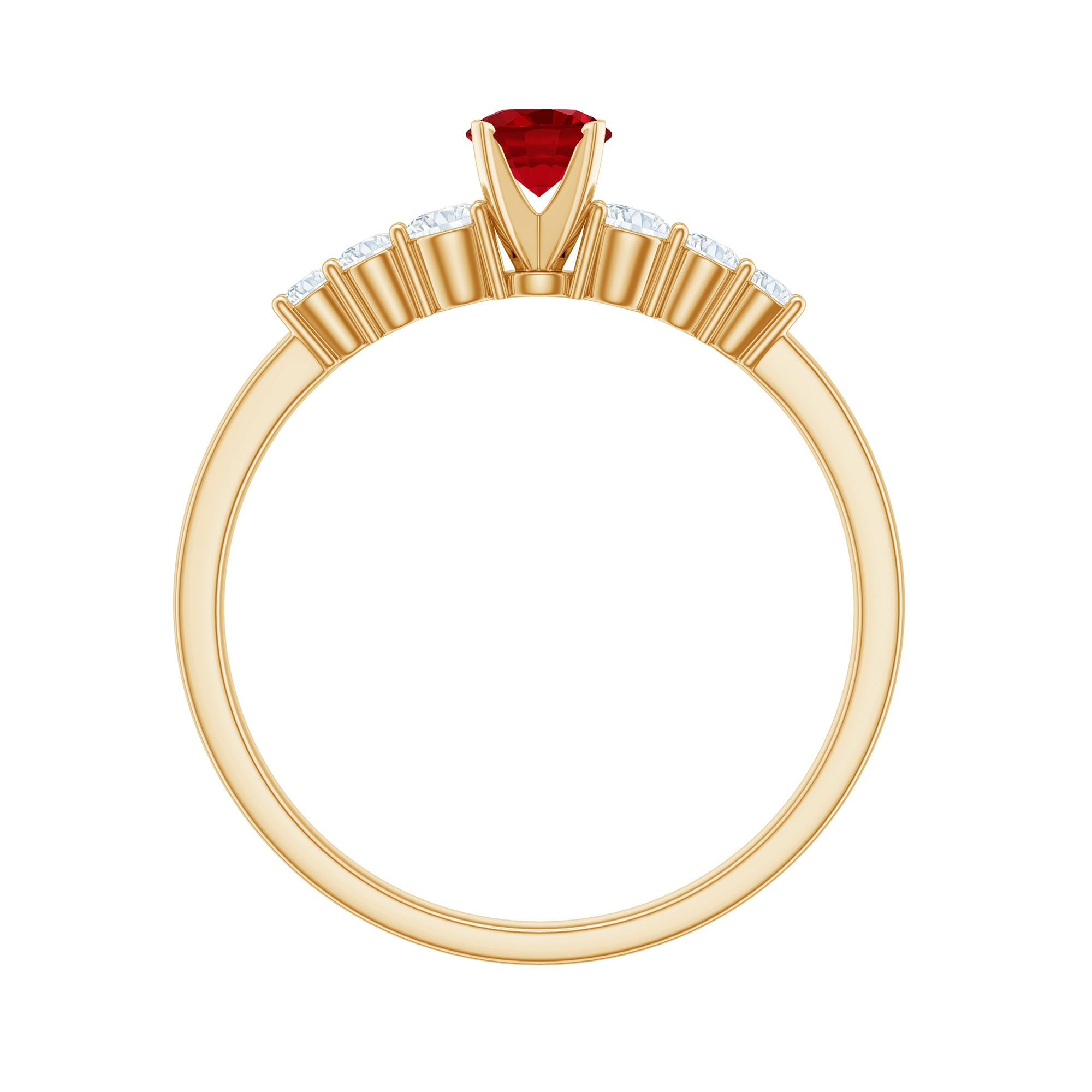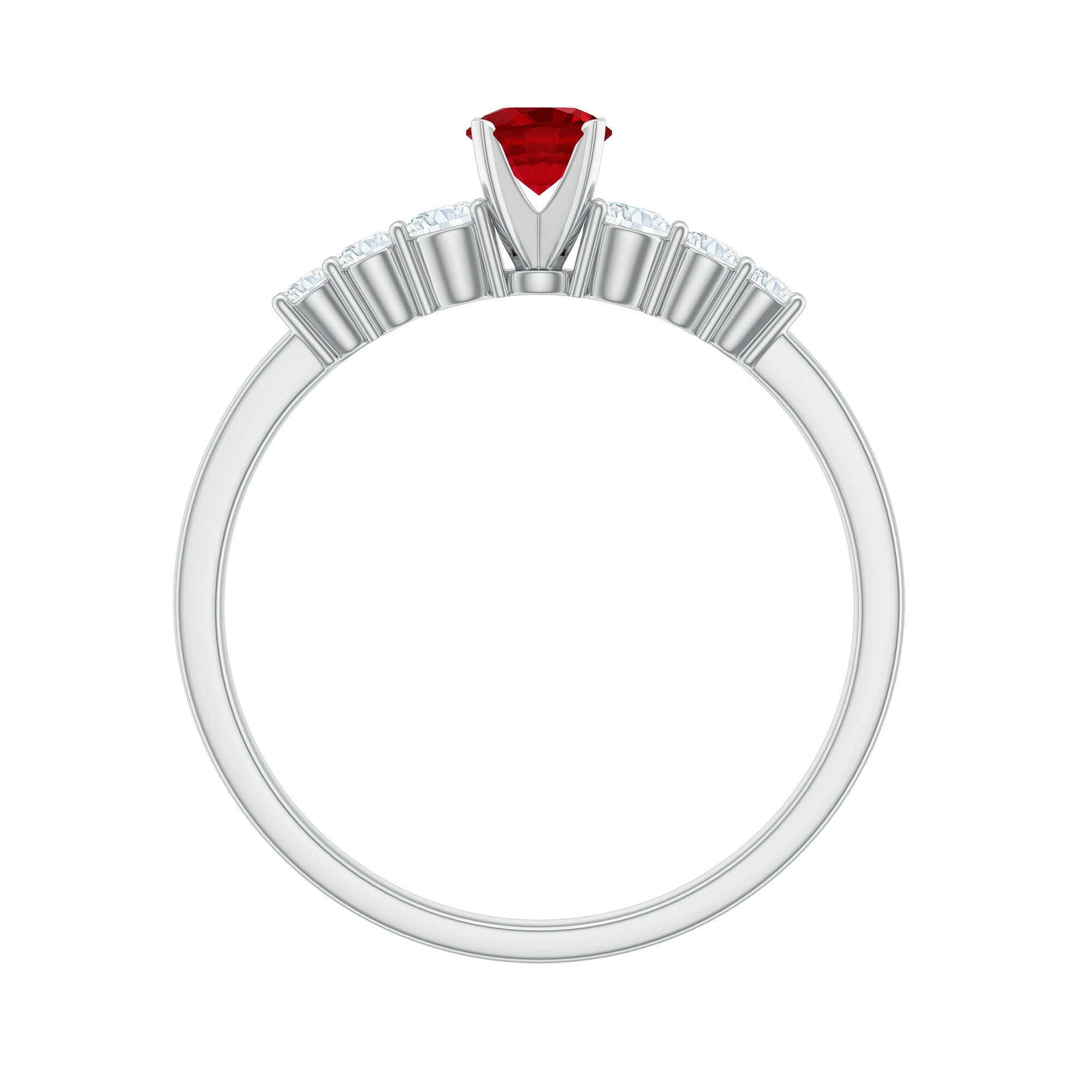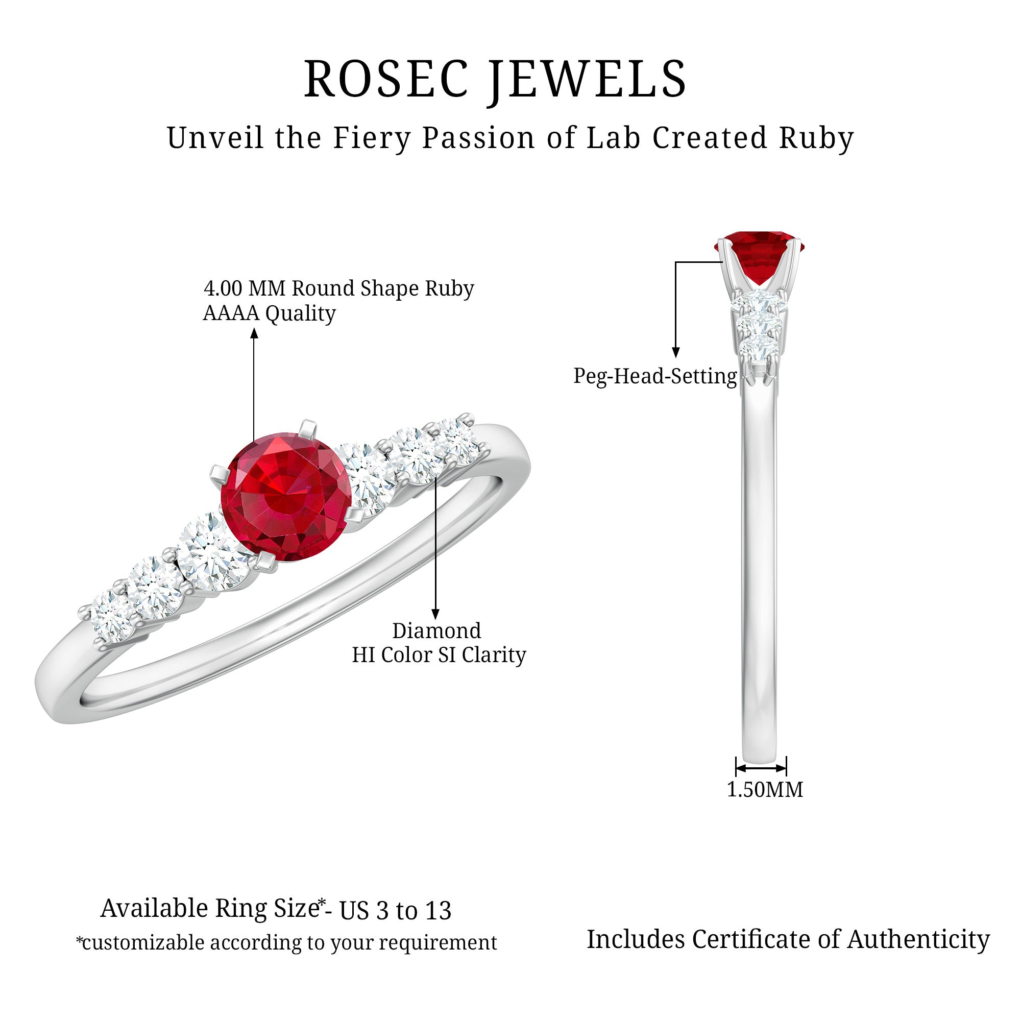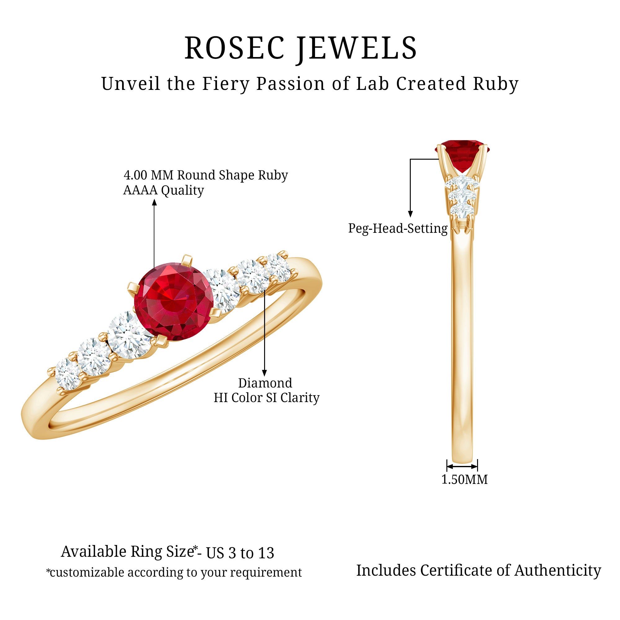 Say what words can not with a ring that speaks from the heart. This beautiful Lab Grown Ruby and Diamond Ring is all about love, loyalty, and the bond you share with someone special. At the center sits a 4 MM round lab created ruby, held in strong peg head setting, designed to let the stone shine from every angle. Lining the band are round diamonds, placed in a lovely graduated style that adds soft sparkle and elegance. Each diamond gets slightly smaller as it moves away from the center, creating a gentle flow that feels both modern and timeless. The diamonds are set securely in prong setting, adding shine to the ruby’s natural beauty. What makes this Ruby Promise Ring for Her special is what it stands for. It is a promise, a reminder, a symbol of always being there, through everything. Whether you are marking a special milestone, a first step in your journey, or just want her to know how much she means to you, this Minimalist Lab Created Ruby Ring is a thoughtful way to show it. Comfortable to wear every day and crafted with care, it is a piece she will treasure for years. Packaged in a lovely box, this Pre Engagement Ring is ready for that moment that matters most.