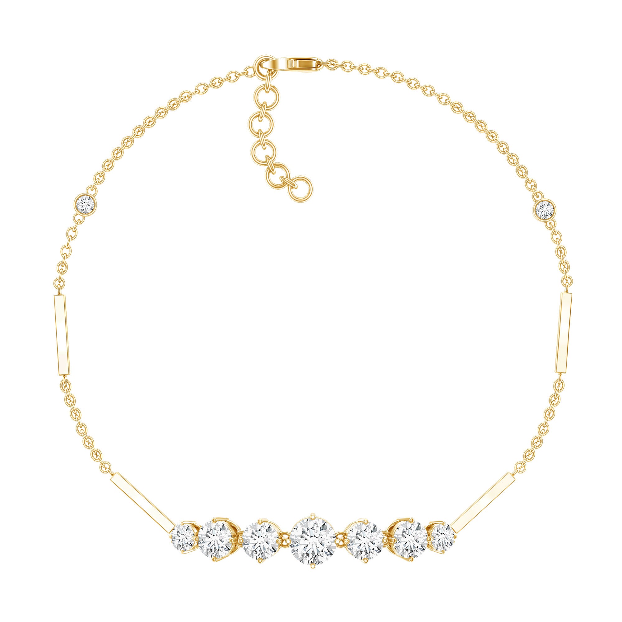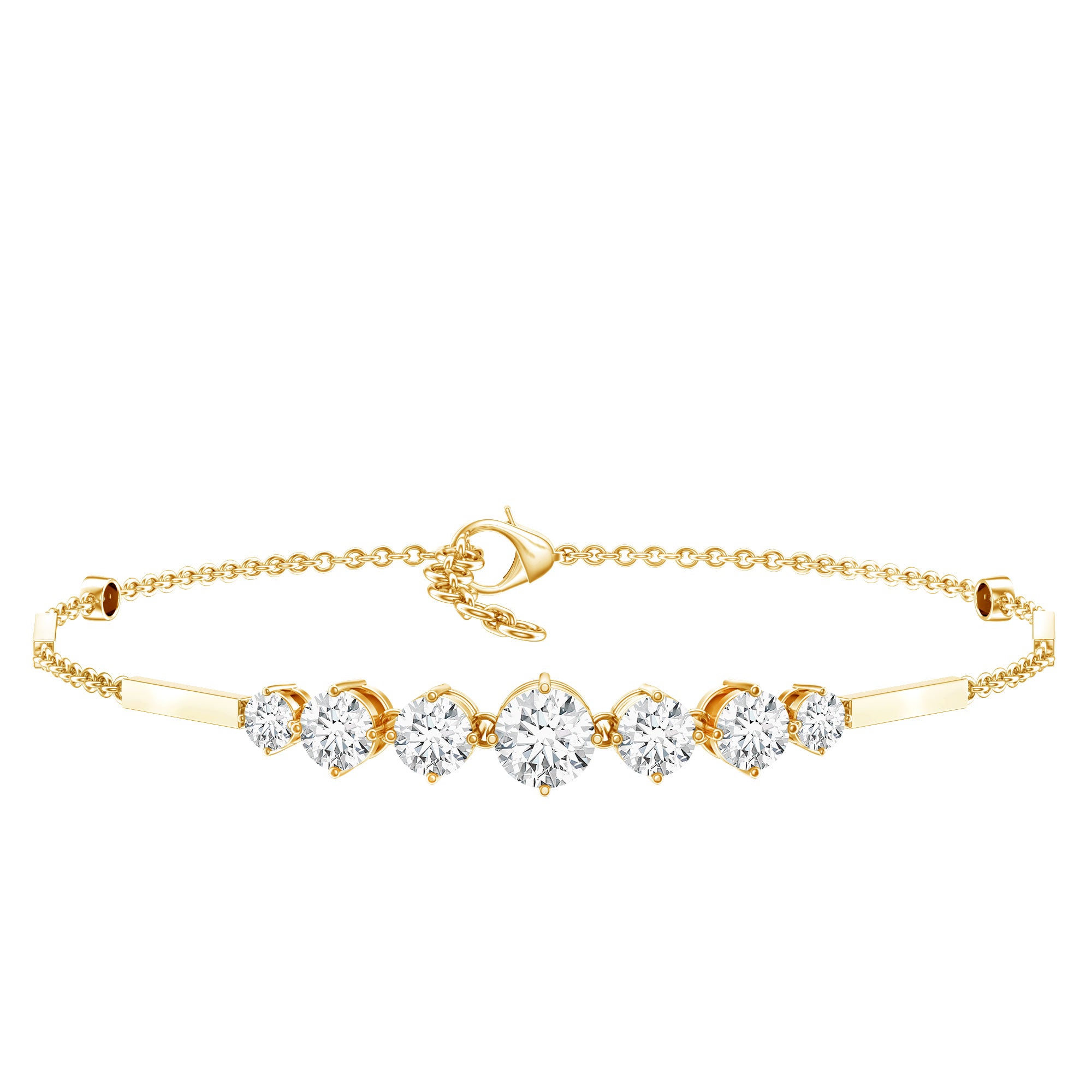 Sparkling with understated elegance, this Moissanite Chain Bracelet is a perfect harmony of sophistication and contemporary design. Features a series of round cut moissanite stones set in a graduated style. The stones are secured in strong prong setting, allowing maximum light to pass through and amplify their radiant brilliance. Delicate metal bars connect to a sleek cable chain, adding structure and a modern twist to this timeless design. The Moissanite Bracelet features an adjustable lobster clasp, ensuring a comfortable and secure fit for any wrist size. Its versatile style allows it to be worn solo for a minimalist look or stacked with another bracelet for a layered effect. Crafted with attention to detail, this Link Chain Bracelet is available in a variety of metal options, allowing you to match your personal style. Ideal for gifting or elevating your own jewelry collection, this piece combines sparkle, elegance, and wearability in a single striking accessory.