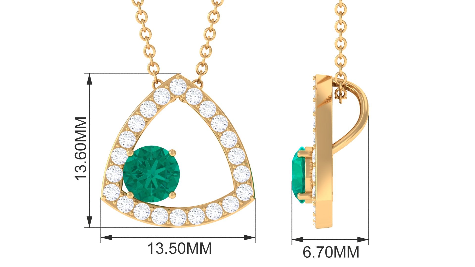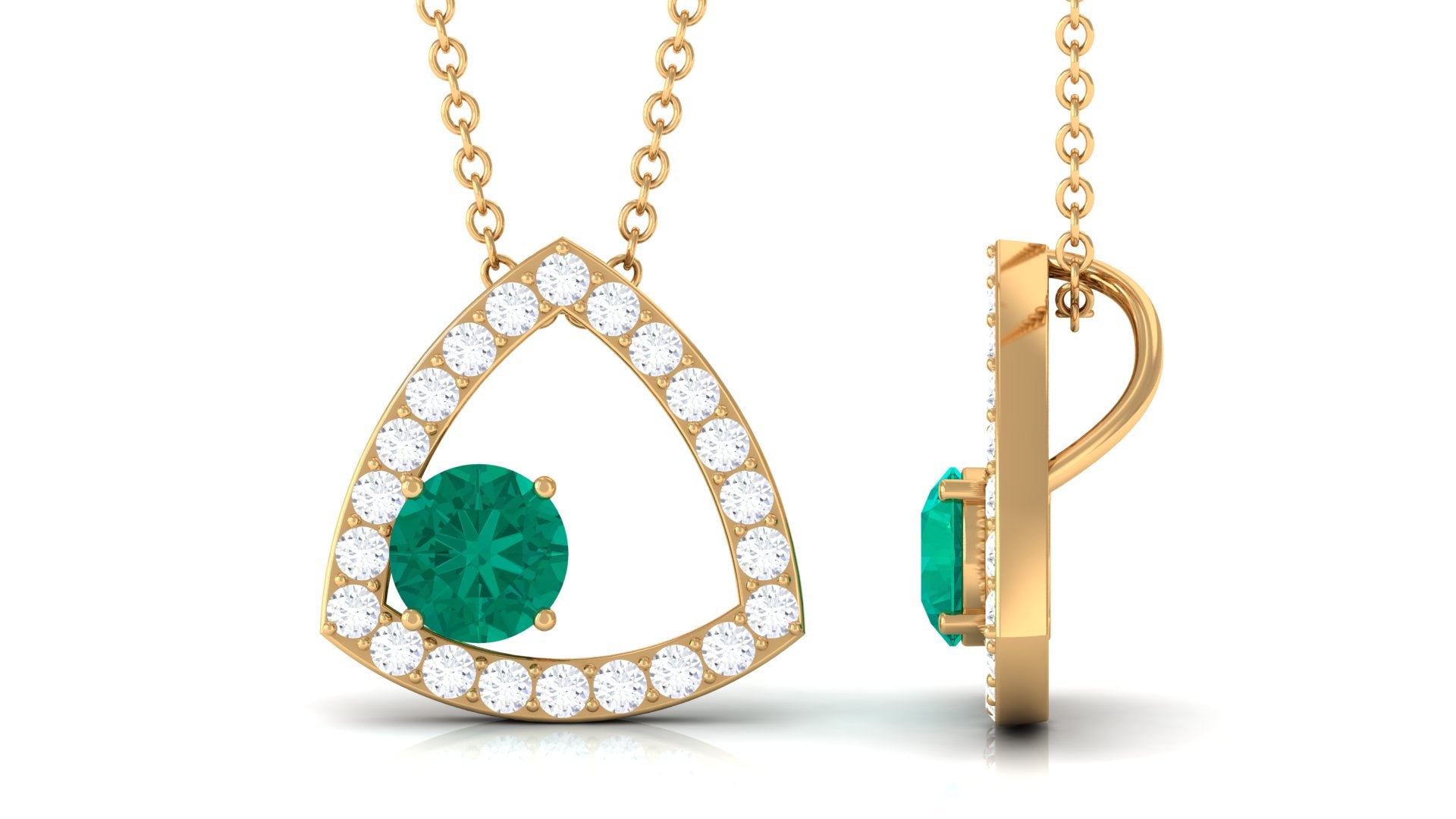 The simple Geometric Pendant Necklace is adorned with Round Shape Emerald while dainty Diamonds studded on a geometric design make it a marvelous choice. Enchant everyones attention with this Unique Pendant. Surprise your favorite person on a special day with this Emerald Pendant Necklace and get that priceless smile on her face.