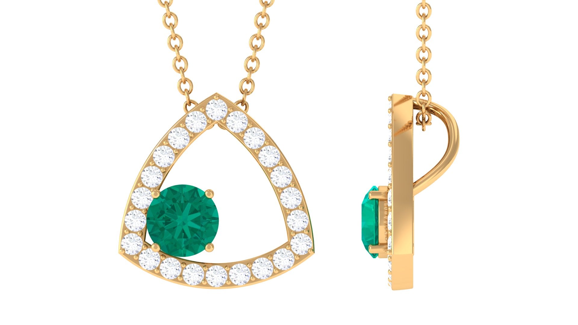 The simple Geometric Pendant Necklace is adorned with Round Shape Emerald while dainty Diamonds studded on a geometric design make it a marvelous choice. Enchant everyones attention with this Unique Pendant. Surprise your favorite person on a special day with this Emerald Pendant Necklace and get that priceless smile on her face.