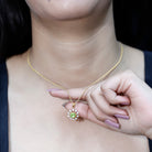 This Peridot Necklace Pendant is designed to carry positive energy, reminding you to move through life with confidence, kindness, and a calm heart. Handcrafted in 14k yellow gold plated silver, the Floral Pendant features a round brilliant cut peridot set securely in a prong setting. The design is surrounded by delicate round lab grown diamonds placed to add just the right touch of sparkle. The Silver Peridot Necklace hangs from a fine cable chain that is both strong and comfortable. It closes with a lobster clasp and offers adjustable length for a perfect fit. As the birthstone for August, peridot has long been seen as a symbol of strength, clarity, and good luck. Whether you are gifting it to someone you love or treating yourself, this August Birthstone Necklace is more than just a beautiful accessory, it is a thoughtful way to mark a birthday, celebrate a fresh start, or simply wear something that feels good. Packaged in a signature jewelry box and paired with a certificate of authenticity, this necklace is ready to gift, wear, and treasure.
