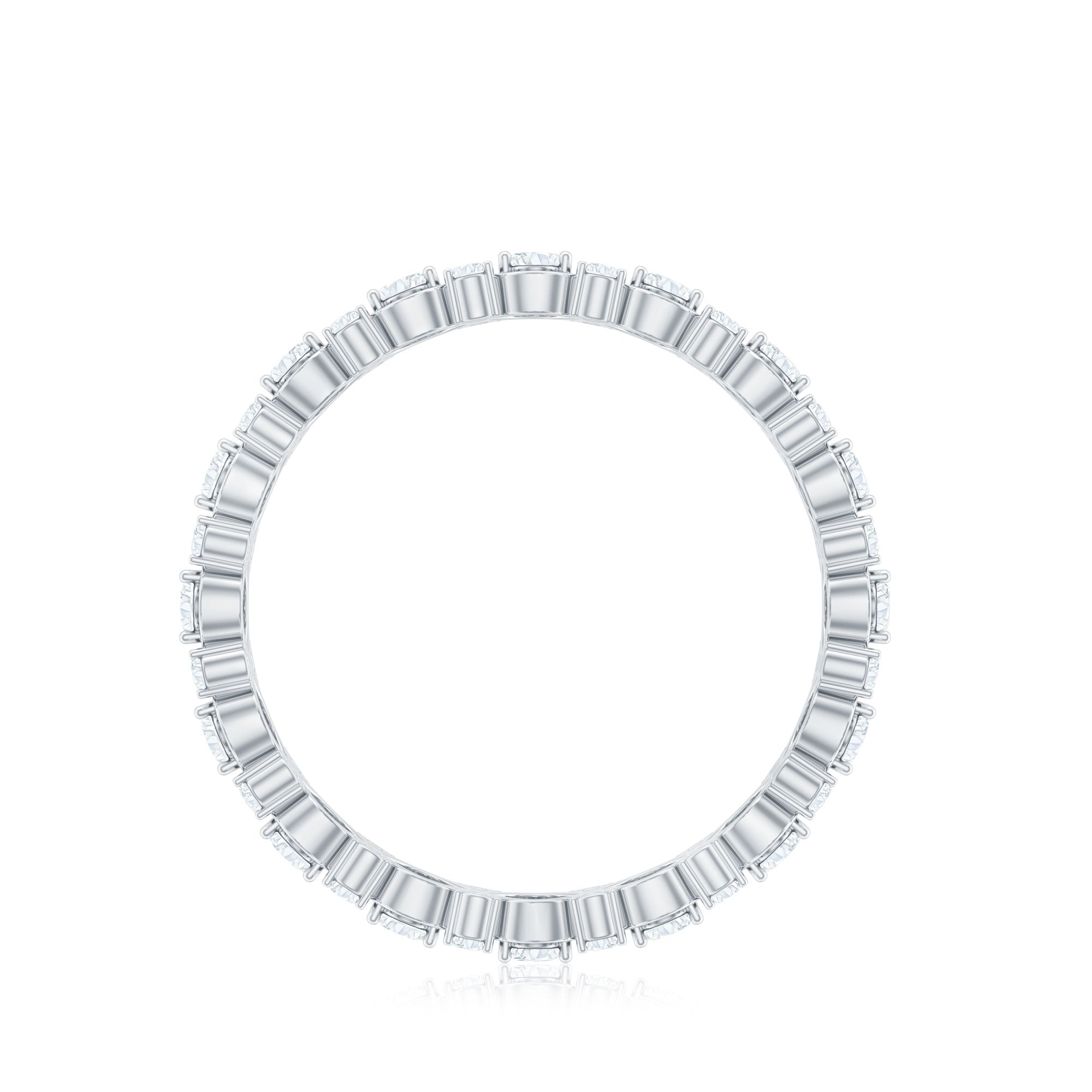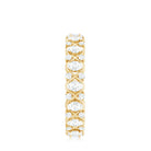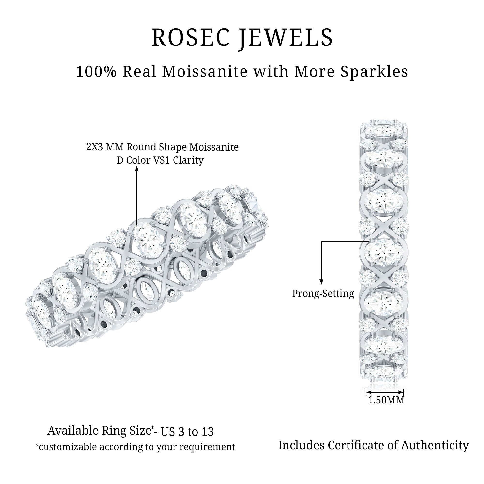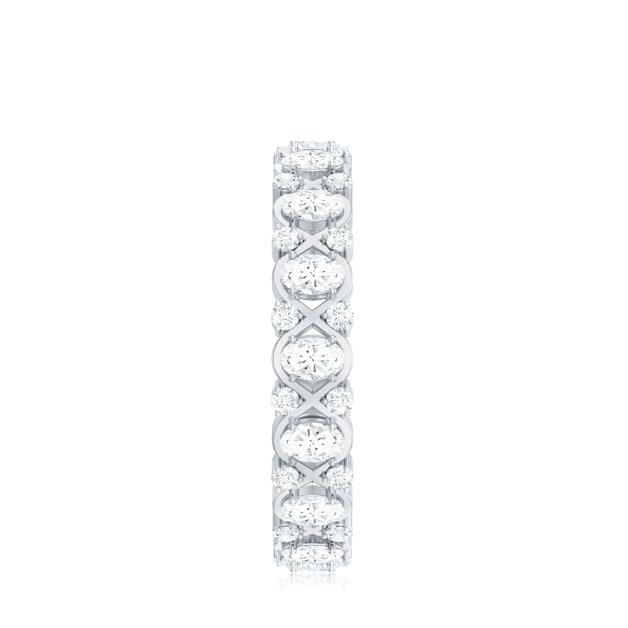 When love feels like forever, there comes this designer Moissanite Eternity Band, a symbol of infinite devotion, elegantly wrapped in a criss cross design. Crafted in high quality metal, this Infinity Wedding Band features alternating round and oval cut moissanite stones, each meticulously selected for its brilliant D color and VS1 clarity. The oval stones sit in the center of criss cross pattern, while the smaller round gems dance between them, adding dimension and extra sparkle. The prong setting secures each moissanite beautifully, allowing maximum light to reflect from every facet, giving this Half Eternity Wedding Band a radiant, fiery glow that wont go unnoticed. As a Half Eternity Band, it delivers all the dazzle with added comfort and flexibility, perfect for everyday wear, while still looking effortlessly luxurious. Stack it with your engagement ring for a fuller bridal look, pair it with other bands for a layered aesthetic, or wear it solo to let its timeless charm shine on its own. Whether gifted for an anniversary, wedding, or on a special moment, this Moissanite Stackable Ring is the kind of piece that turns moments into forever memories.