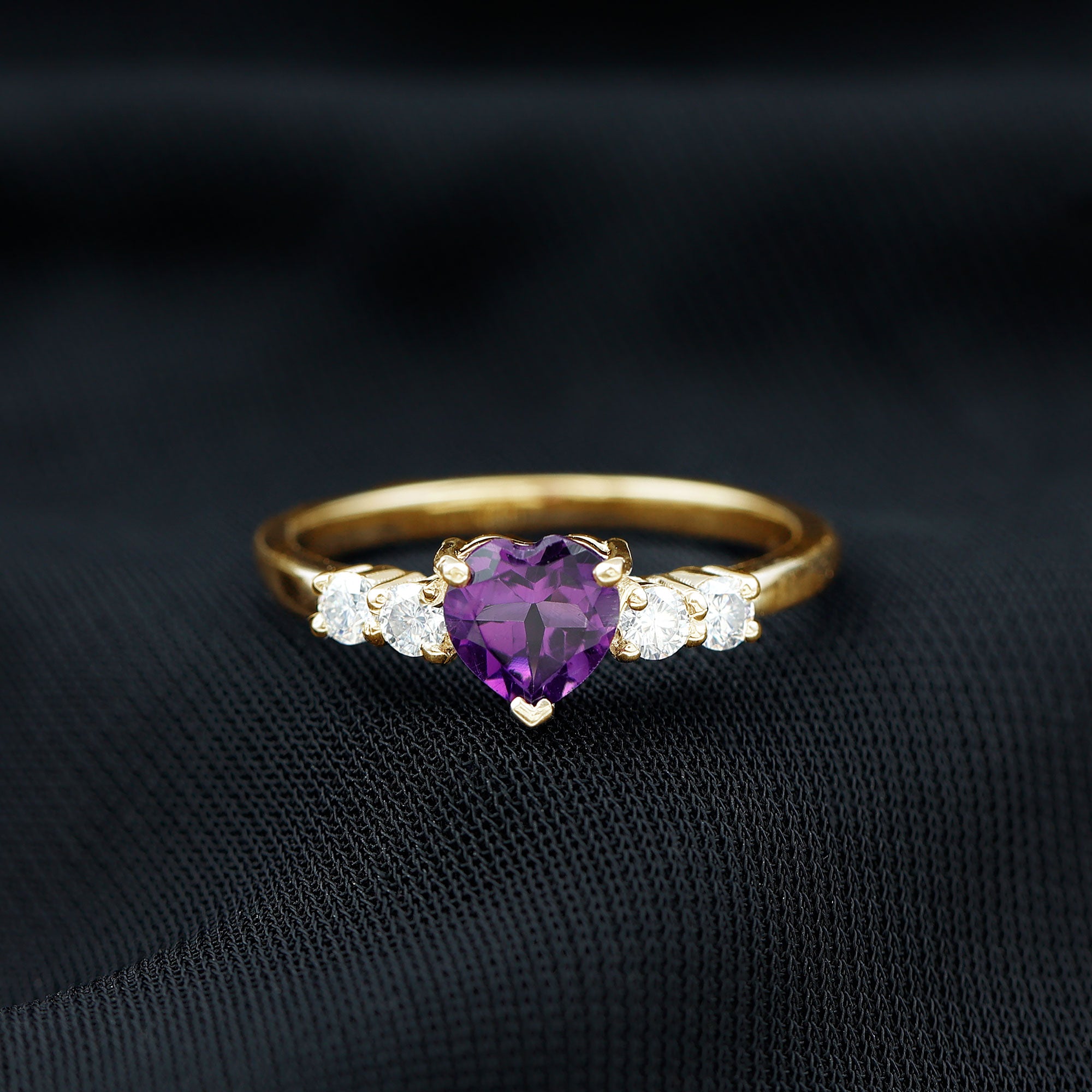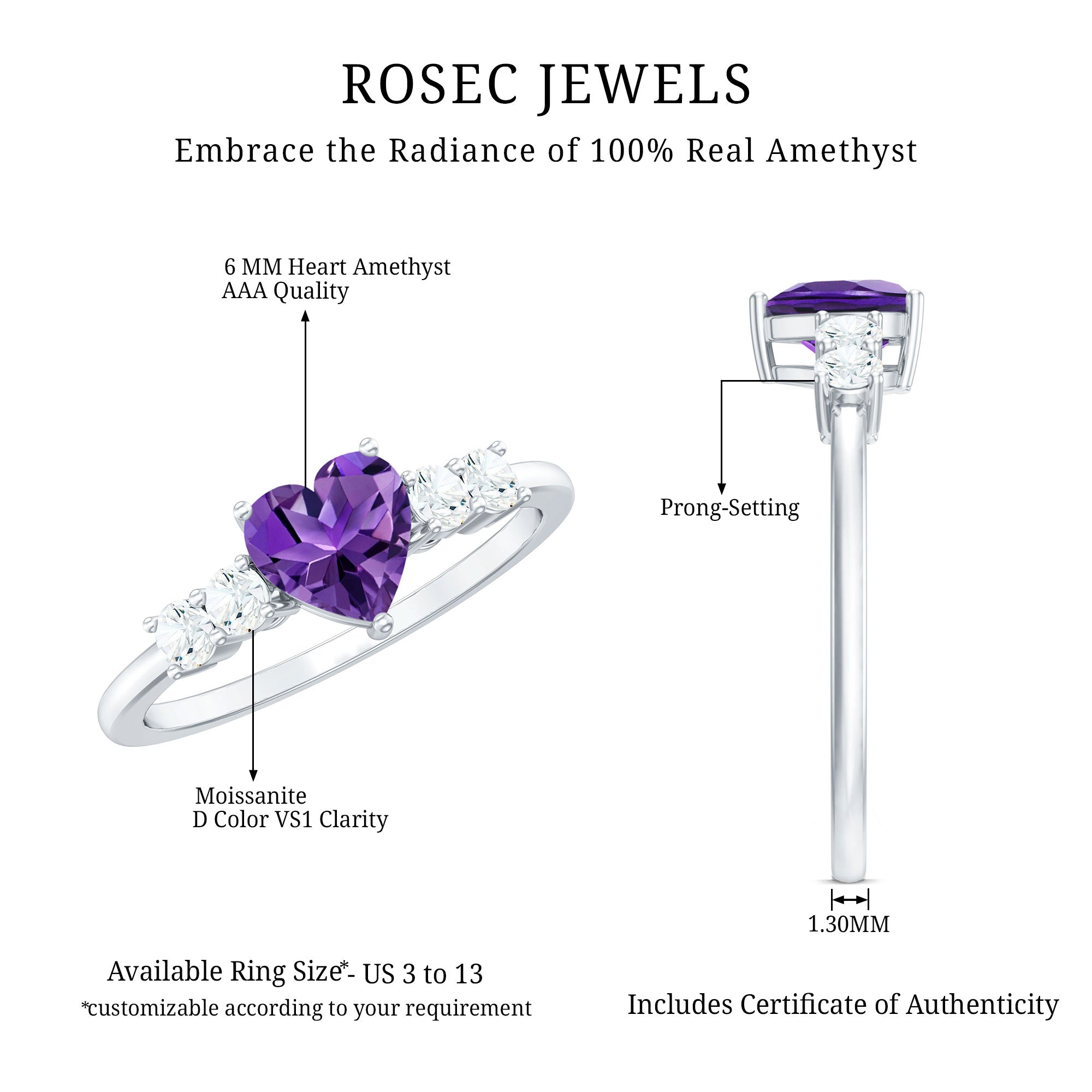 The brilliant sparkle of the Amethyst Promise Ring sweeps across the style adding brilliant Moissanite which is sure to take her breath away. Flanked by the striking Round brilliant cut Moissanite on the sides with the Amethyst as the centerpiece of the attraction. Complement your style that celebrates the perfect romance with a Heart Promise Ring. The center is the 6 MM Heart Shape Amethyst in Prong Setting. Radiate elegance with this Heart Amethyst Ring that represents unconditional love and devotion with timeless beauty and charm. The Heart Shape Amethyst Ring is an eye-catching piece that has an endless meaning and can be worn as promise jewelry, a February birthstone or an engagement ring.