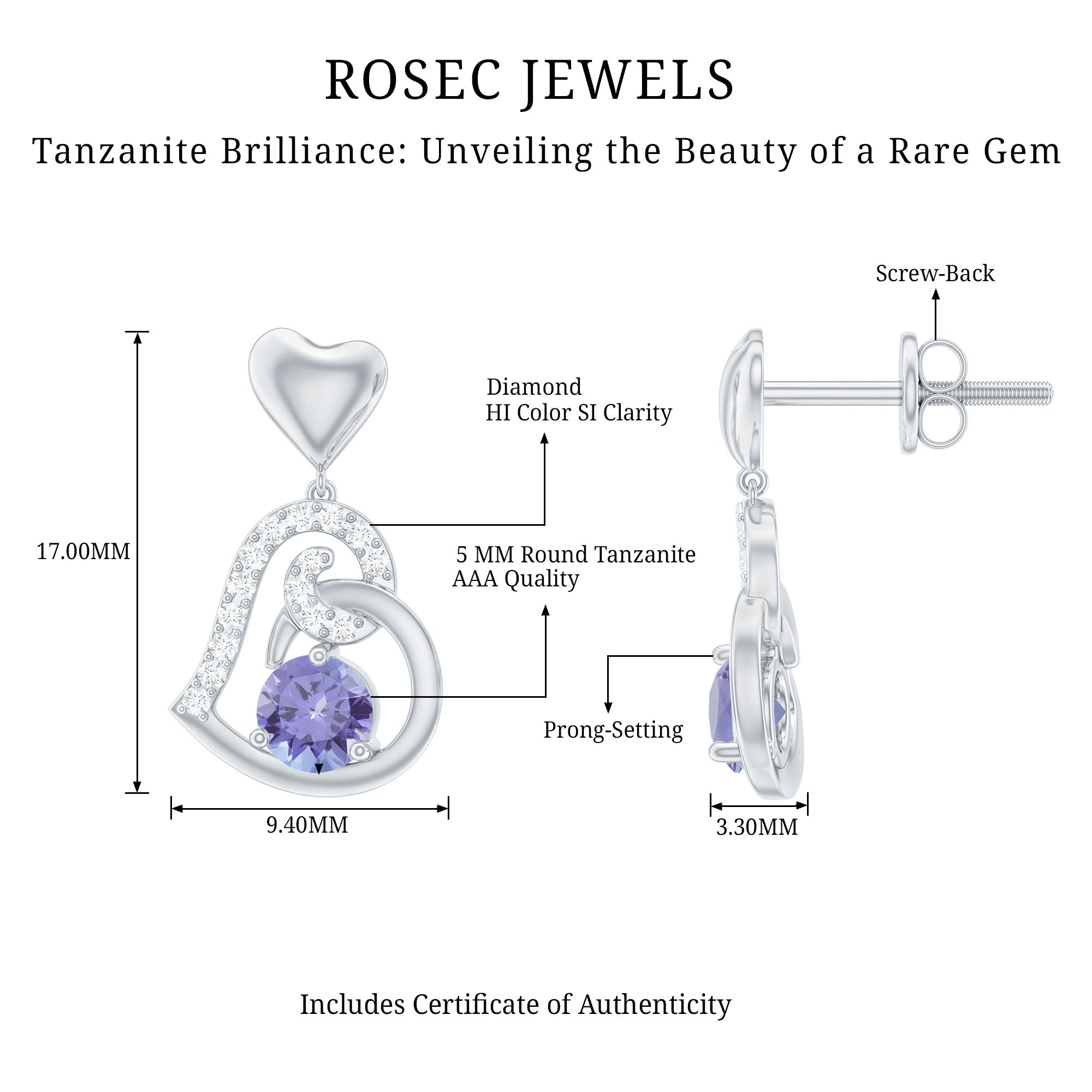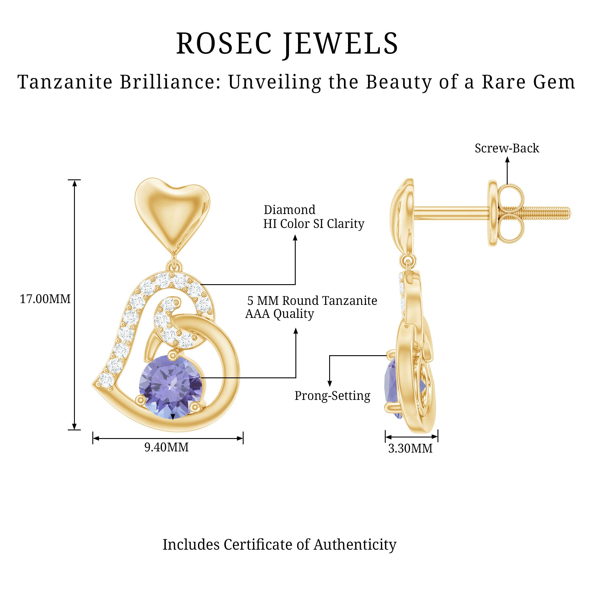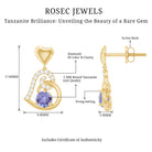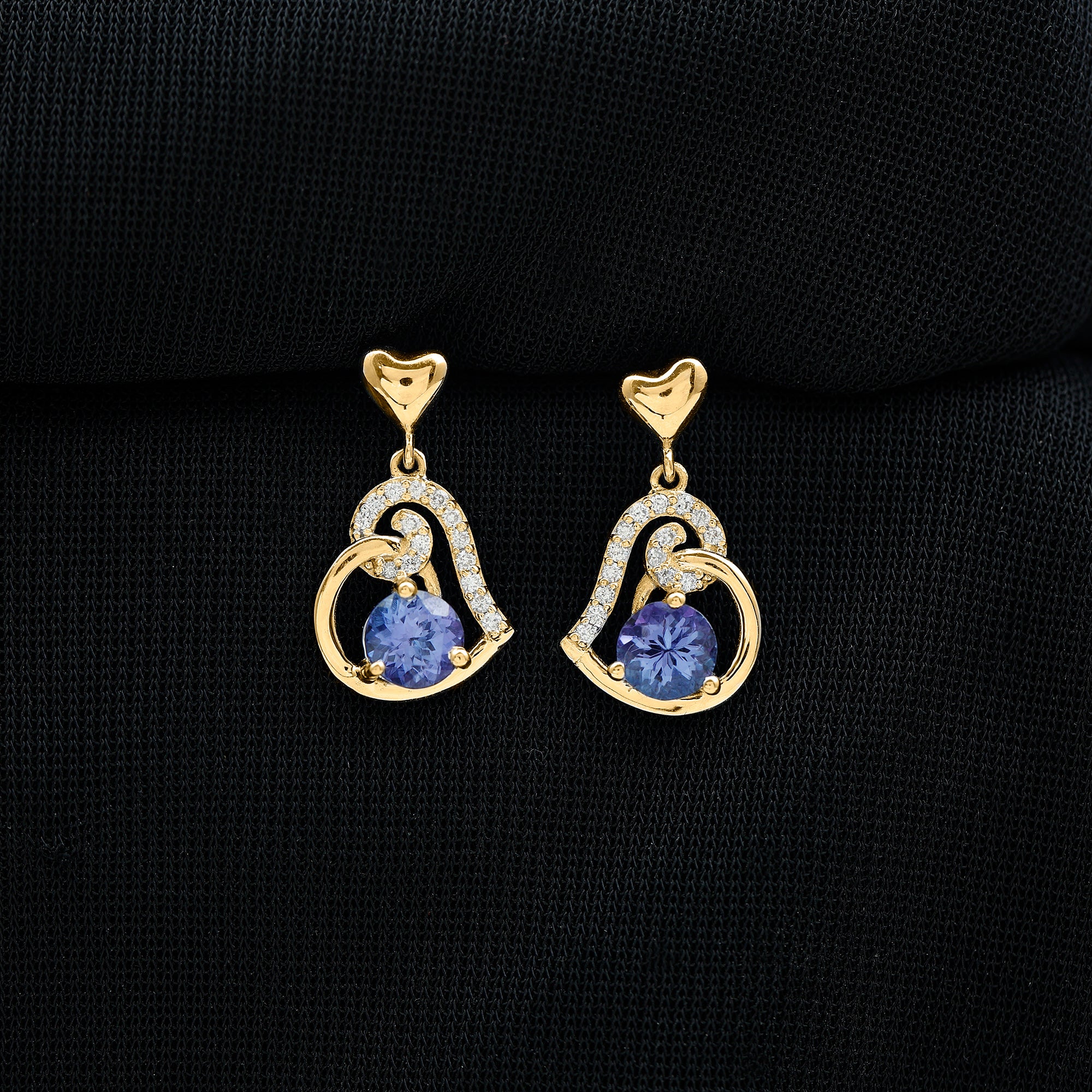 Flaunt your Fashion Style with these Unique Design Heart Drop Earrings. The Drop Earrings are embellished with Round Shape Tanzanite as Center Stone in 3 Prong Setting. Tiny Round Shape Diamond studded Beautifully on Solid Gold crafted Heart in Accent Setting that make it more Attractive.