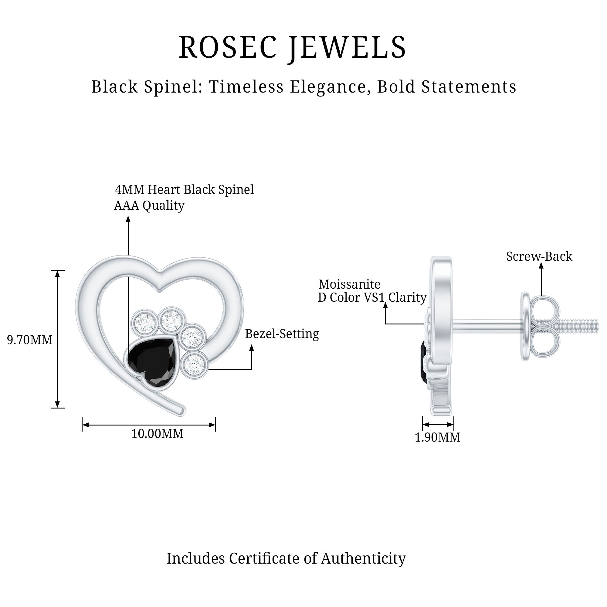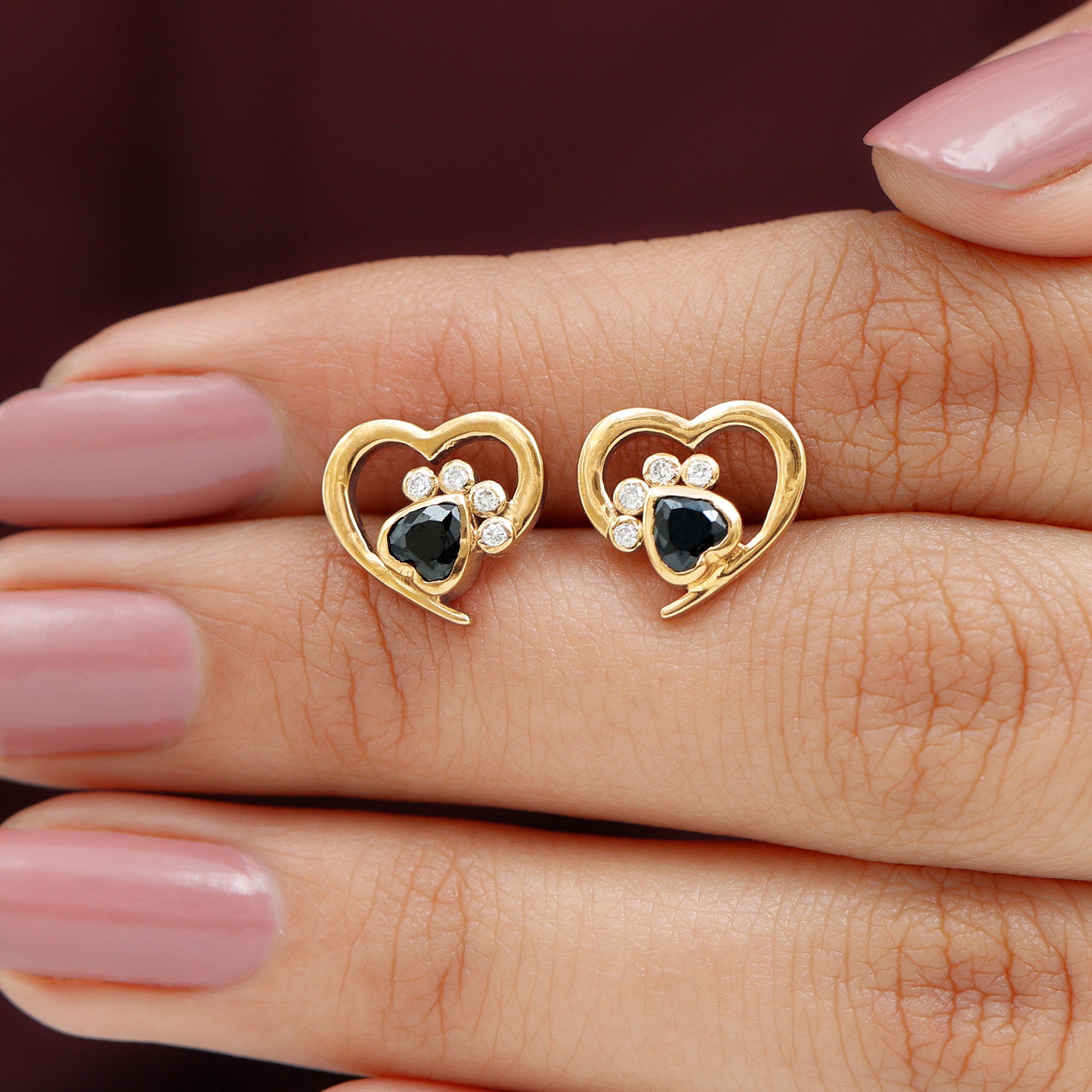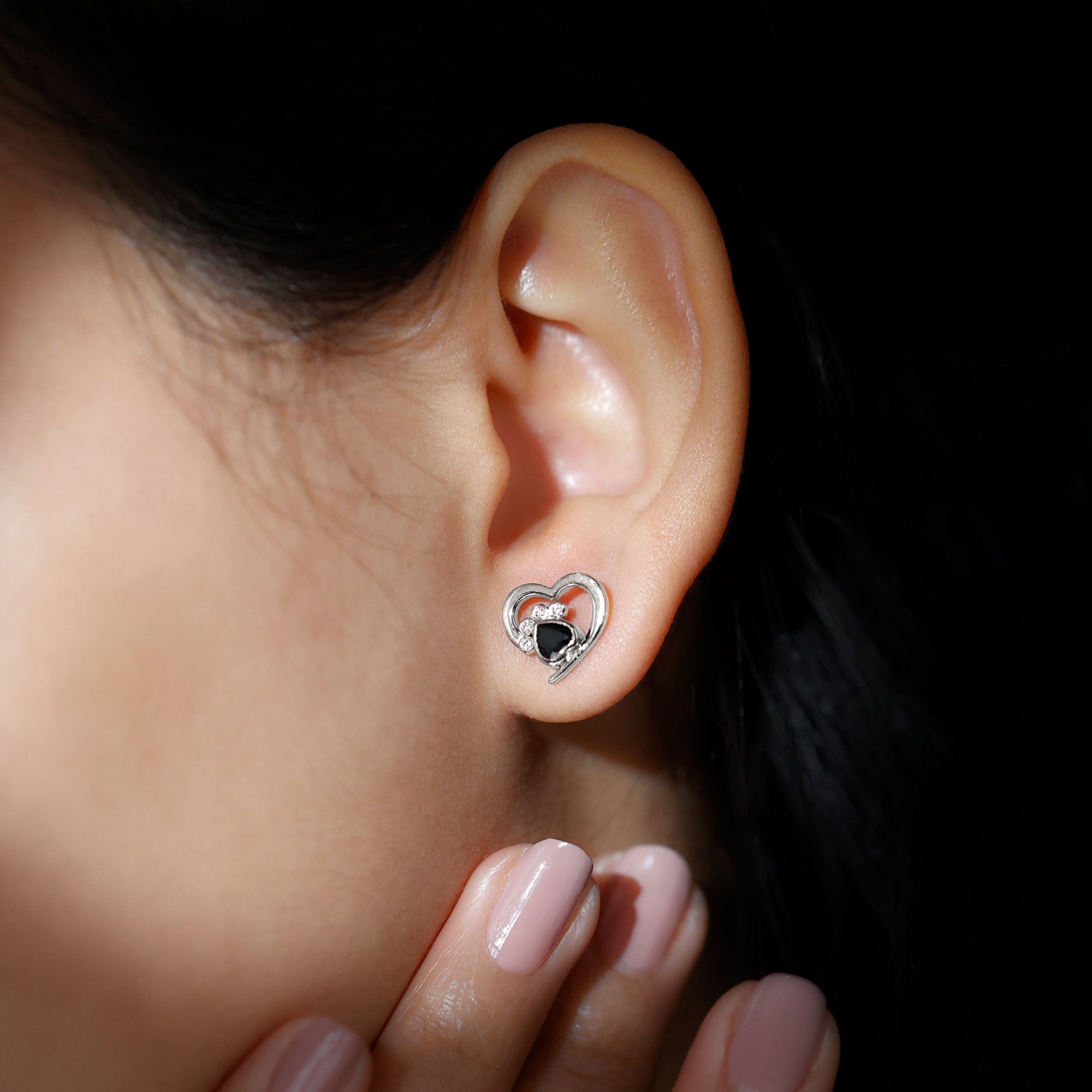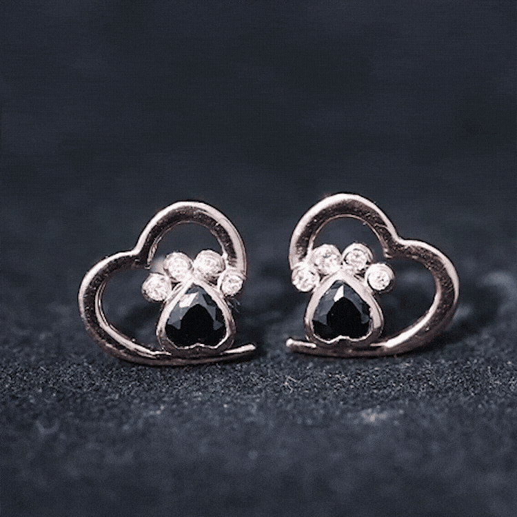Celebrate your love for pets with these adorable Dog Paw Earrings, created to honor the special bond between you and your furry friend. Each earring is designed with a lovely open heart shape that symbolizes love, care, and loyalty. Inside the heart, a charming paw print is formed using heart shaped Black Spinel stones of AAA quality and small moissanite stones (D-VS1 quality). Their bright shine beautifully contrasts with the dark Black Spinel, helping the paw print stand out while keeping the look elegant and playful. The combination of these stones creates a balanced design that feels both stylish and full of personality. Perfect for pet lovers, these Dog Paw Stud Earrings are a wonderful way to express affection and connection. They feature secure screw back closures, ensuring a comfortable and reliable fit for all-day wear. Easy to style with casual or dressy outfits, these Black Spinel Earrings add a heartfelt and fashionable touch to any jewelry collection.