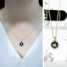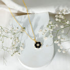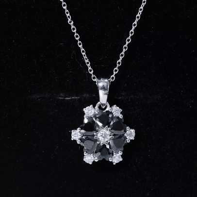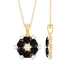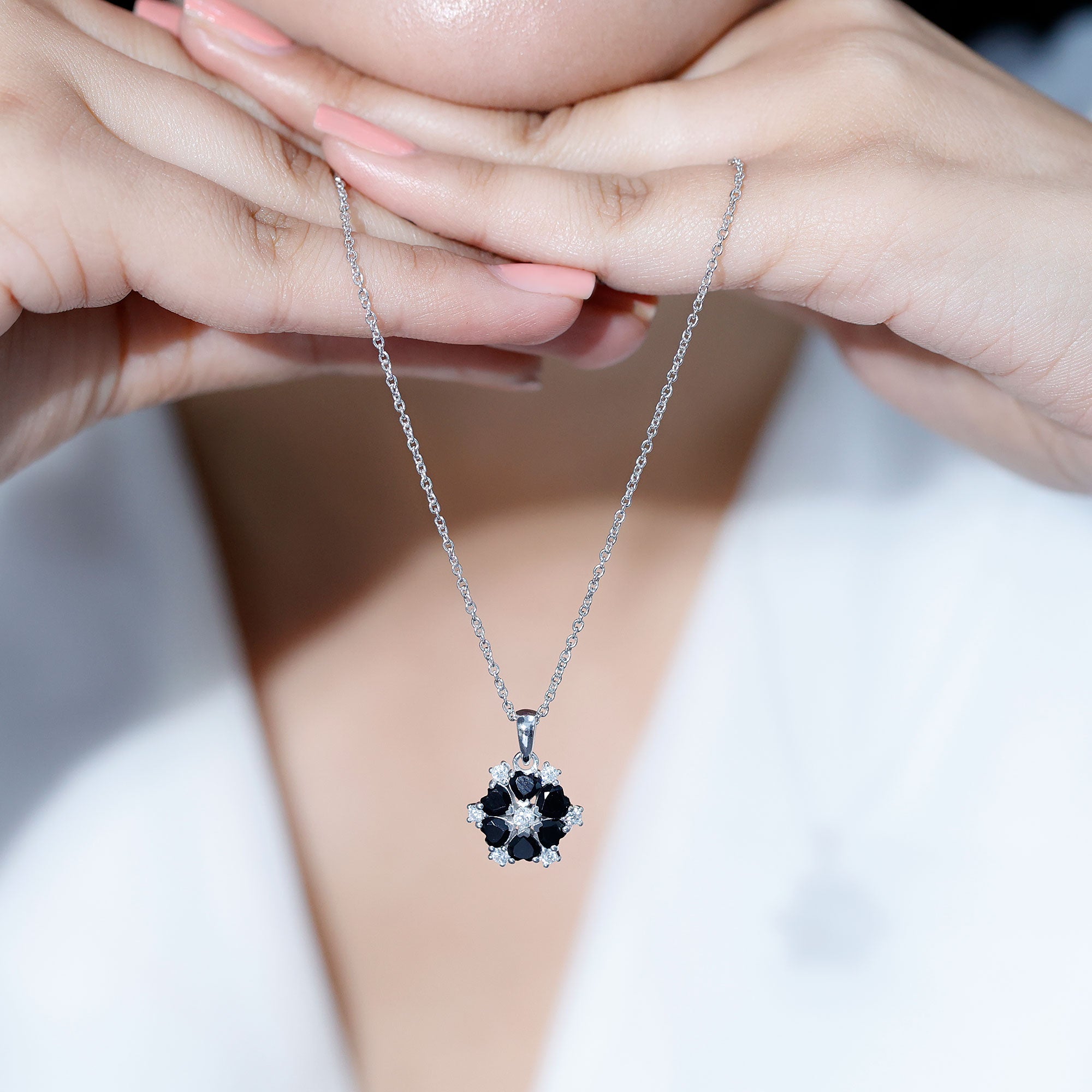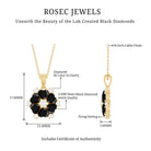 These exquisite Heart-Shaped Created Black Diamond Gemstones are set in a Prong Setting and surrounded by a delicate Diamond Flower Pendant that exudes sheer elegance. The Created Black Diamond Floral Pendant Necklace is a versatile piece worn as an everyday accessory or as office wear jewelry. With a total weight of 2.75 Carats and AAAA Clarity, this pendant symbolizes refinement and beauty.