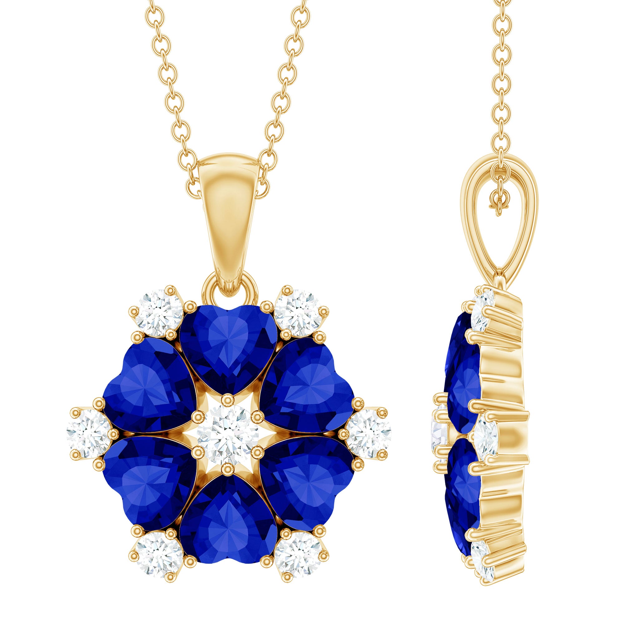 These exquisite Heart-Shaped Created Blue Sapphire Gemstones are set in a Prong Setting and surrounded by a delicate Diamond Flower Pendant that exudes sheer elegance. The Created Blue Sapphire Floral Pendant Necklace is a versatile piece worn as an everyday accessory or as office wear jewelry. With a total weight of 2.50 Carats and AAAA Clarity, this pendant symbolizes refinement and beauty.