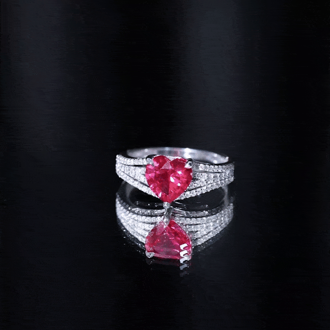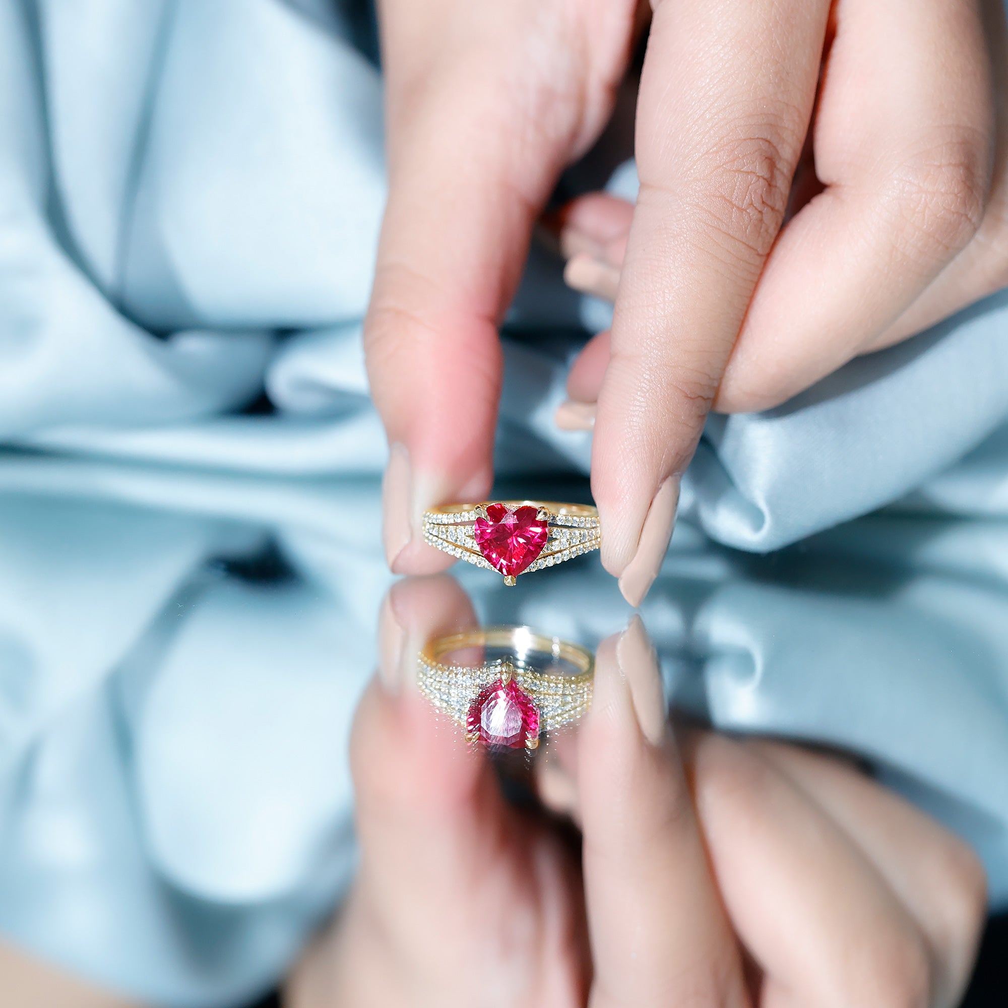 The Engagement Ring is embellished with a sparkling Heart Shape Lab Created Ruby secured in Claw Setting while Round Shape Diamond studded on the split shank. The Created Ruby Ring is fashioned in Solid Metal that will enhance her overall look. It makes a perfect anniversary ring for her, something she would adore for her whole life.