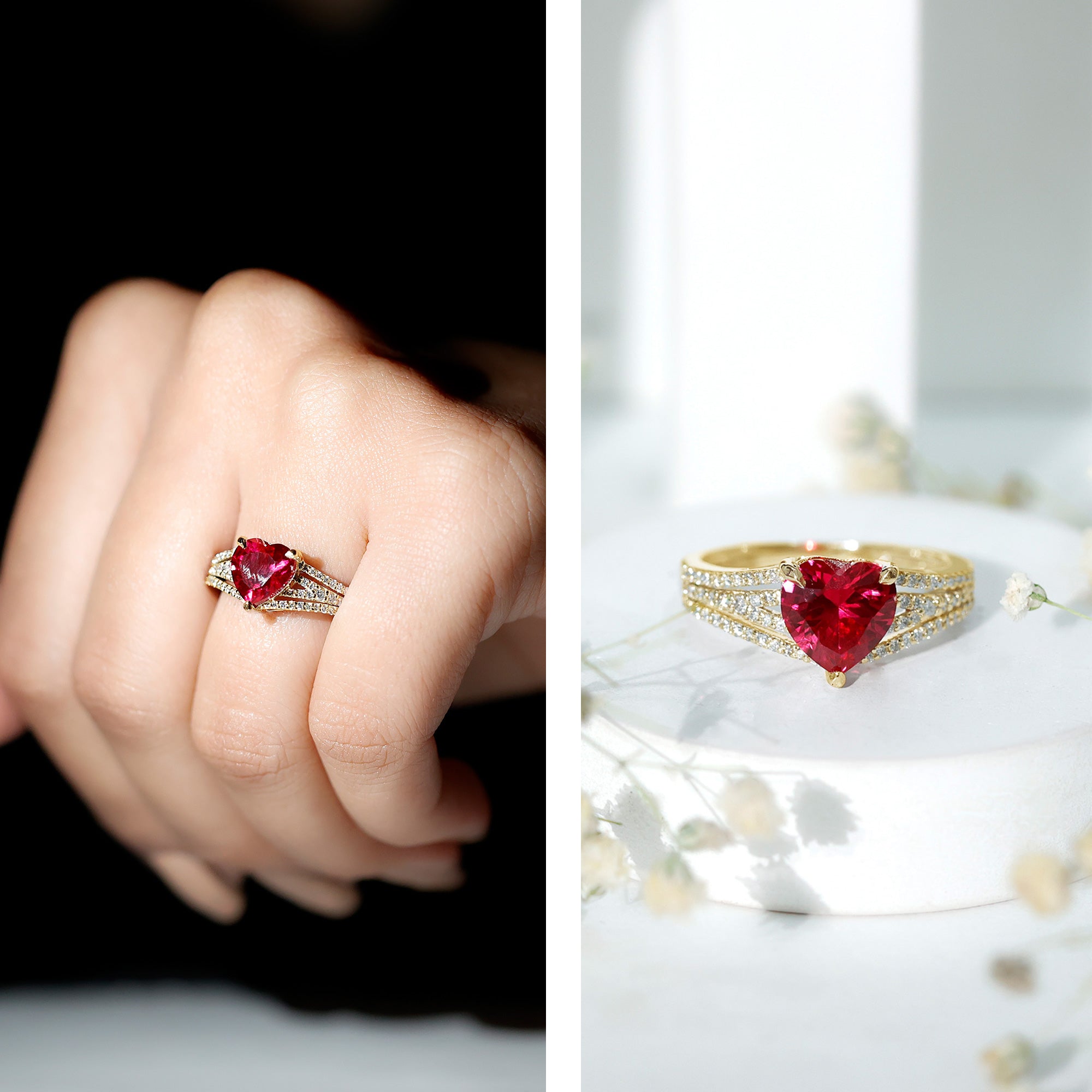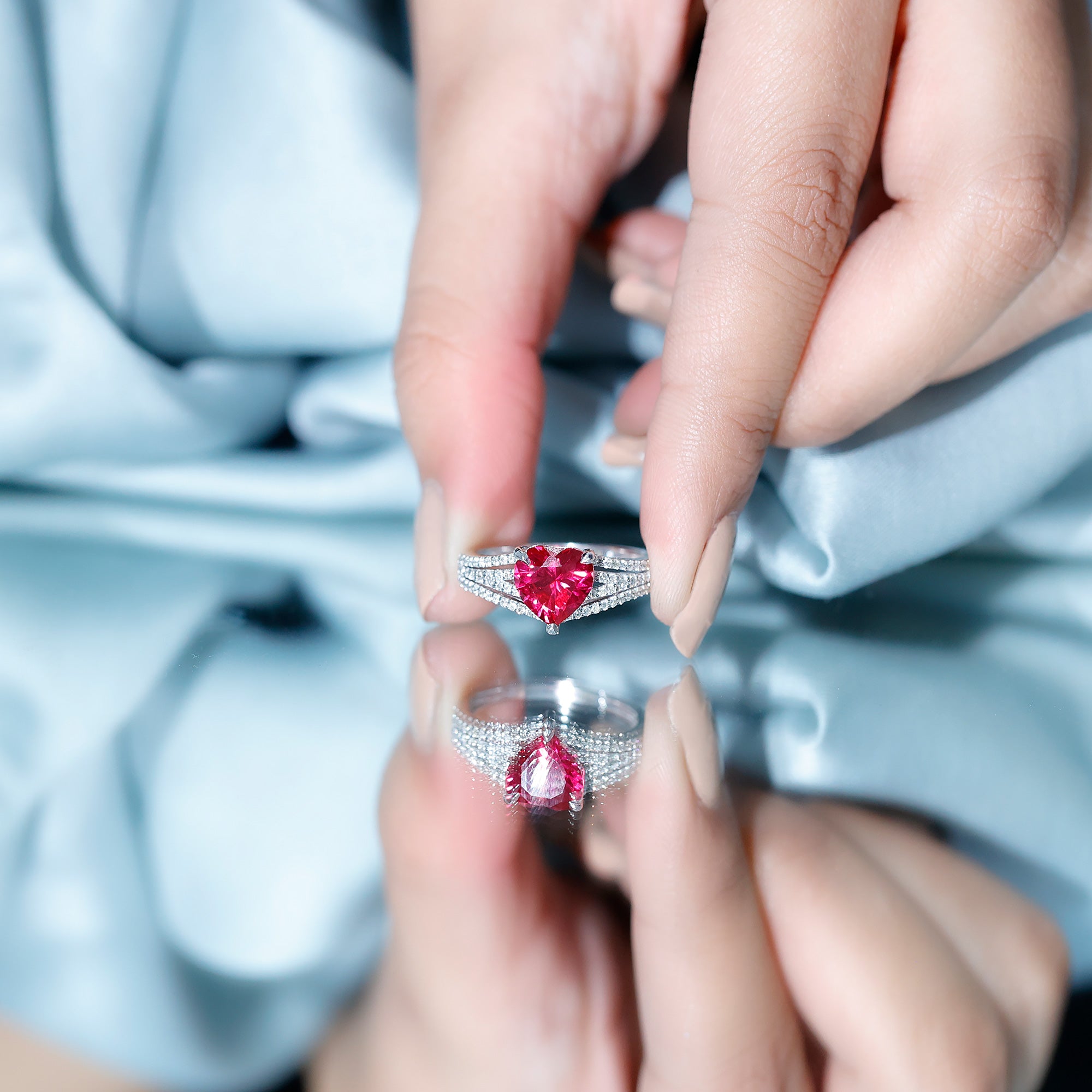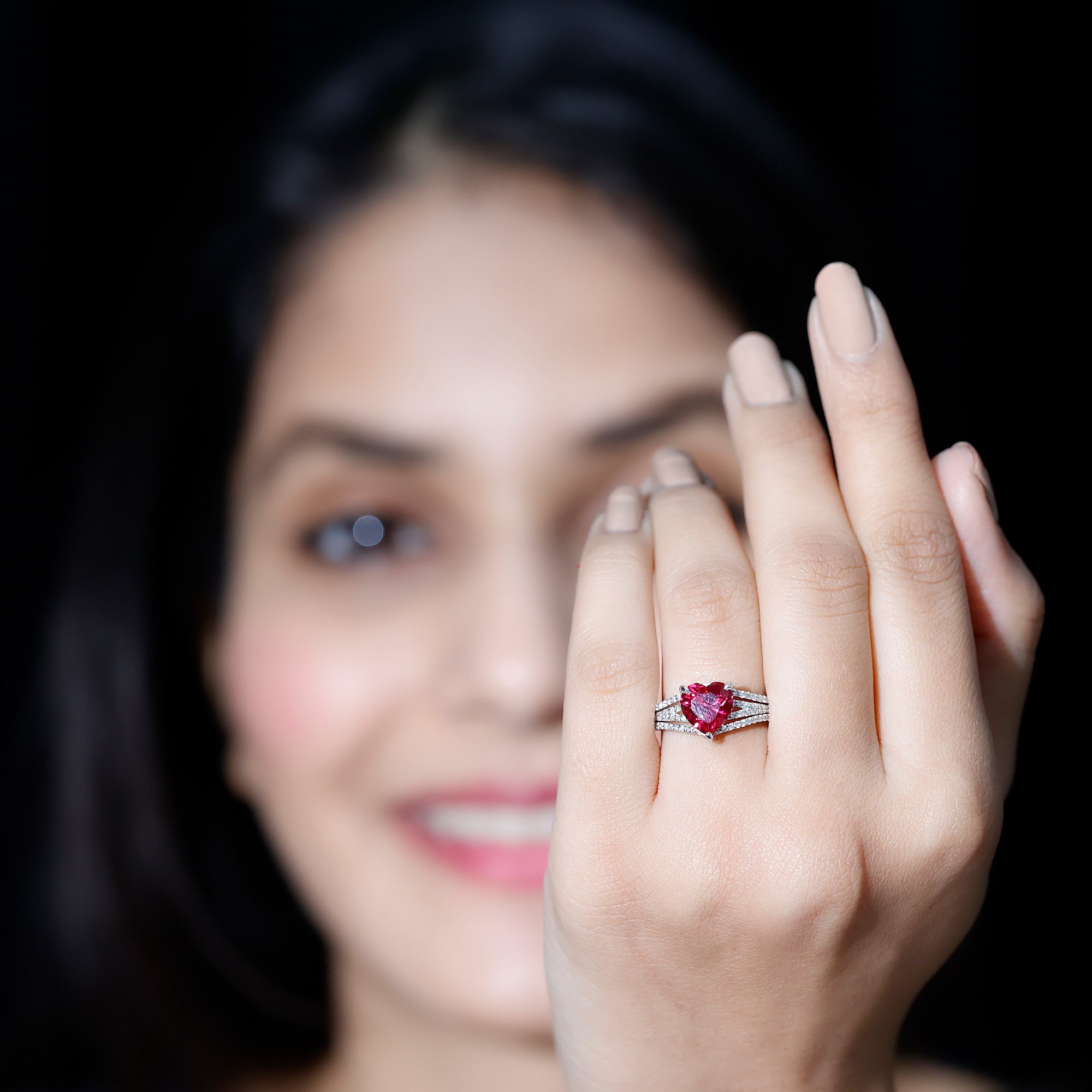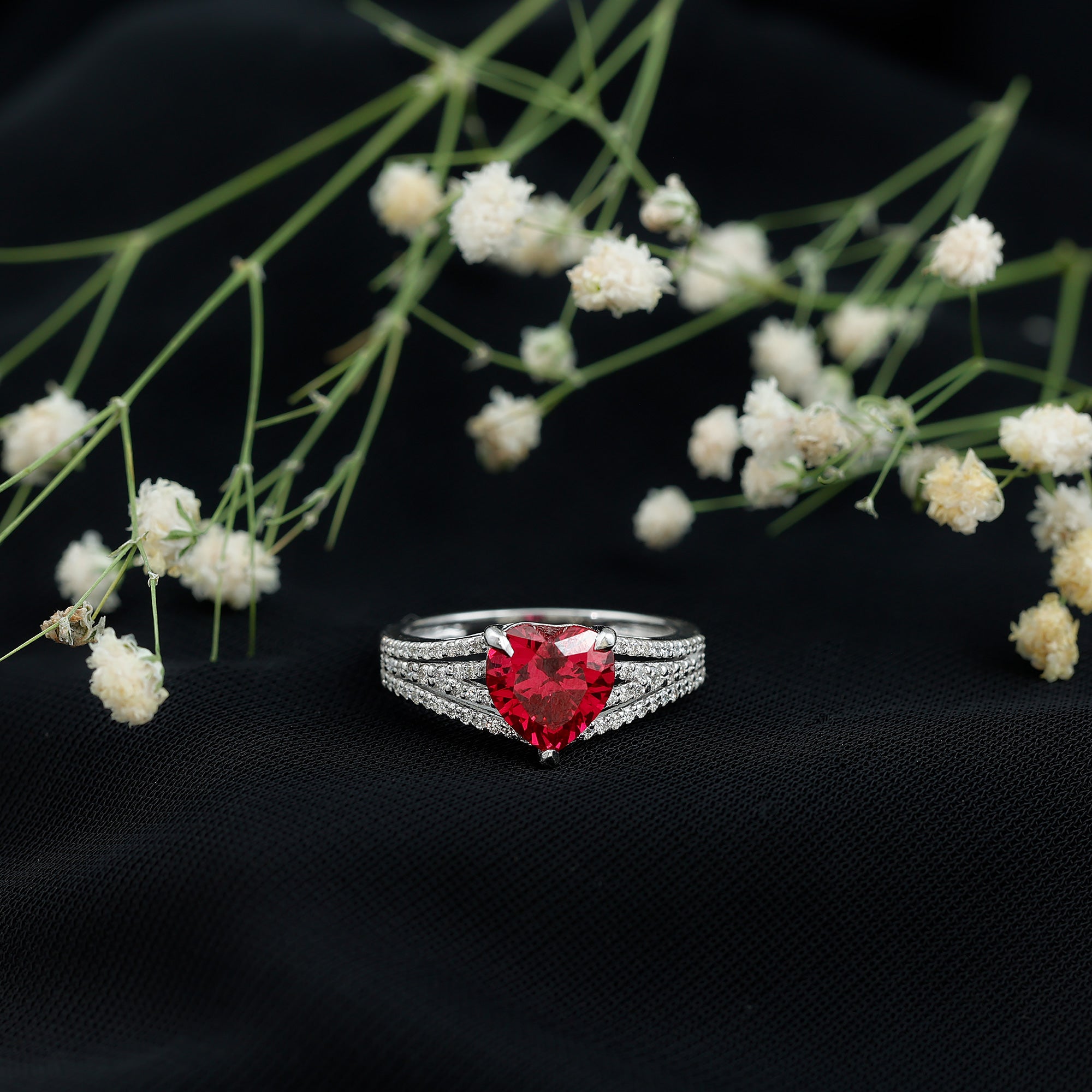 Heart Shape Created Ruby Engagement Ring with Diamond