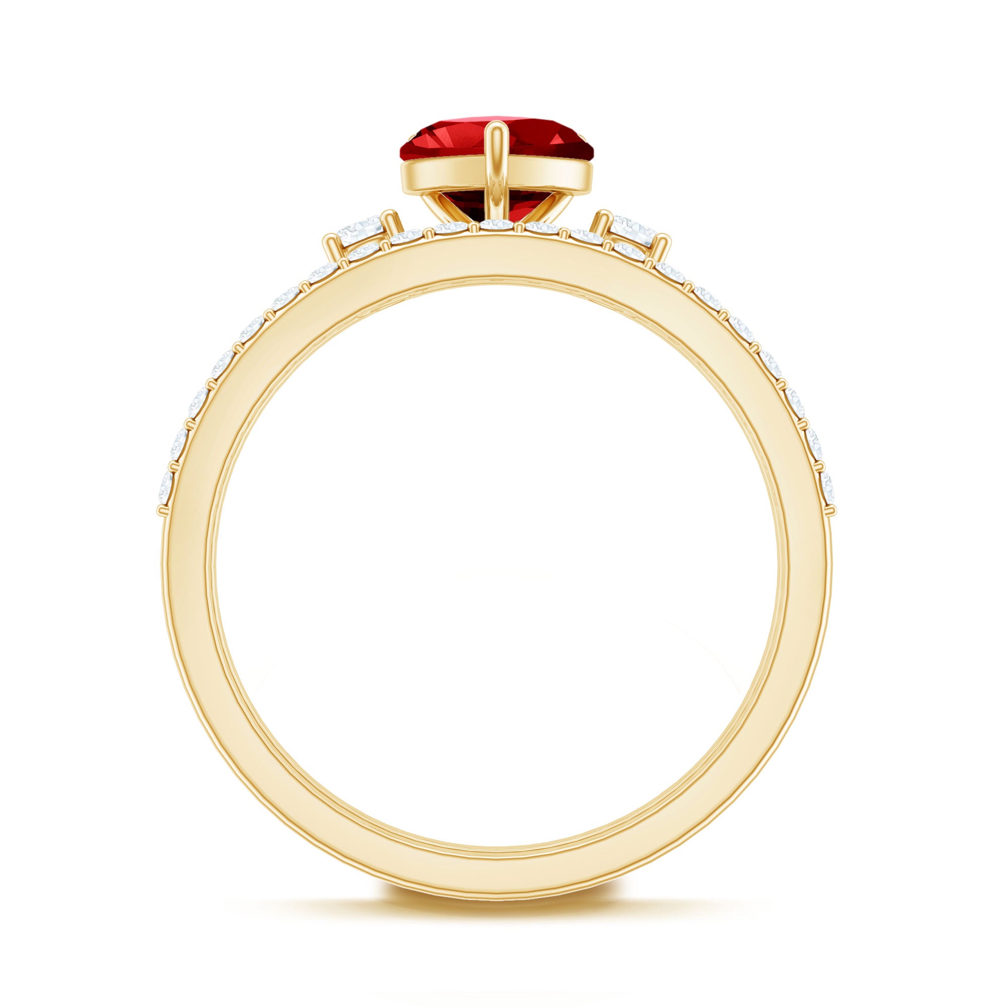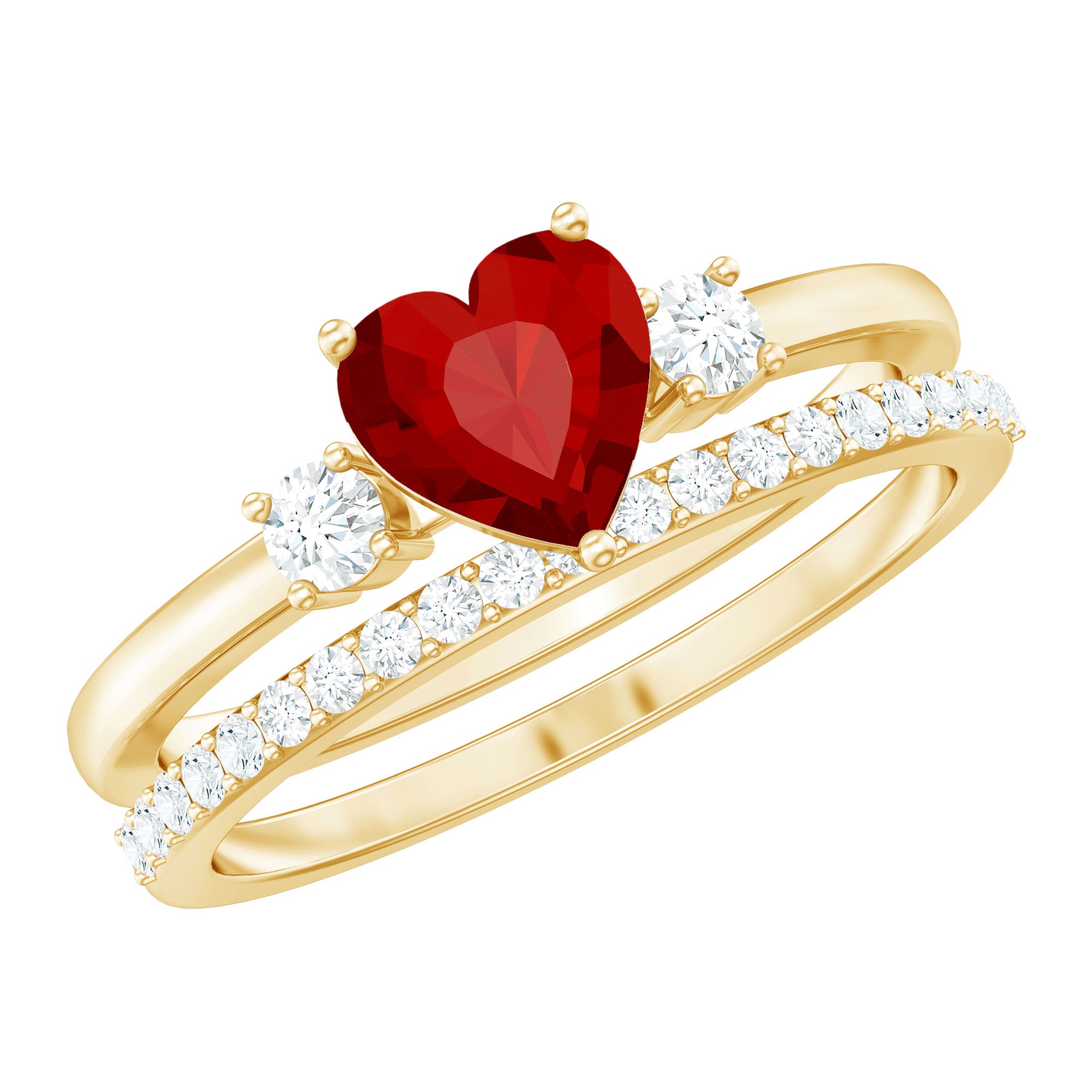 Be the center of attention with these delightful Heart Ring Set. It featured with Heart Shape Created Ruby in Prong Setting and Round Shape Diamond. This Solitaire Enhancer Ring Set is beautifully composed in Solid Gold. The solitaire ring set is perfect for special occasions such as Valentines Day, anniversary, or a gift for a loved one. The Created Ruby ring is a great way to add a touch of luxury to your everyday look. The combination of Created Ruby and Diamond stones gives it a touch of elegance and uniqueness.