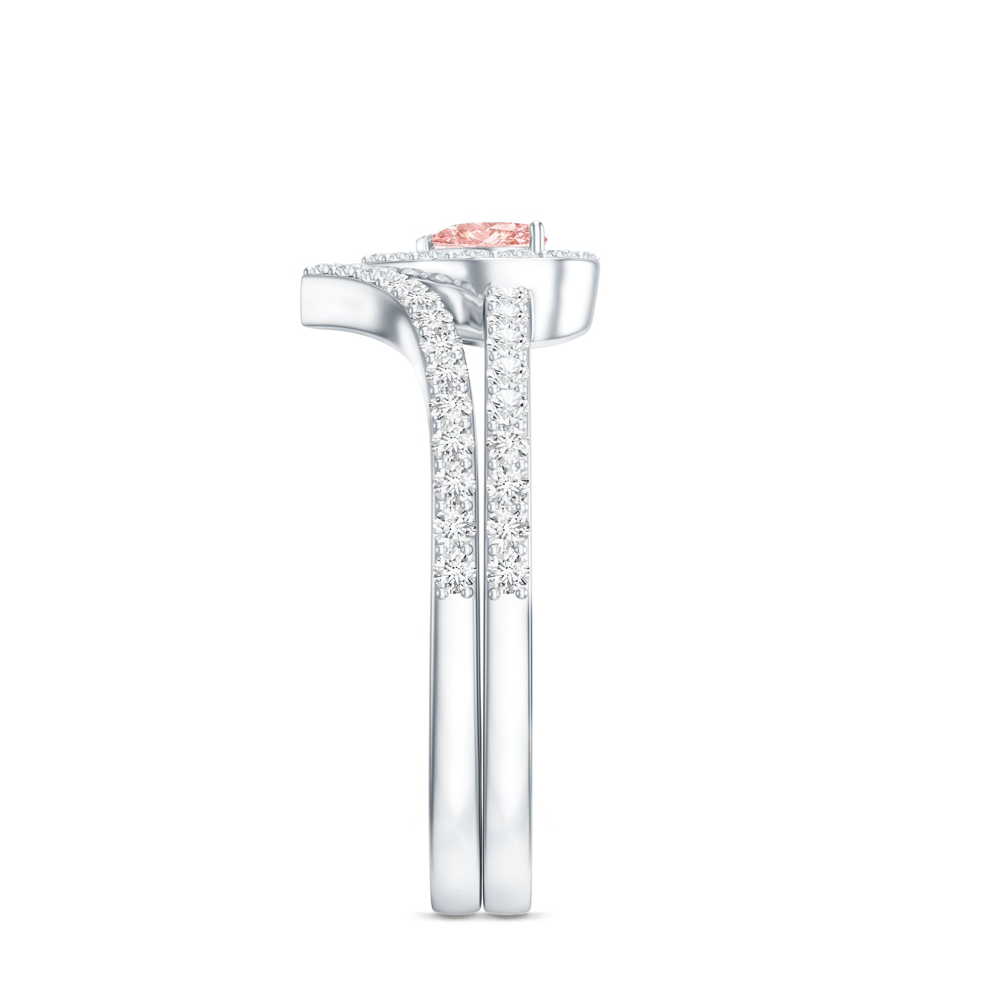 Celebrate your forever with a ring set that feels as special as your love story. This Pink Diamond Wedding Ring Set is thoughtfully designed to bring romance, sparkle, and meaning together in one beautiful piece. Made to be worn and treasured every day, it reflects both elegance and emotion in a timeless way. At the center of the engagement ring is a 6 MM heart shaped lab grown pink diamond. Its fancy pink color represents love, care, and devotion, making it a perfect symbol of your bond. The center stone is VVS quality, offering exceptional clarity and brilliance. Surrounding it is a glowing halo of round brilliant cut lab grown white diamonds of EF-VS quality, adding extra shine and drawing attention to the heart shaped design. The shank is accented with side diamonds that bring added sparkle from every angle. Paired with it is a matching chevron wedding band, set with round brilliant cut lab grown white diamonds. The band fits neatly against the engagement ring, creating a seamless look when worn together. Each stone is carefully set for comfort, beauty, and long-lasting wear. Crafted with lab grown diamonds, this Heart Bridal Ring Set is both ethical and stunning. Designed to mark a lifelong promise, this Engagement Ring with Wedding Band is a lasting reminder of love, unity, and shared moments that grow more meaningful with time.
