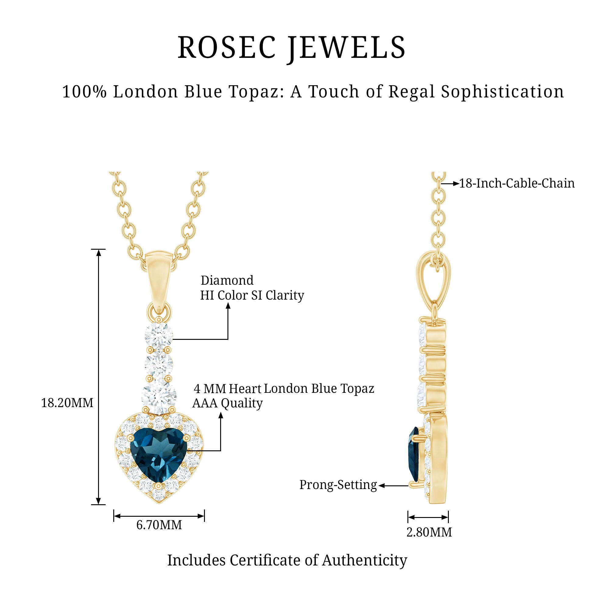 This stunning drop pendant features a brilliant heart shape London Blue Topaz gemstone surrounded by a Diamond halo, elegantly suspended from a delicate Diamond-studded bail. The vibrant hue of the London Blue Topaz contrasts beautifully with the sparkling Diamond stones, creating a piece that exudes sophistication and charm. Perfect for any occasion, this London Blue Topaz heart pendant is sure to become a cherished addition to any jewelry collection.