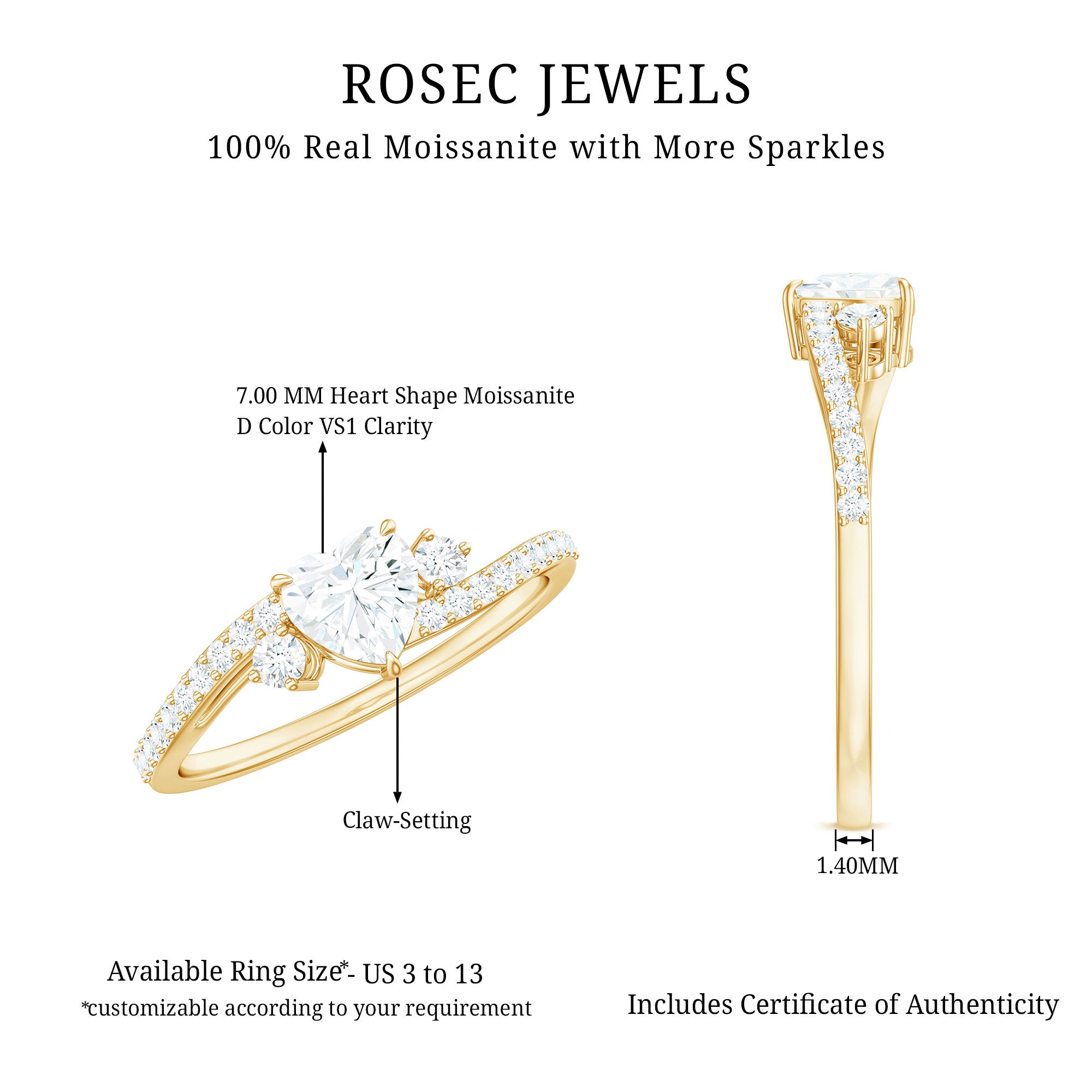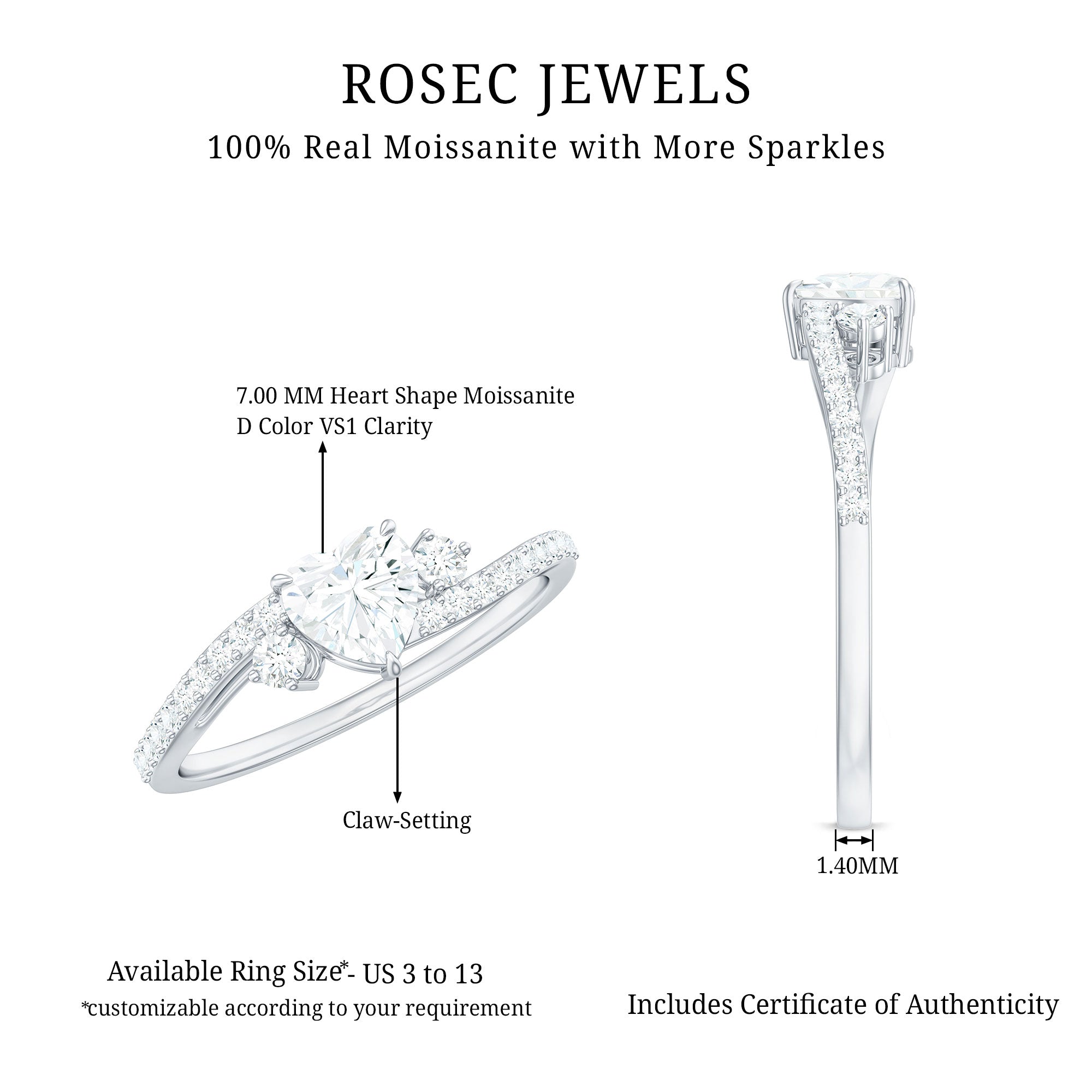Win her heart with the elegant allure of this Heart Shaped Moissanite Ring, crafted to shine with its contemporary appeal and everlasting brilliance. At its core lies a stunning 7 MM heart shaped moissanite, securely fastened by delicate prongs to capture every ray of light and radiate beautifully. The bypass band gracefully wraps around the central stone, forming a flowing, romantic shape that represents two journeys merging into one. Tiny round moissanites twinkle along the band, providing a gentle shimmer that enhances the center stones brilliance. With D color and VS1 clarity, the moissanite emits pure light, making this Heart Engagement Ring an exquisite option for proposals, weddings, anniversaries, or any special occasion worth celebrating. The bypass design not only adds a unique flair to the traditional solitaire but also improves comfort, making it ideal for everyday wear. Its lightweight yet striking design is perfect for someone who appreciates understated luxury with a hint of personality. This Bypass Engagement Ring is elegantly presented in a keepsake jewelry box, ready to be gifted or cherished for yourself. It transcends being just a 1.5 Carat Moissanite Ring, it embodies your story, wrapped in sparkle.